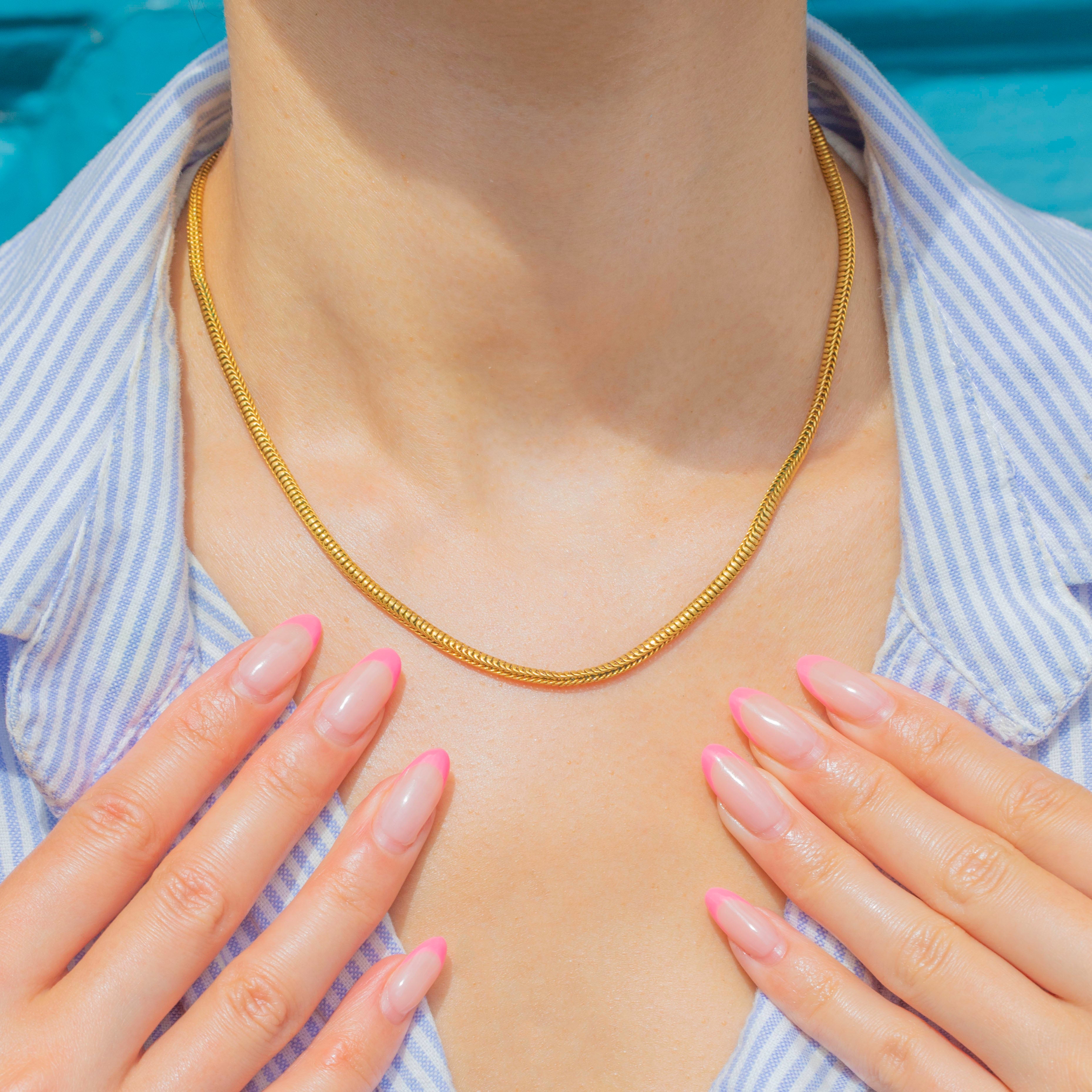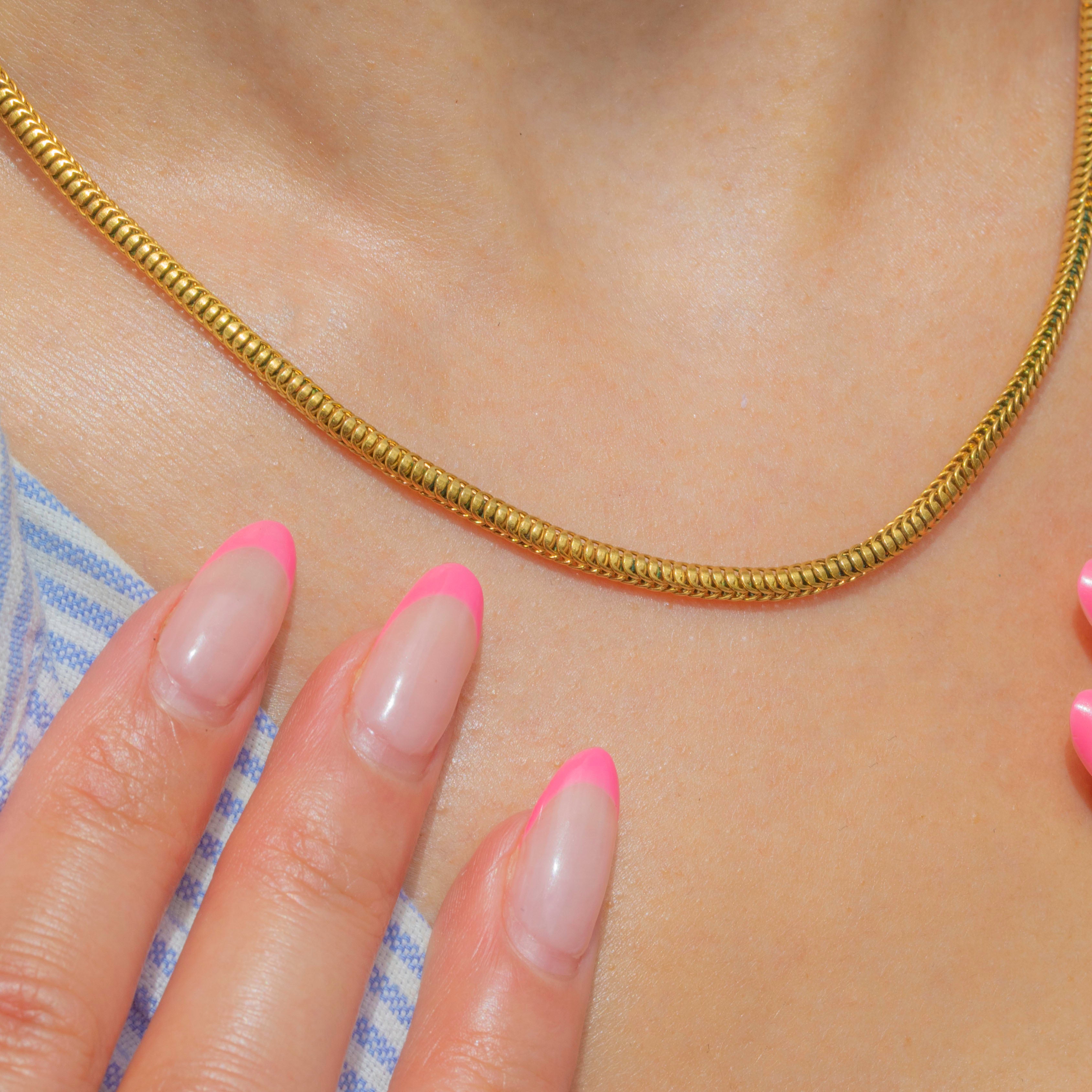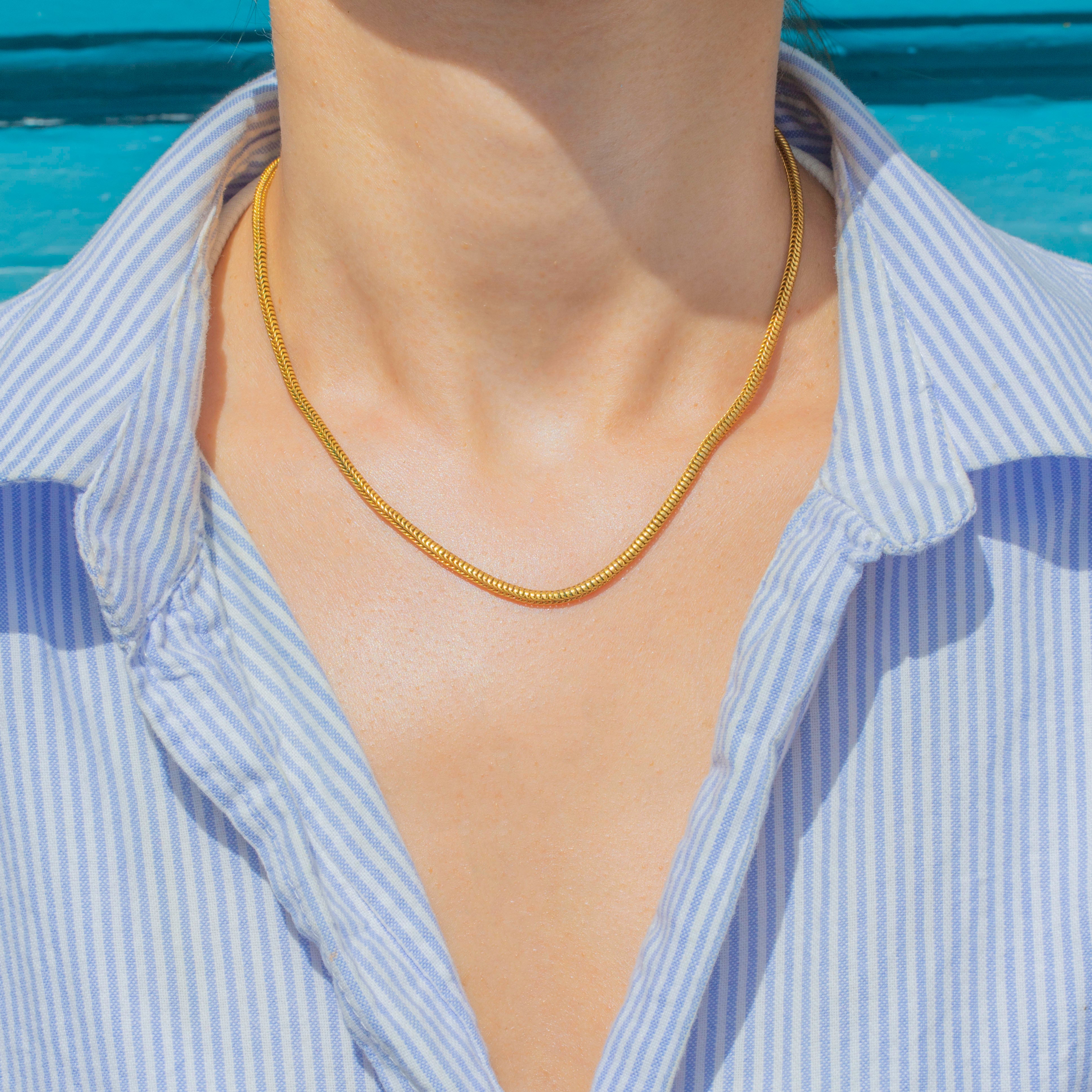 The slinky 15.5" chain has a delicious buttercup yellow hue, with its beautifully formed snake links providing a lovely texture that will send Golden glimmers cascading across your collarbones as they catch the light.