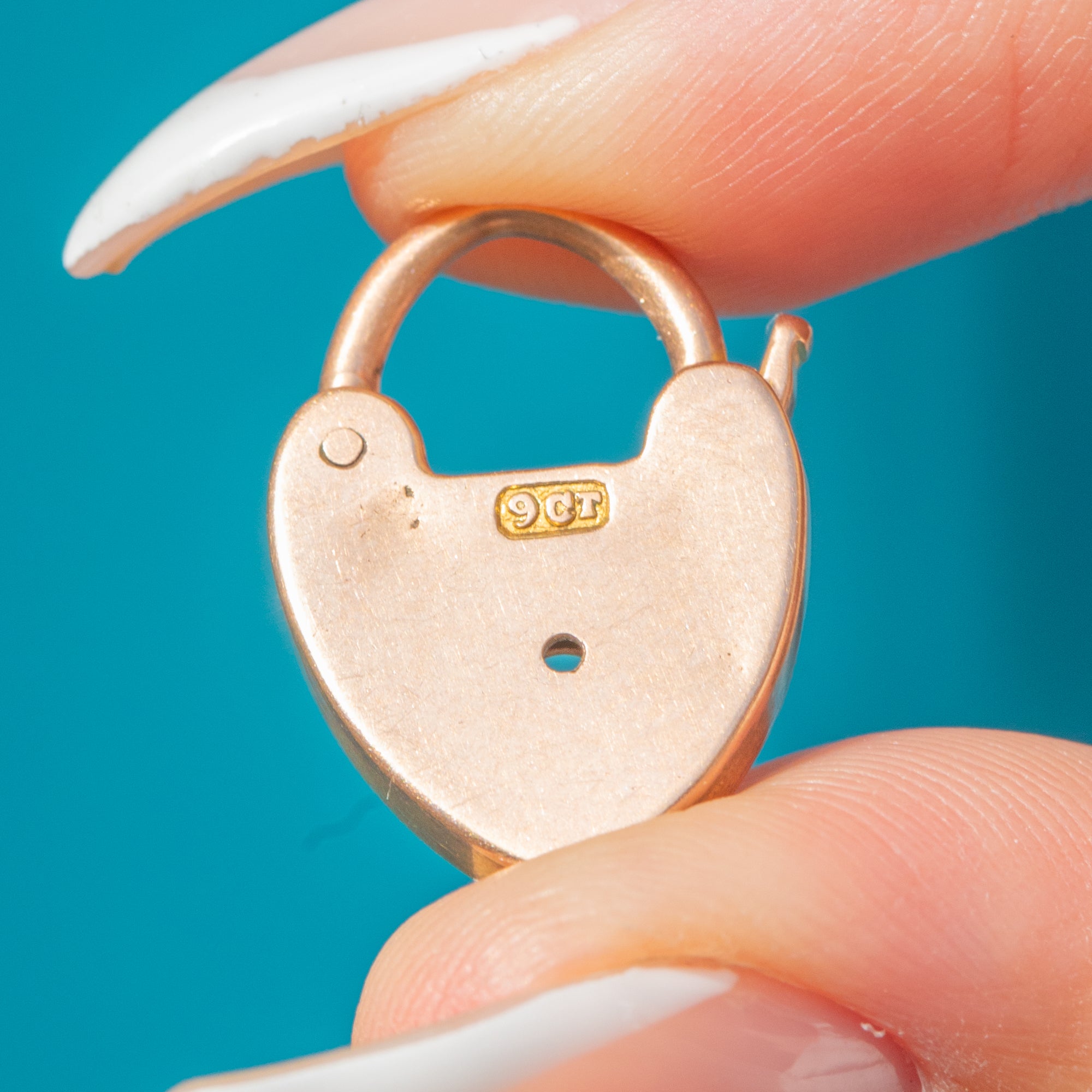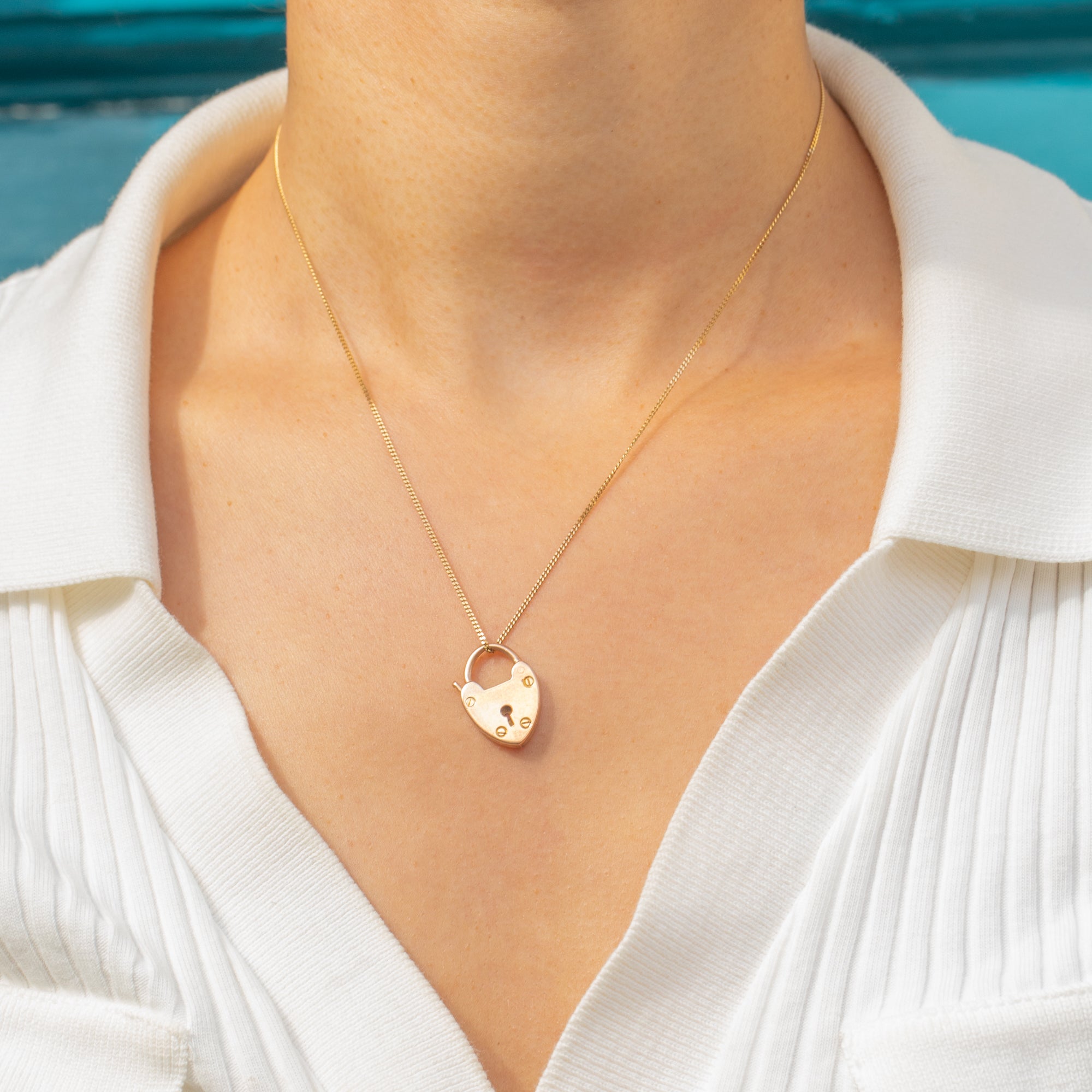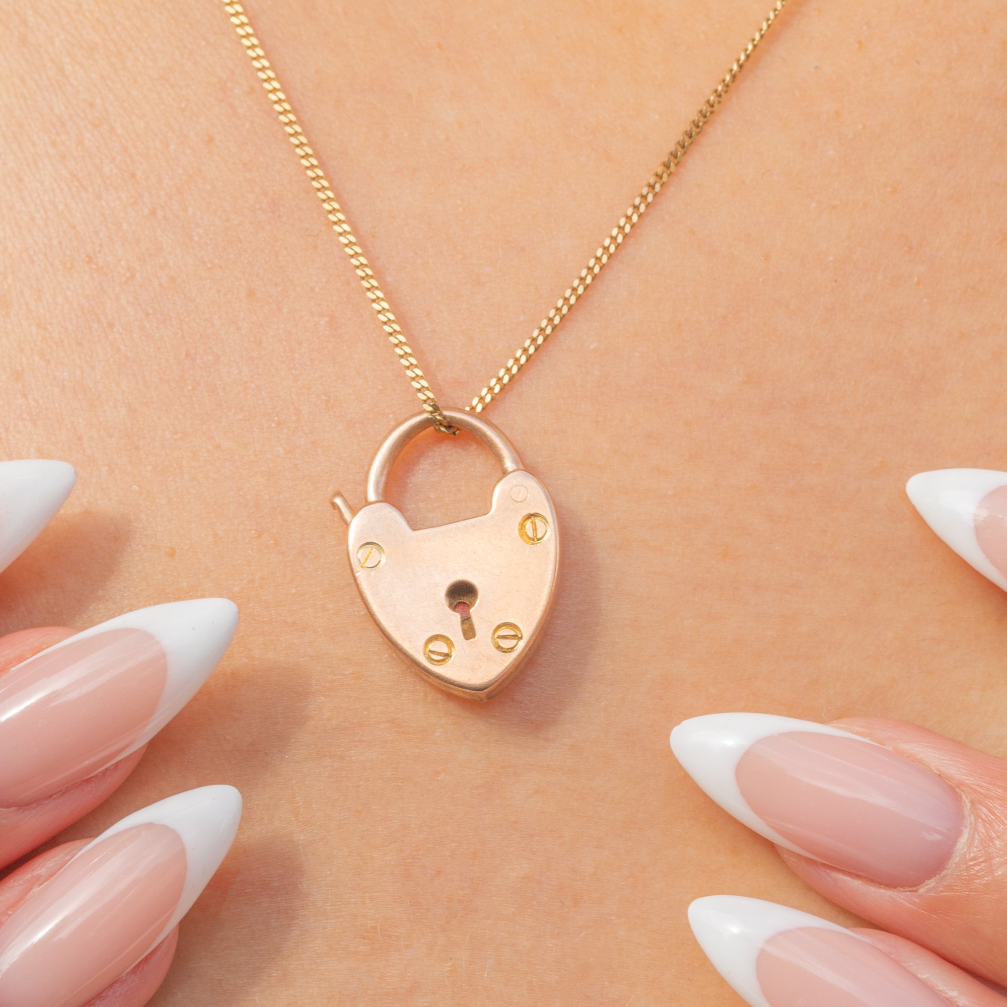 A timeless Victorian 9ct Gold heart padlock pendant, glowing with a warm yellow-rosy hue and finished in a sleek high polish. The face is adorned with a sweet keyhole motif and tiny faux screw details, while the working hinged shackle clicks closed smartly and doubles as the bail for effortless wear as a pendant.