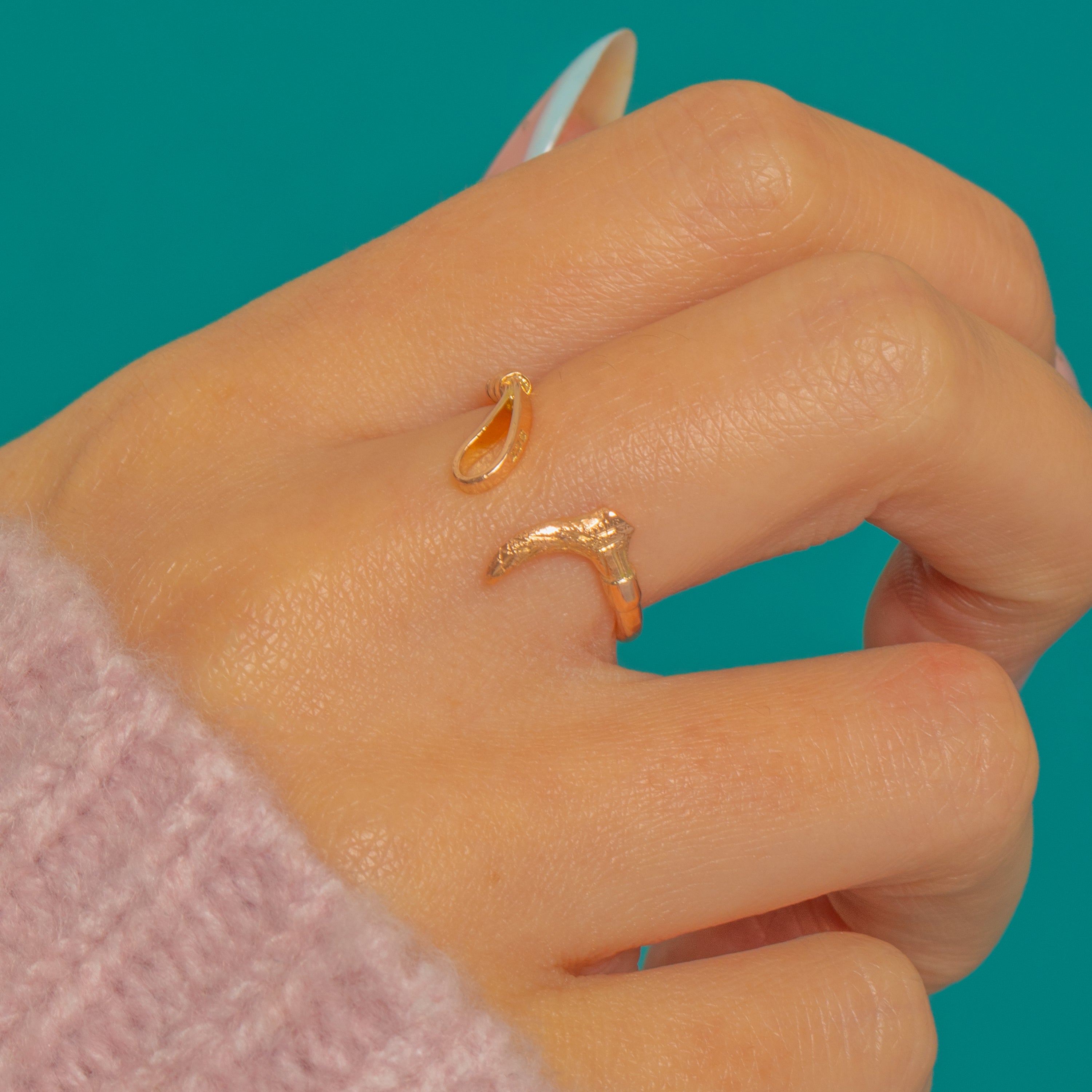 Crafted in warm 9ct Yellow Gold and stamped “9CT” to the crop’s handle, the design is slim, refined and easy to stack or style solo. The band has a gentle, tactile flex owing to the conversion, offering a comfortable fit and a whisper-light presence on the hand.