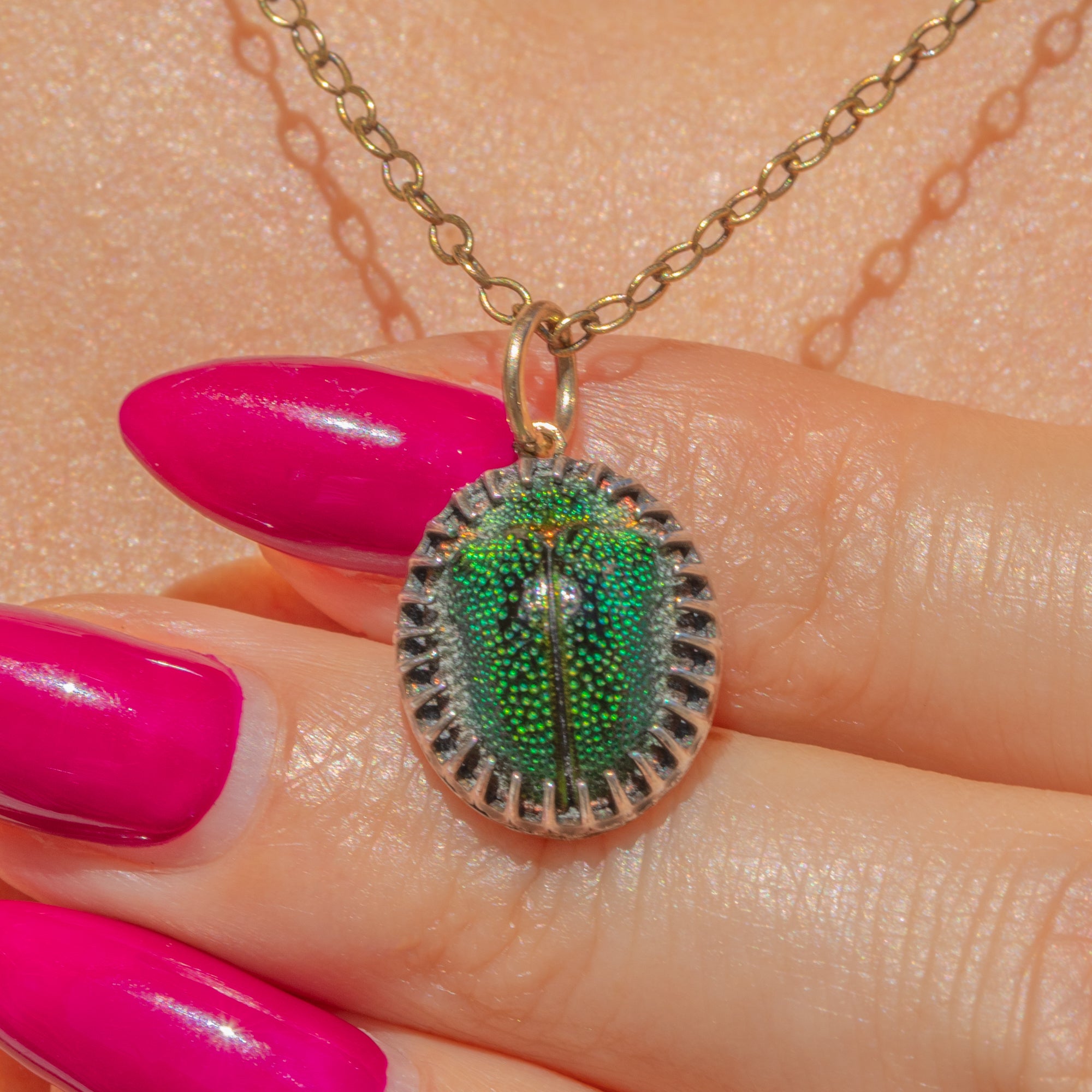 The natural Scarab Beetle boasts a deep green hue, with a gorgeous iridescence that shimmers in the light, and is displayed within striking Silver claws creating an eye-catching treasure that can easily be suspended from a skinny chain!