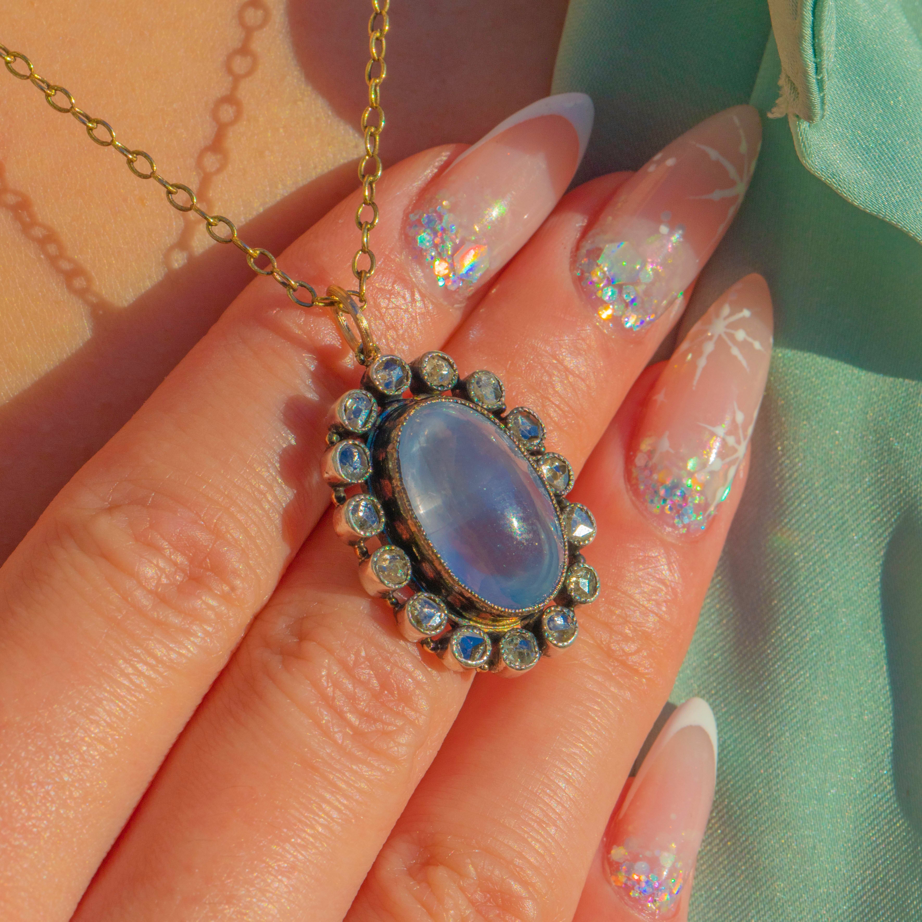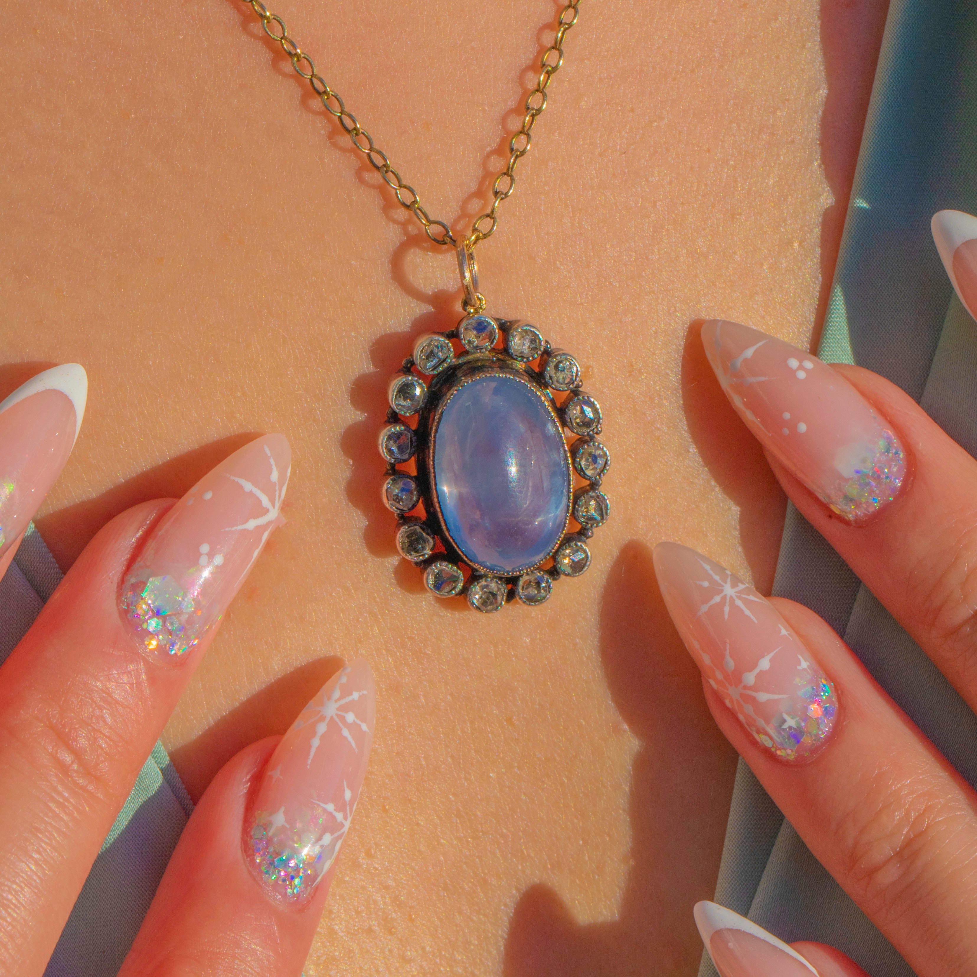 An enchanting late Victorian Star Sapphire and Diamond cluster pendant crafted in Silver with remnants of its original 18ct Gold gilt. At the heart sits a glowing 7.70ct Star Sapphire cabochon, beautifully domed and full of soft silvery light. Surrounding it is a delicate frame of antique rose-cut Diamonds, each adding subtle sparkle and enhancing the ethereal quality of the central stone.