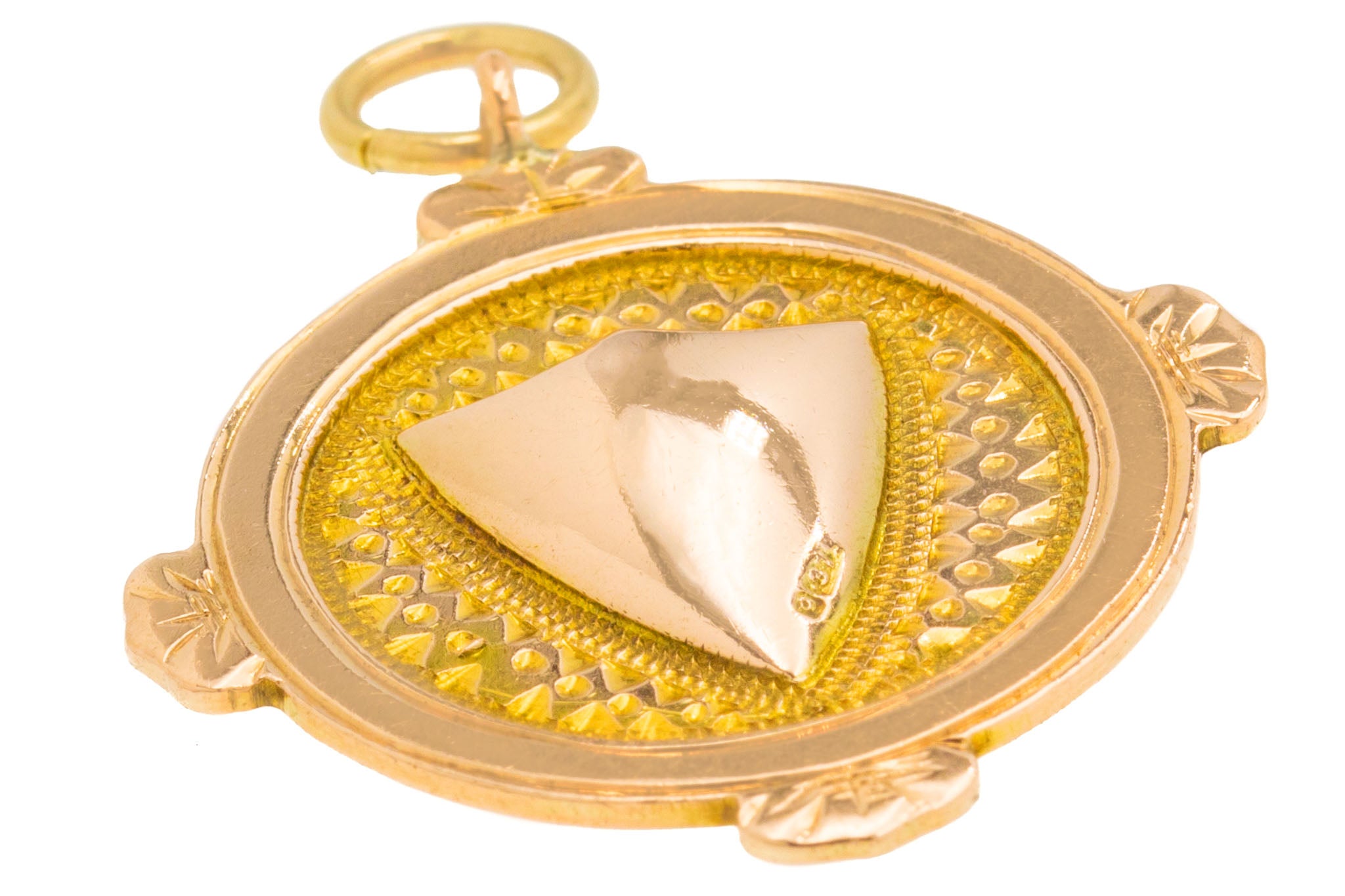 VERY GOOD. This Art Deco 9ct Gold medal fob pendant is in very good condition! The Gold is gorgeous and the details are delightful. There are a few little scratches to the back of the piece, but this is surface wear commensurate with age. This beauty has an ever so slightly thinned hasp, which is visible from the side, but the piece is still robust and sure to last many more years. This is a gorgeous piece.