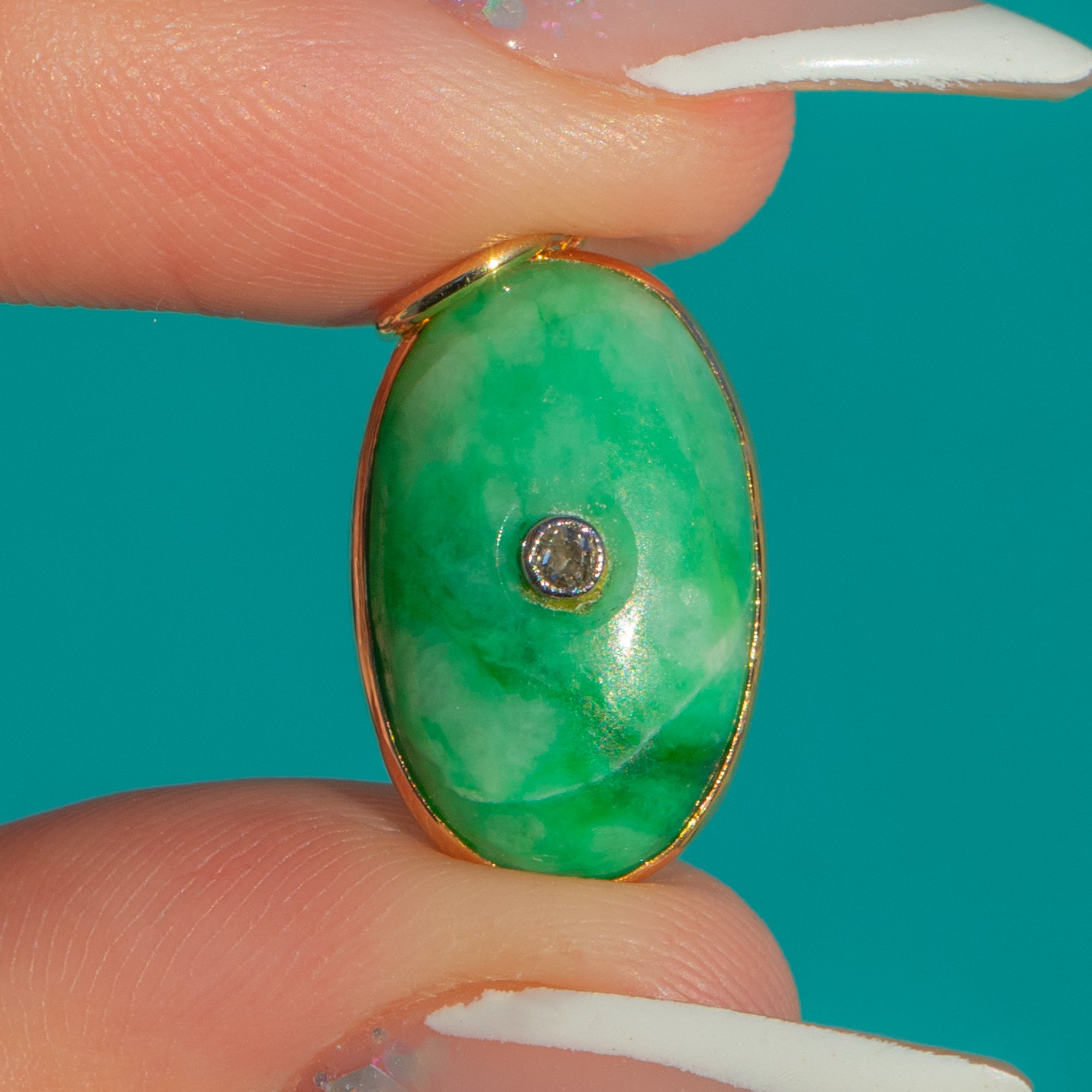 Serene and striking, this Art Deco charm centres a mottled green Jade cabochon within a glossy 15ct Gold bezel, punctuated by a tiny Old Mine cut Diamond at its heart. The clean oval silhouette and single twinkling focal point embody the refined geometry and elegance of the period.