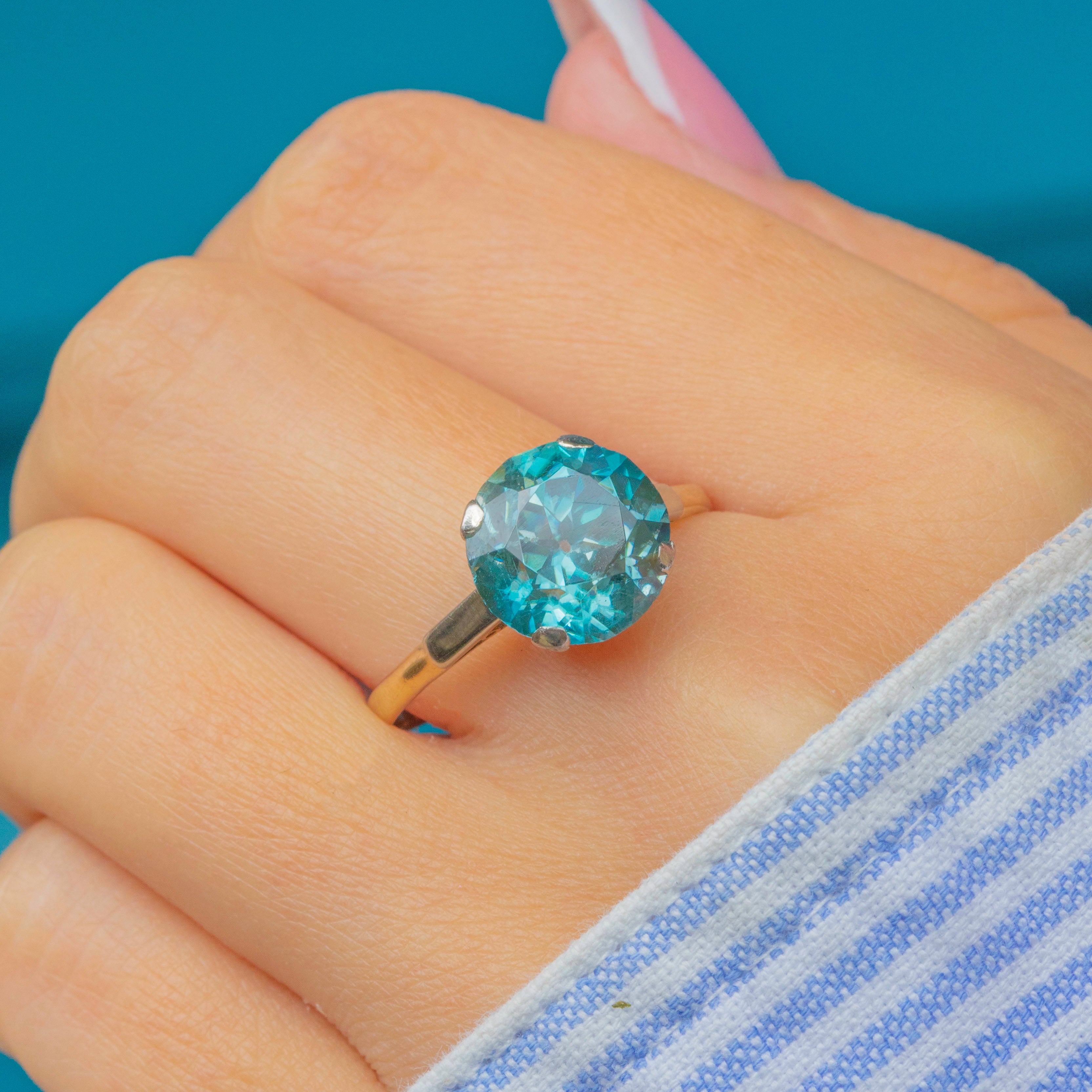 This bold Art Deco solitaire showcases a mesmerising Blue Zircon, prized for its vivid hue and exceptional brilliance. The round-cut stone is secured by sturdy Platinum claws, elevated above slim, tapering shoulders for maximum light play. The shoulders are crafted in Platinum for strength and contrast, flowing into a warm 18ct Gold band.