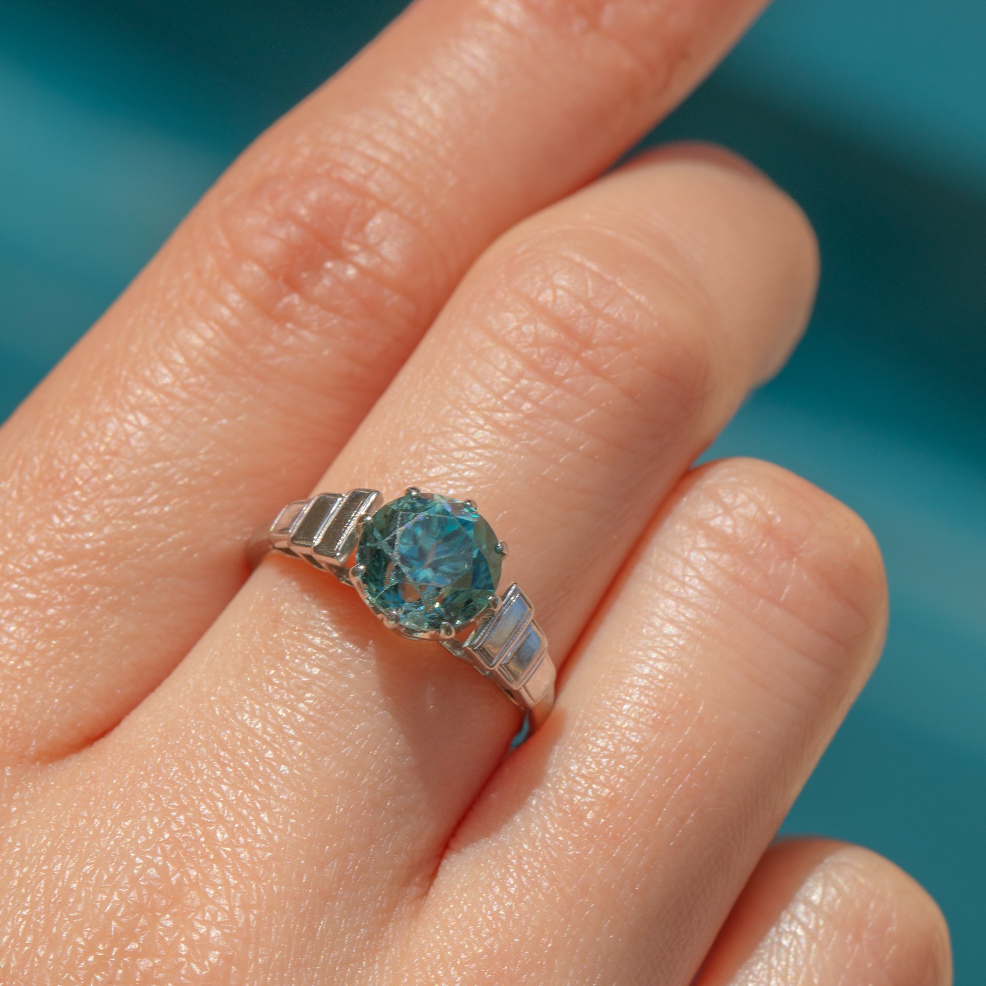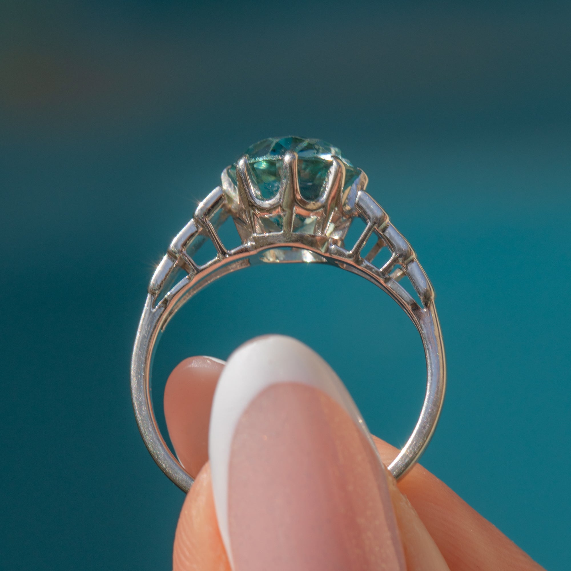 VERY GOOD: This Art Deco 18ct Gold Blue Zircon solitaire ring is tip-top condition. The Zircon is snug in its settings and the White Gold has a high-shine polish and luminescence! While there is evidence on the back of a previous resize, this does not affect the overall impact of the piece.