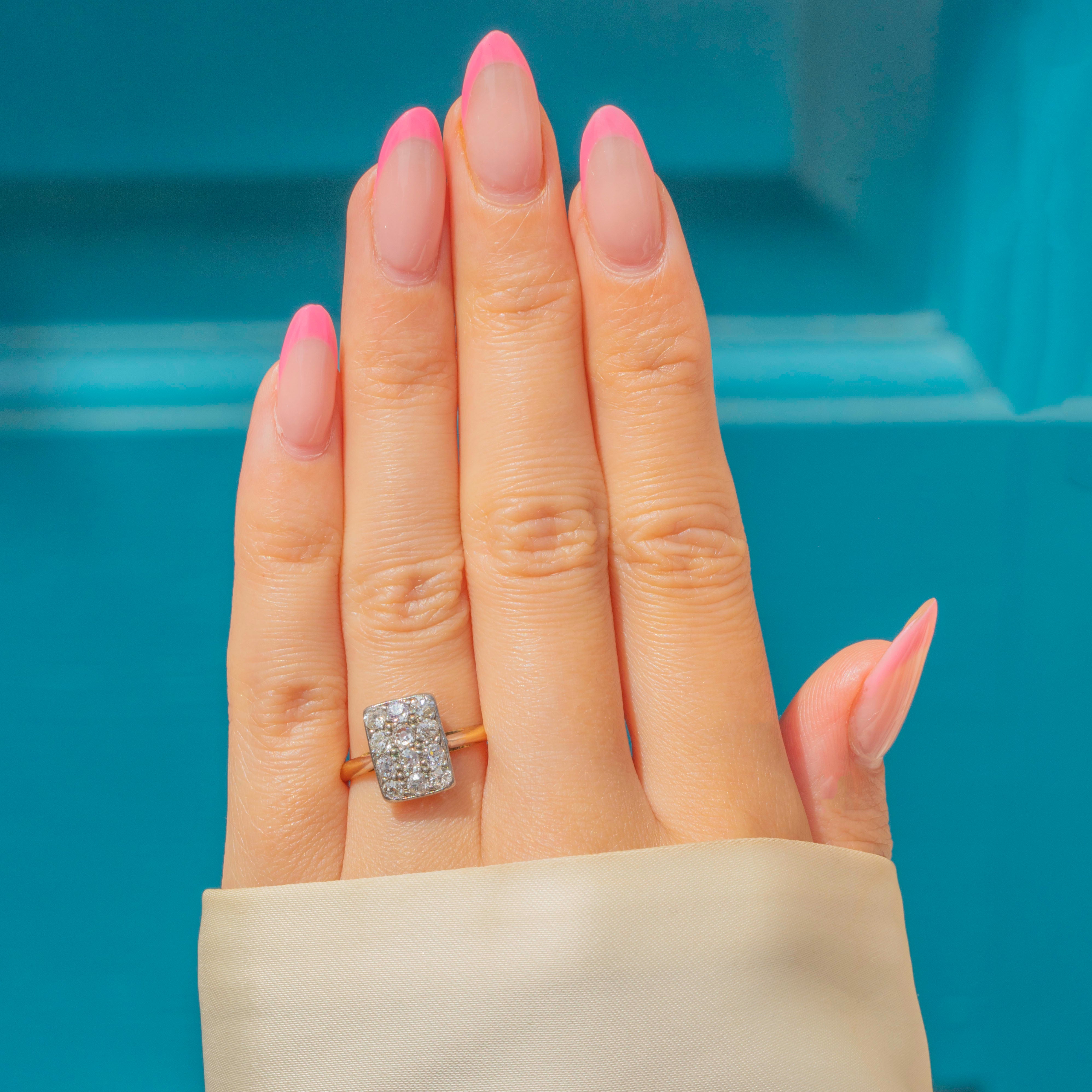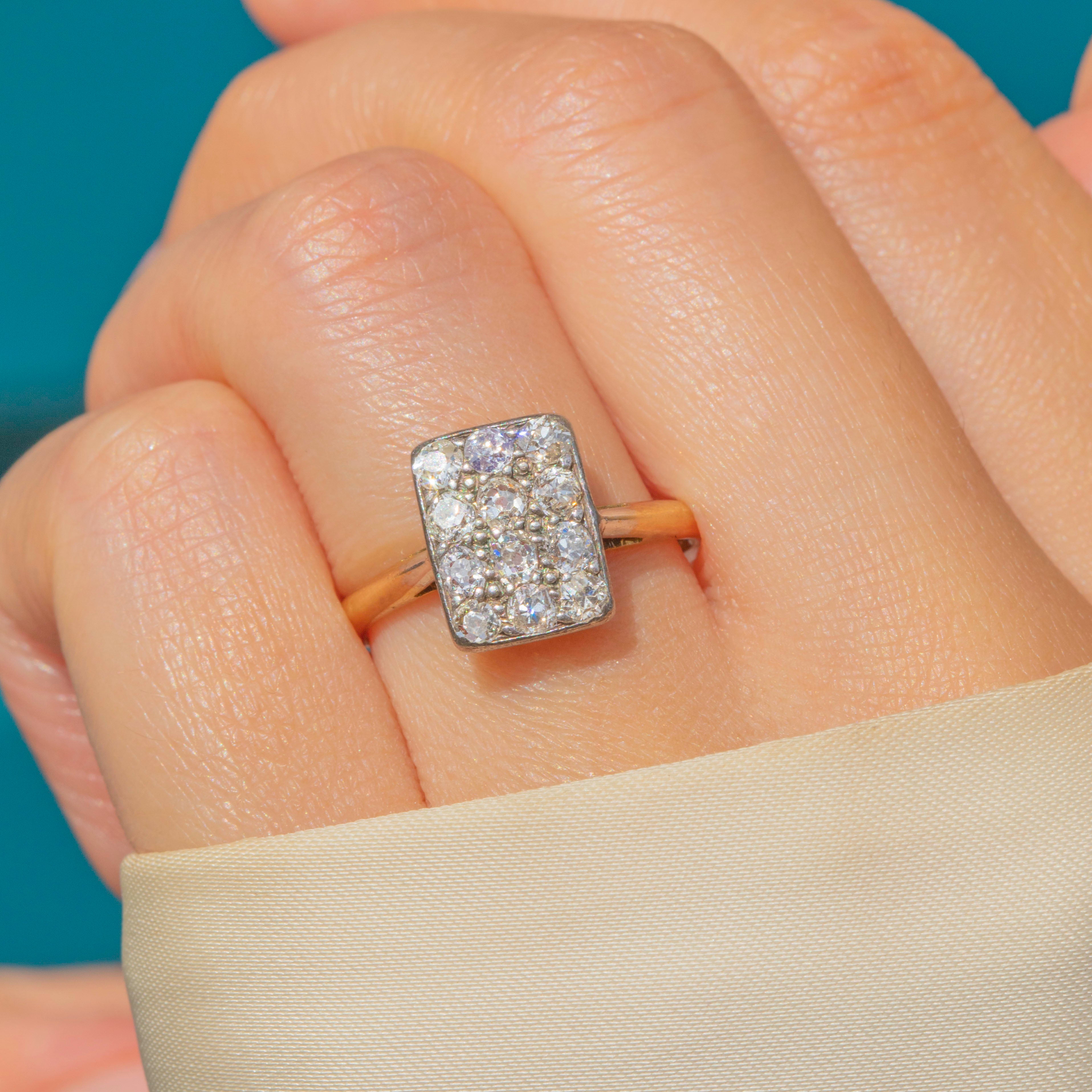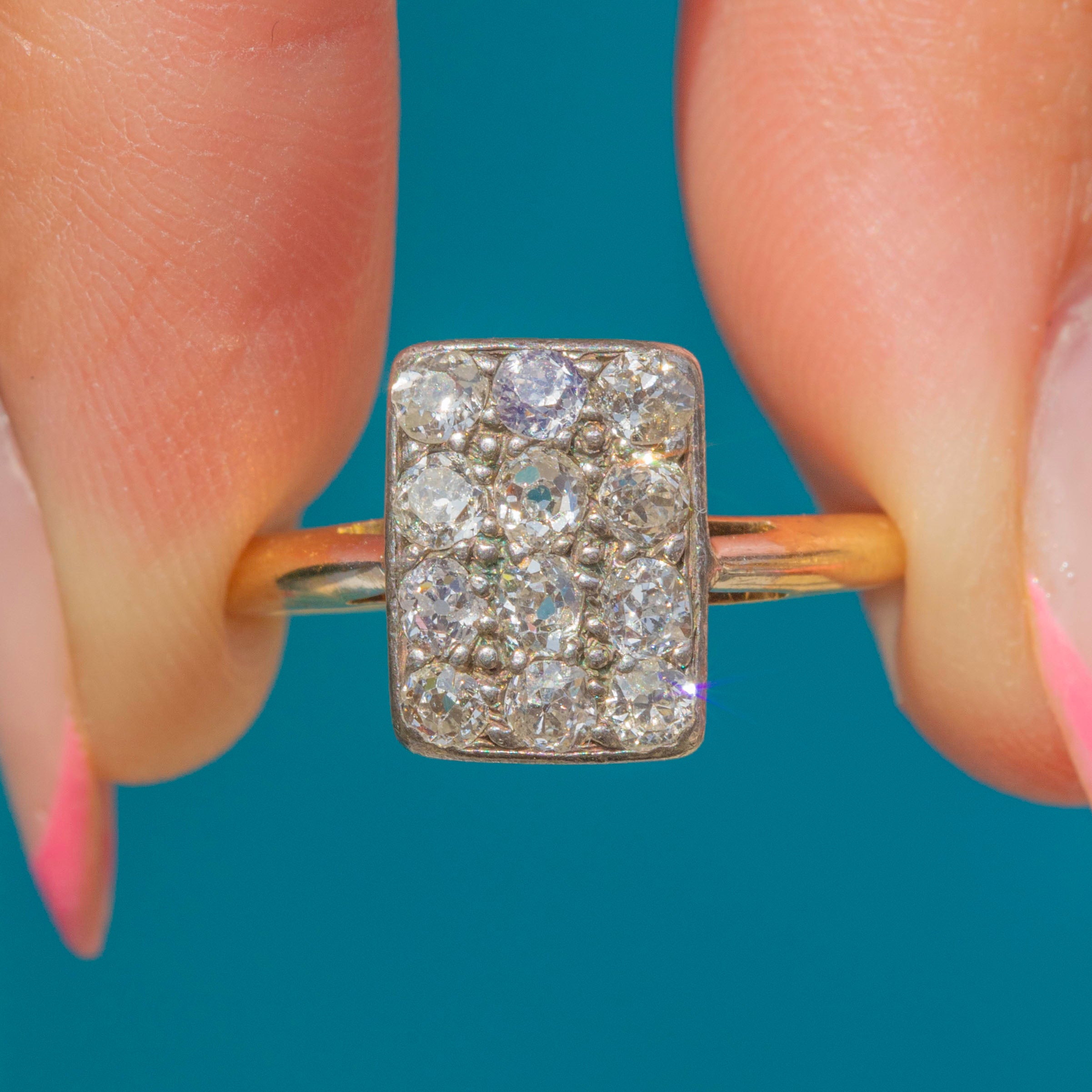 This Art Deco Diamond panel ring is classically beautiful! Embellished with 12 bright old mine-cut Diamonds, her rectangular cluster ring face twinkles at every angle.