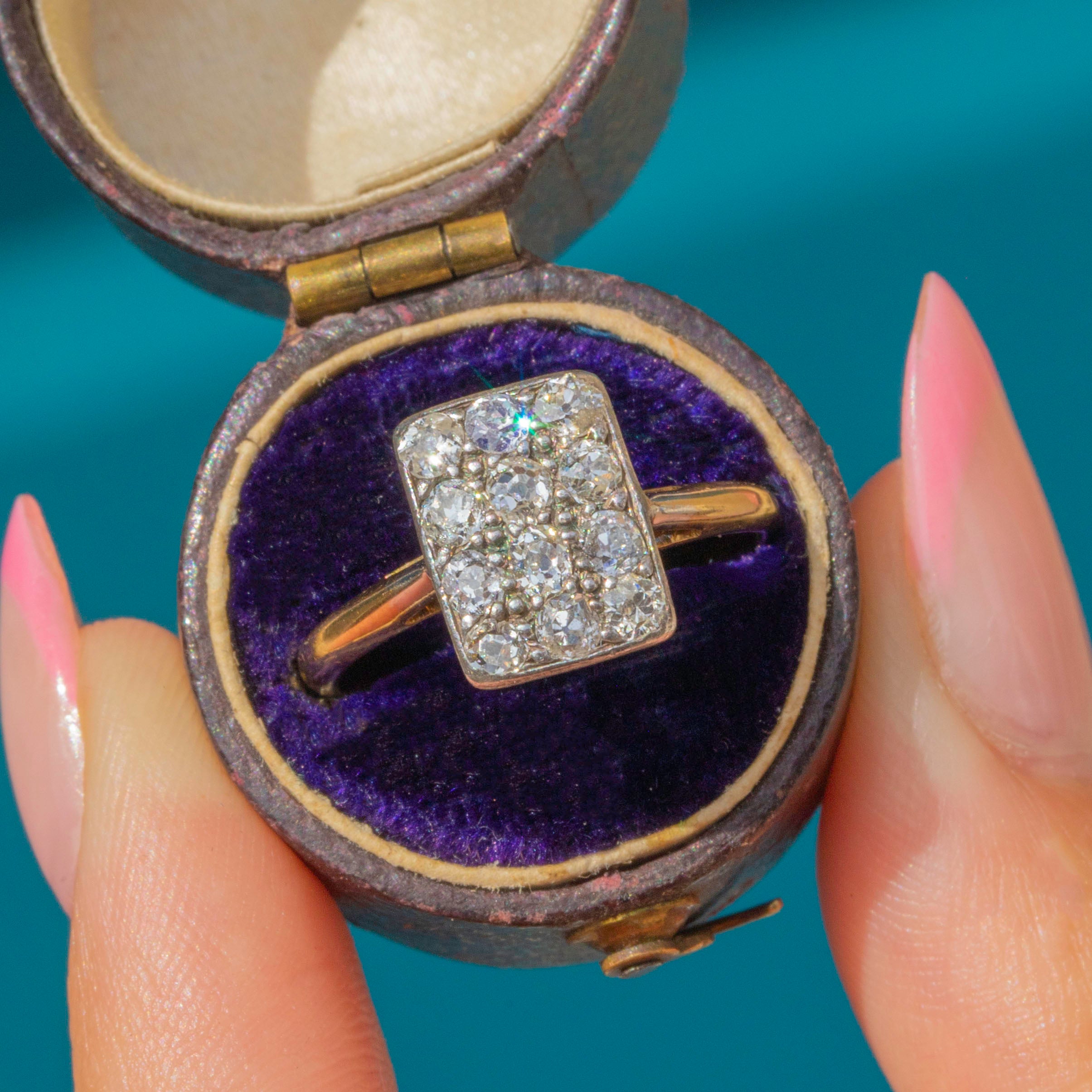 VERY GOOD-EXCELLENT: This Art Deco 18ct Gold Diamond panel ring is in excellent condition. Each of her 12 Diamonds are securely set and free from damage, retaining a brilliant sparkle for their ages. There are no signs of a previous resize, and the 18ct Gold is buttery throughout, free from dings and dents. Although her hallmarks are illegible, you can be rest assured that our in house testing team has confirmed she is 18ct Gold with Silver settings. In awe of her sparkle and coverage on the finger, this is a glorious Art Deco engagement ring!