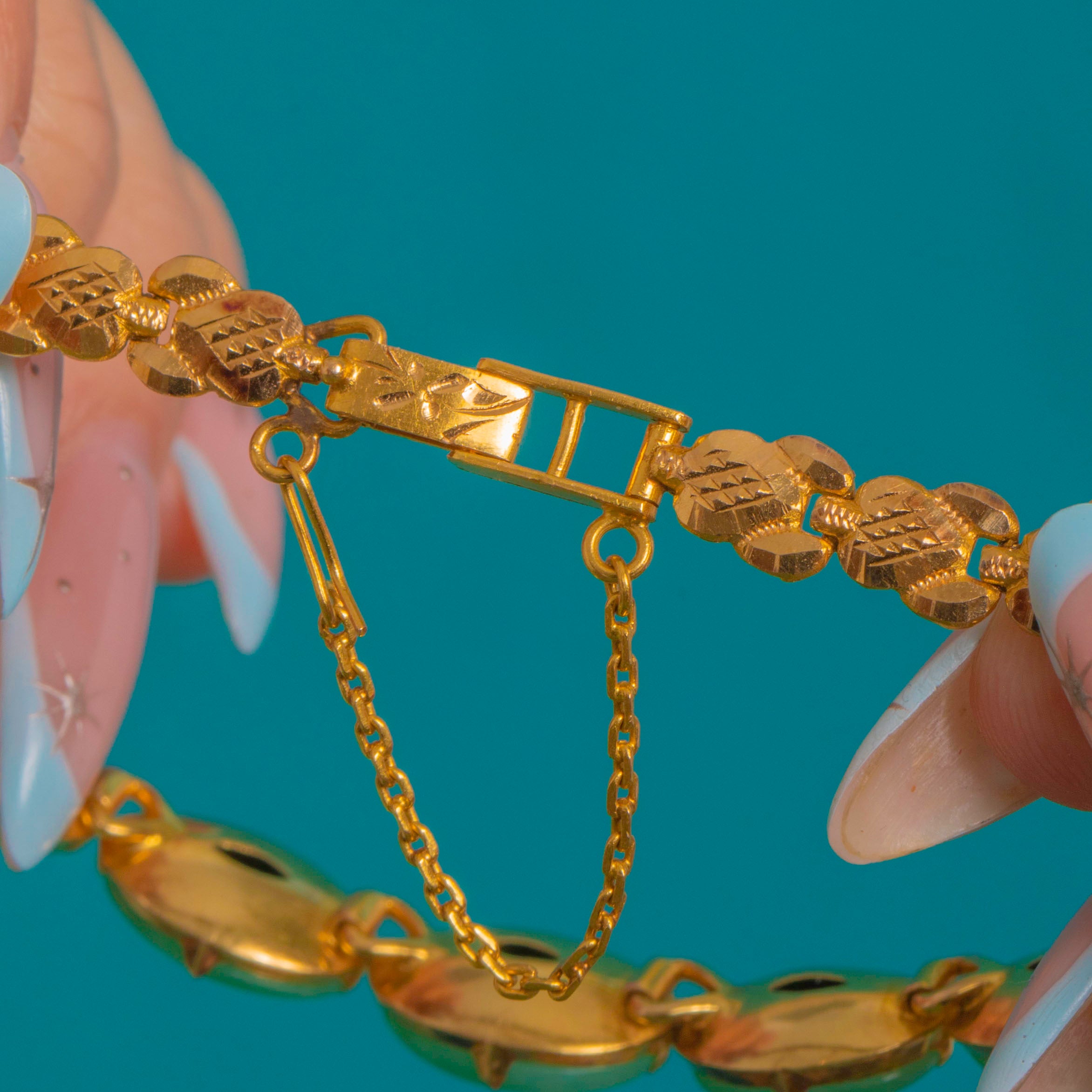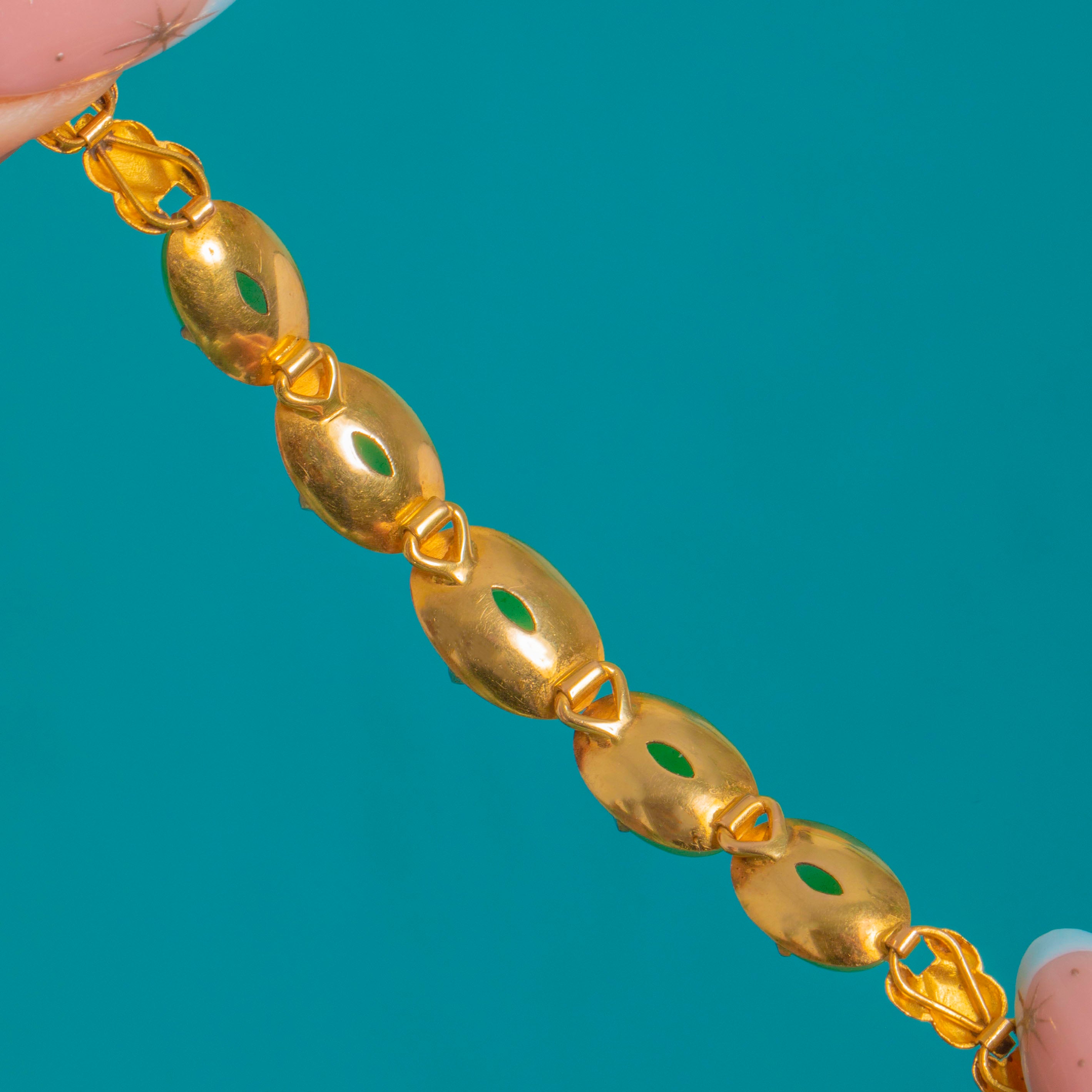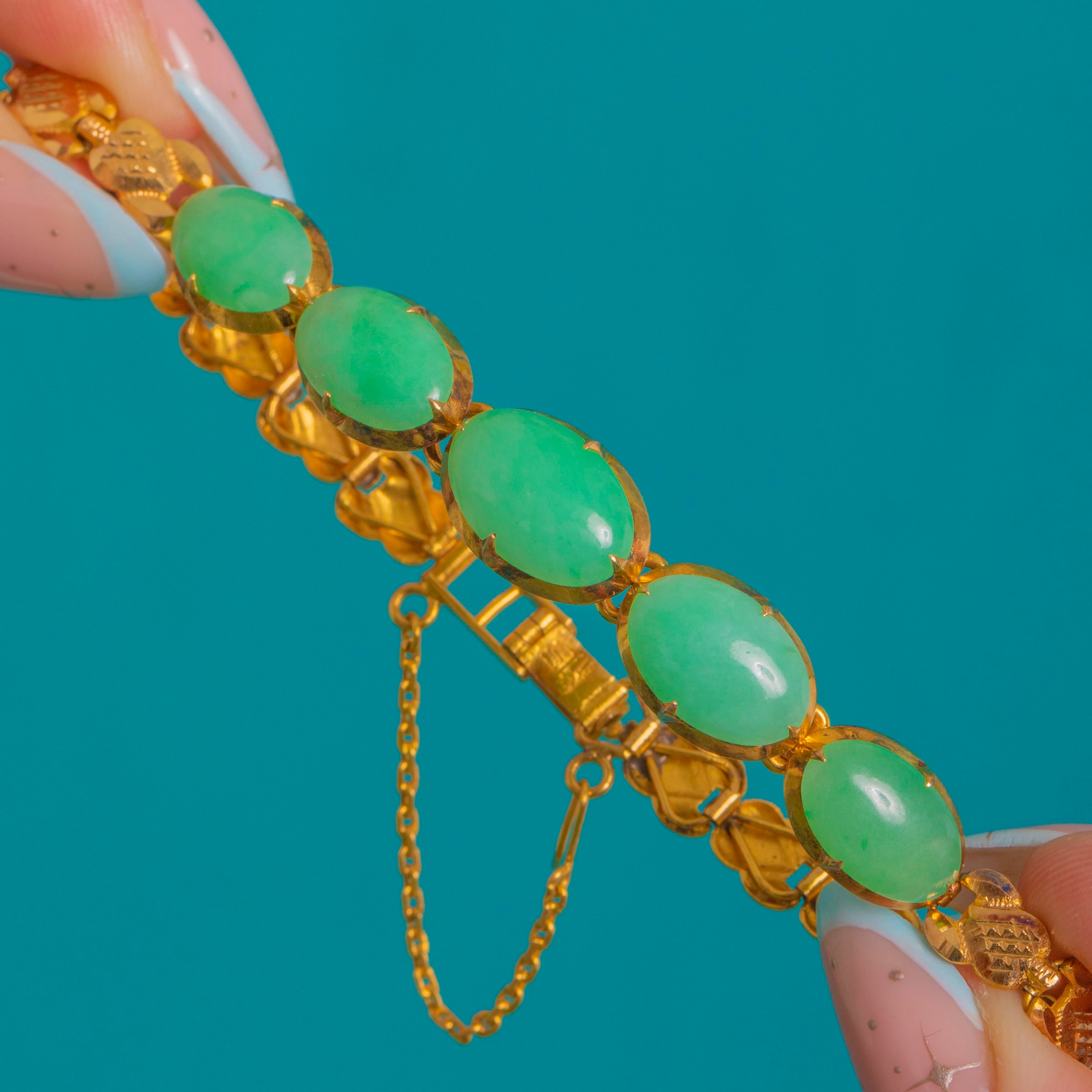 A serene run of soft apple-to-mint green Jade cabochons glows against rich 18ct Gold in this elegant line bracelet. Each oval cabochon is set in slim collet mounts with fine claws and open sides, allowing light to play across the glossy, lightly mottled stones as the articulated links move fluidly on the wrist.