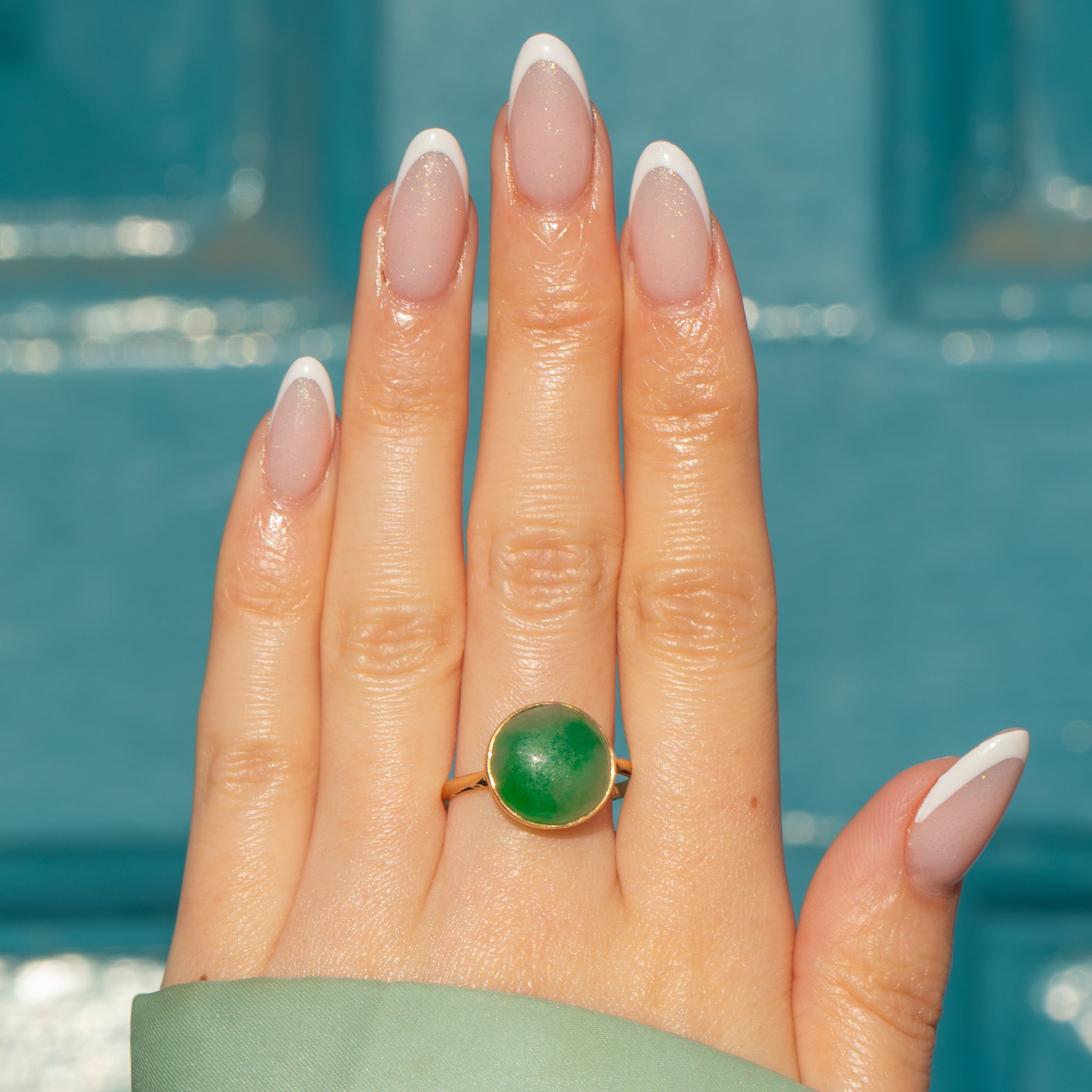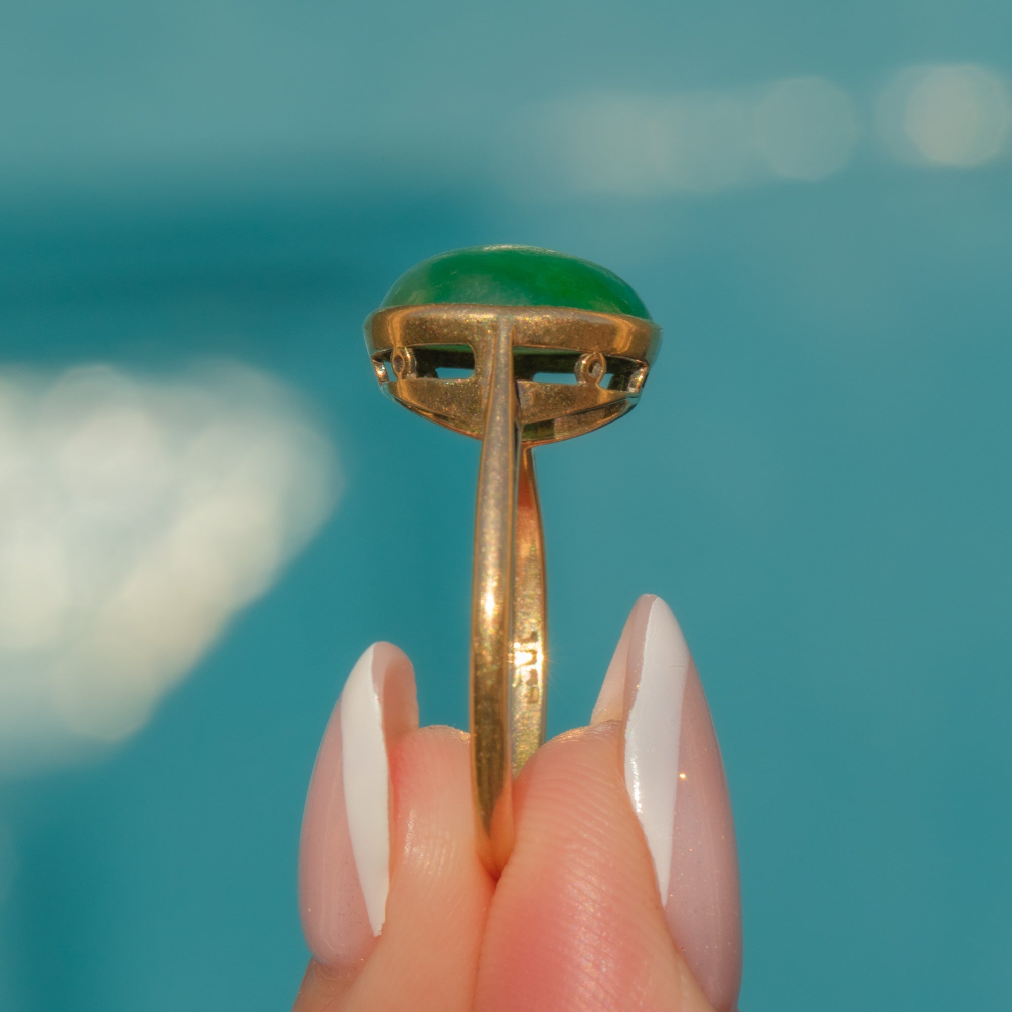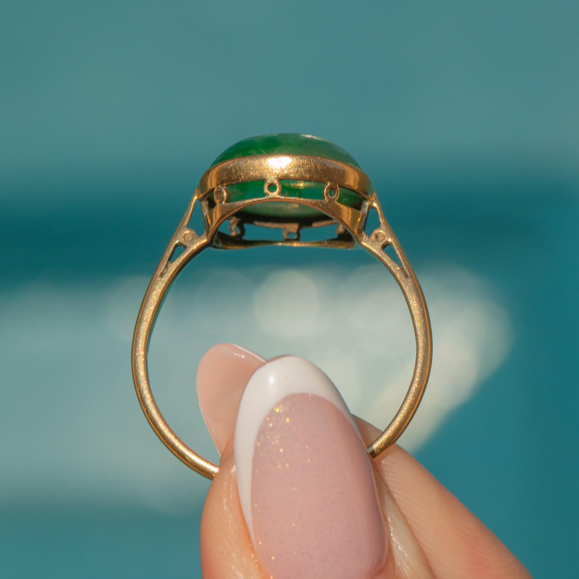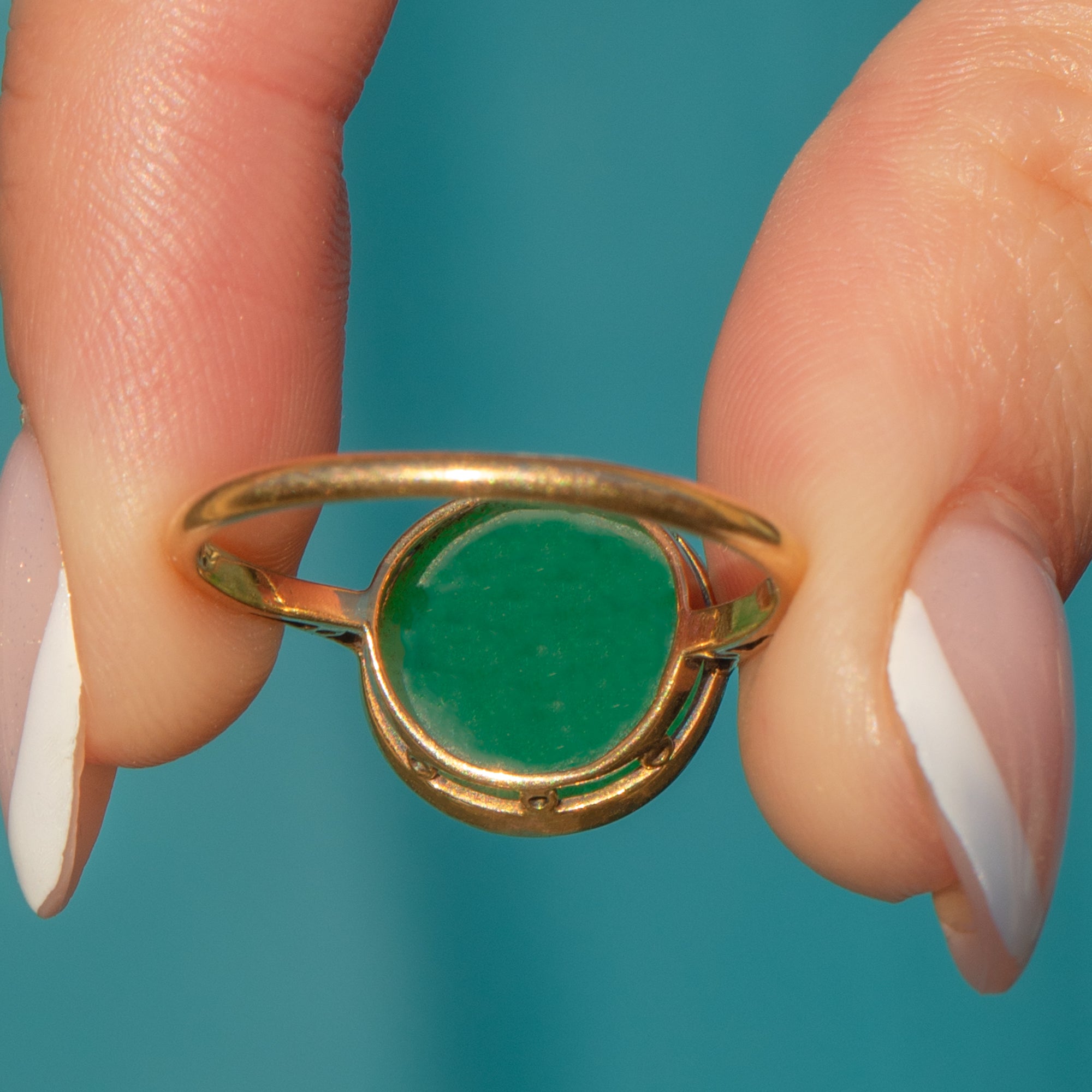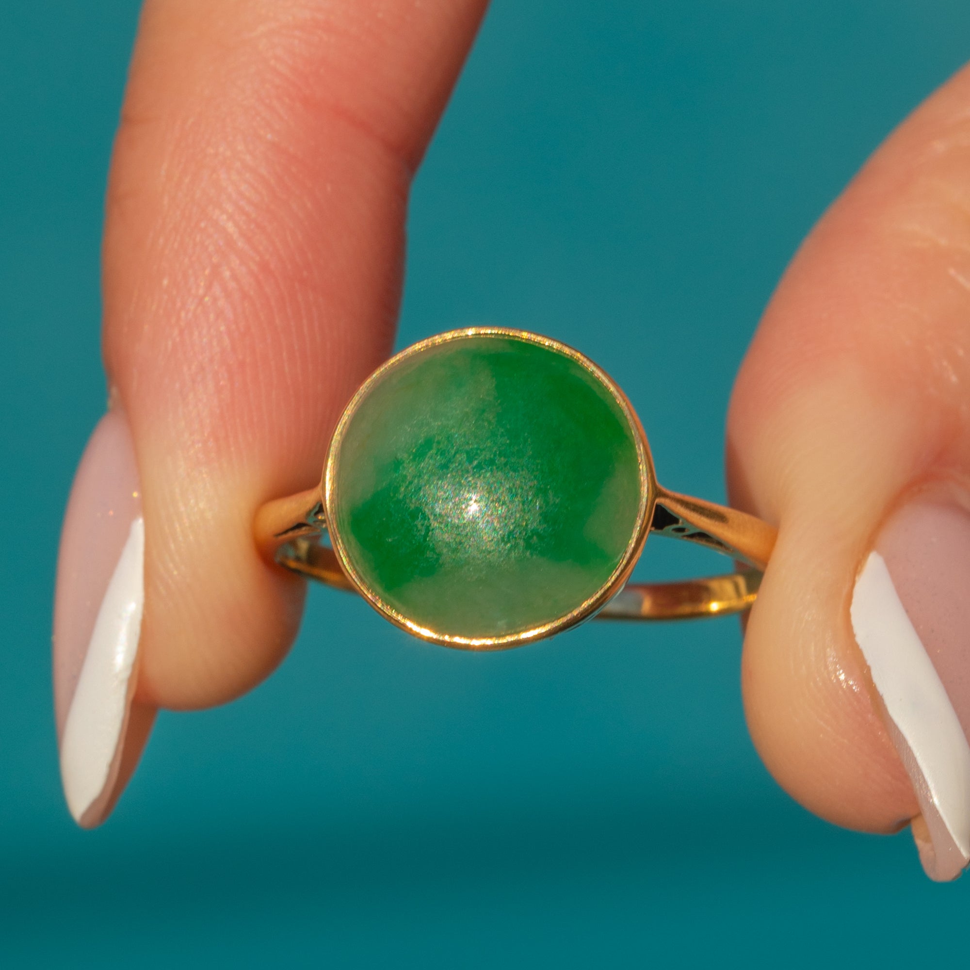 Add a pop of colour to your attire with this Art Deco 18ct Gold Jade cabochon ring!