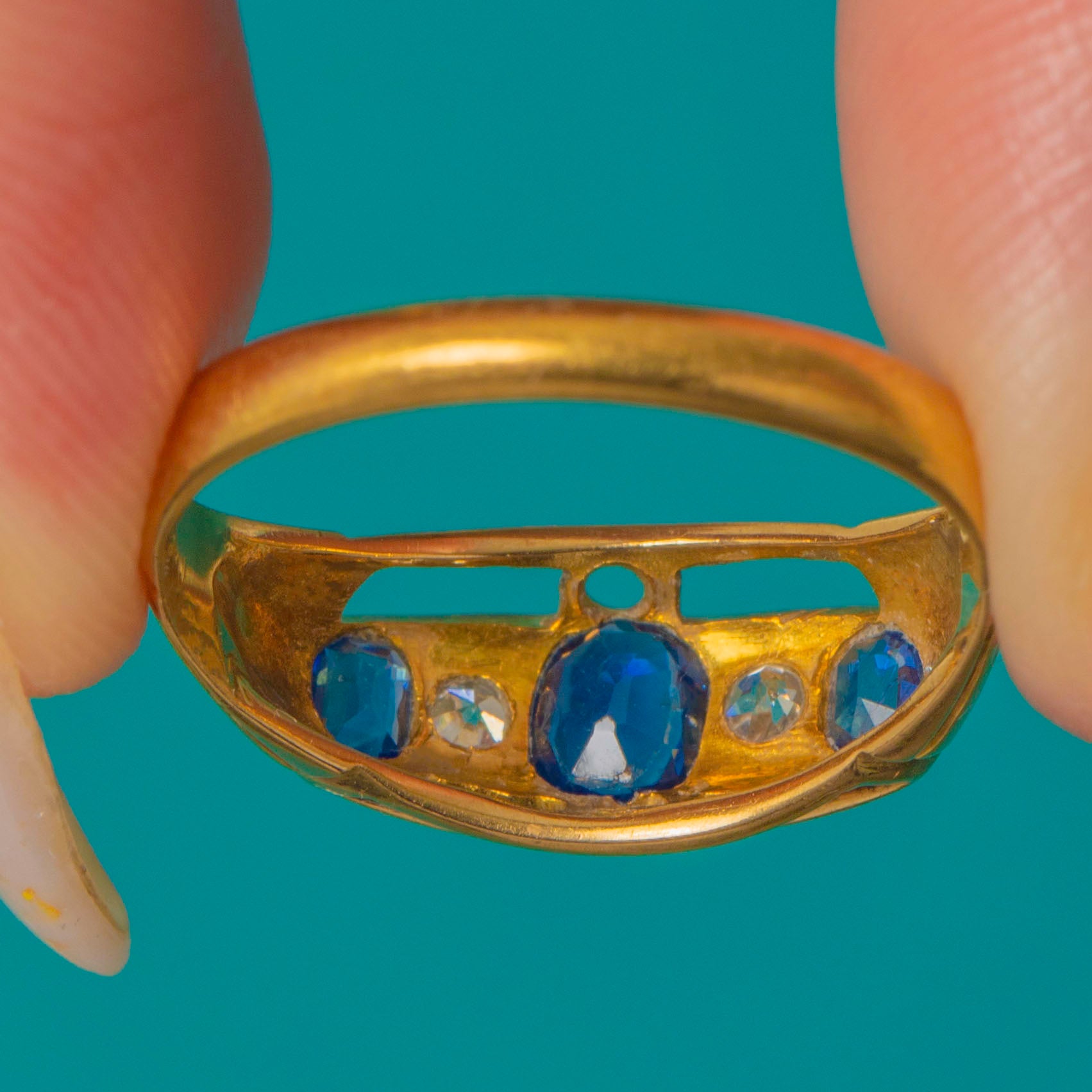 Antique 18ct Gold Natural Sapphire & Diamond Five Stone Boat Ring