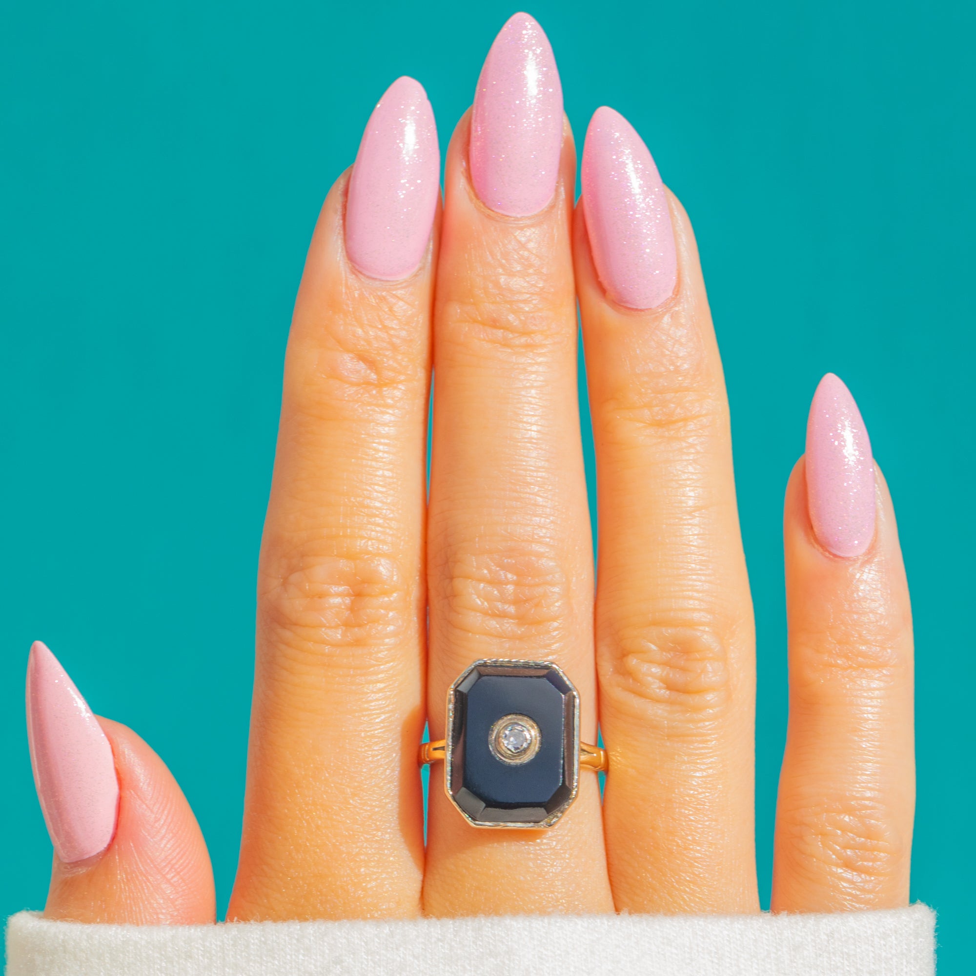 EXCELLENT: The Onyx shows some tiny surface abrasions and a fine hairline scratch in keeping with age; the Diamond is bright and secure. The Gold shank is smooth and robust, with light surface wear and minor polishing marks consistent with careful wear. No visible resizing or repairs.