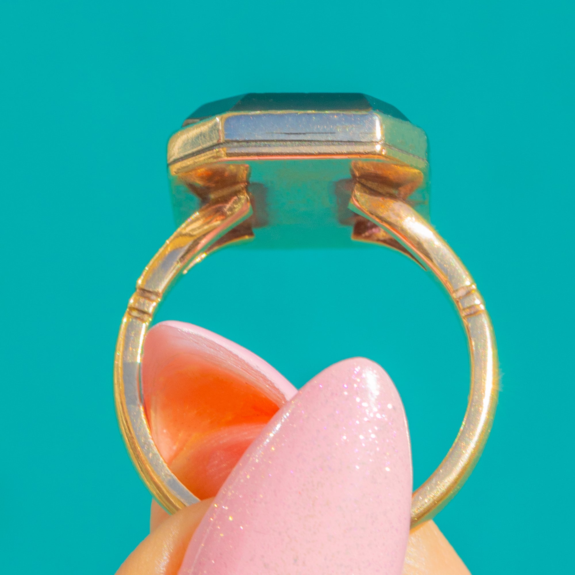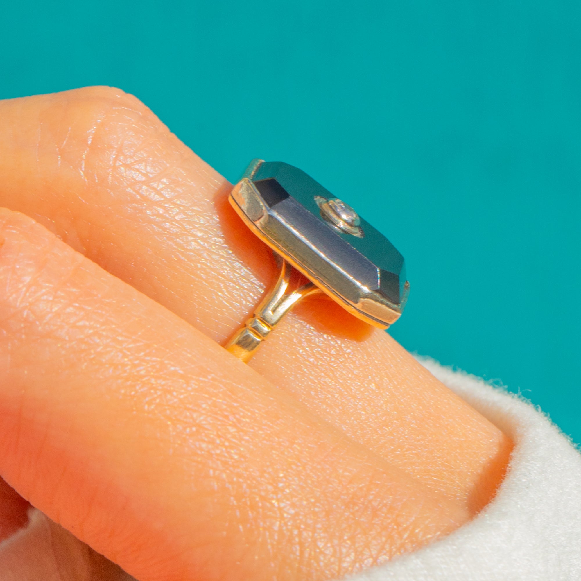 A sleek Art Deco Onyx panel ring with striking architectural poise. The glossy rectangular Onyx is framed in a raised bezel and punctuated by a single bright bezel-set Diamond at the centre for crisp contrast. The stepped shoulders and clean geometry create a bold signet-cocktail silhouette that feels both refined and confidently modern.
