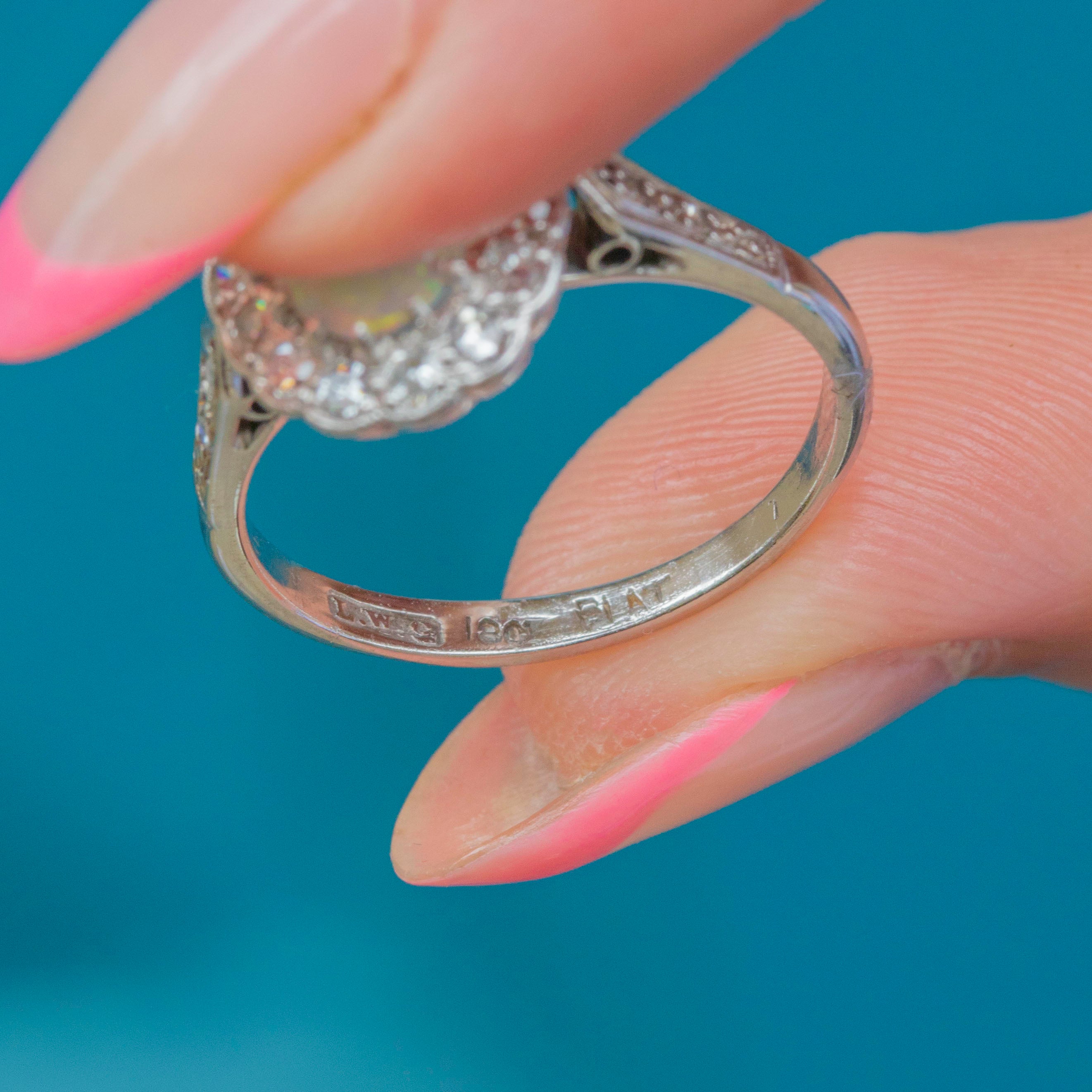 EXCELLENT:  This Art Deco 18ct White Gold Opal Diamond cluster ring has been well preserved and is in excellent condition! The Opal is smooth to the touch, with an absorbing firework display of colour and is secure within her claw settings. Each Diamond is secure and present! The ring band has a well-rounded form, with the 18ct White Gold remaining highly saturated. There's no doubt this Art Deco ring will always be the talking point!