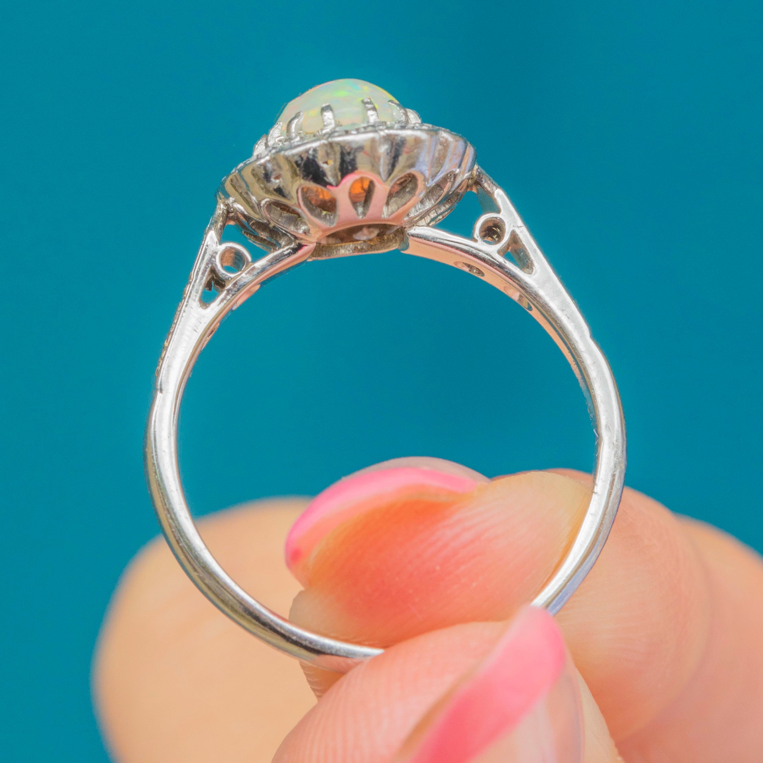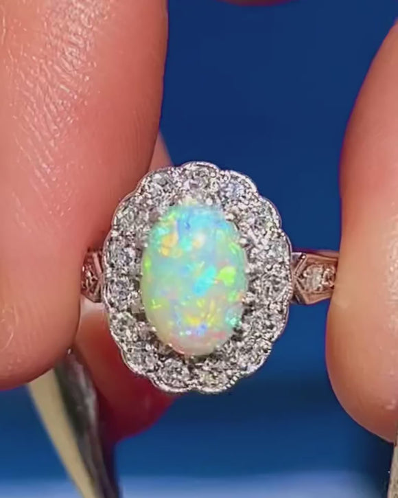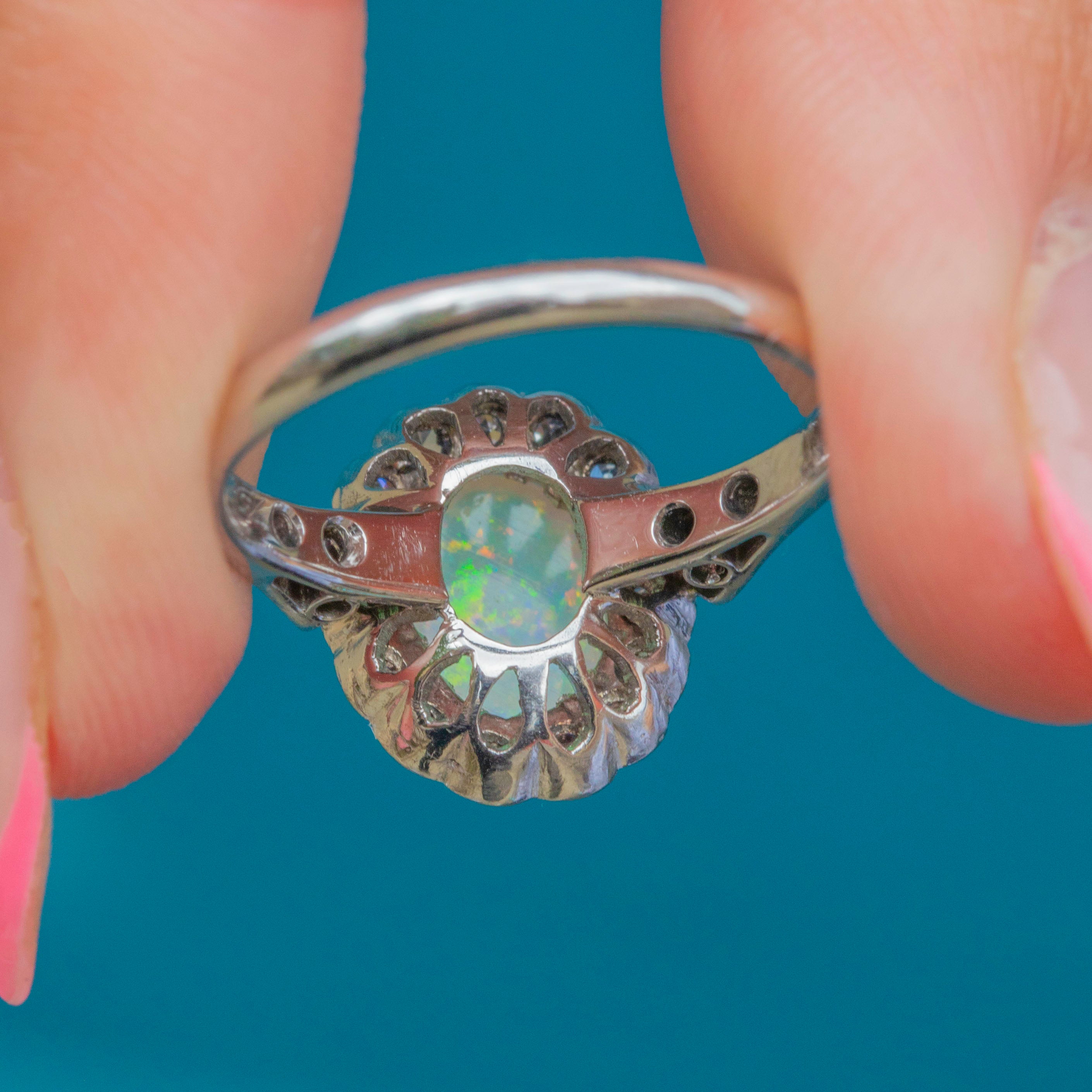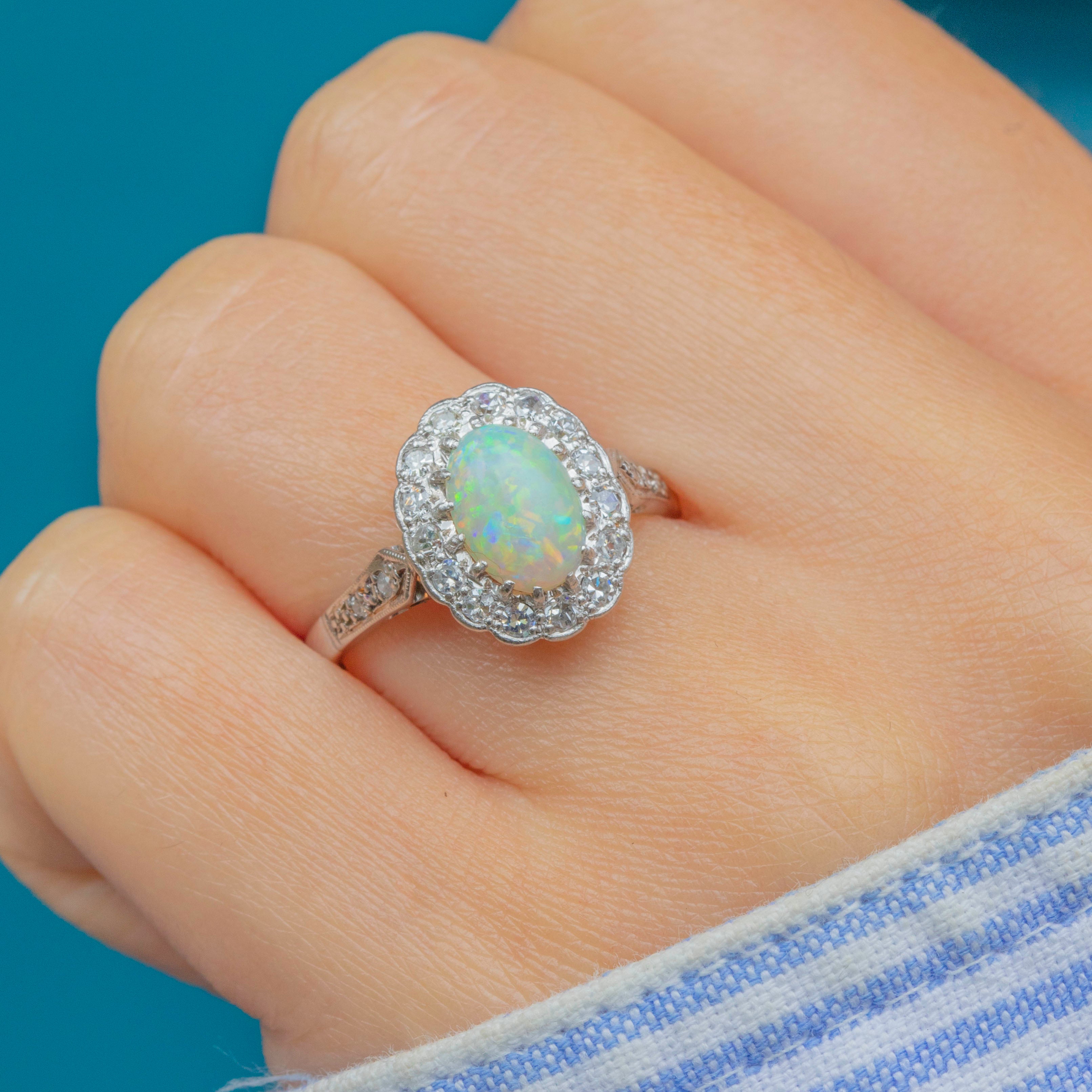 Prepare to have your breath taken away by the sheer beauty of this Art Deco 18ct White Gold Opal Diamond cluster ring! Her oval 0.70ct Opal cabochon is akin to a burst of confetti as it catches the light, flaunting a spectrum of iridescent flashes which will never fail to amaze.