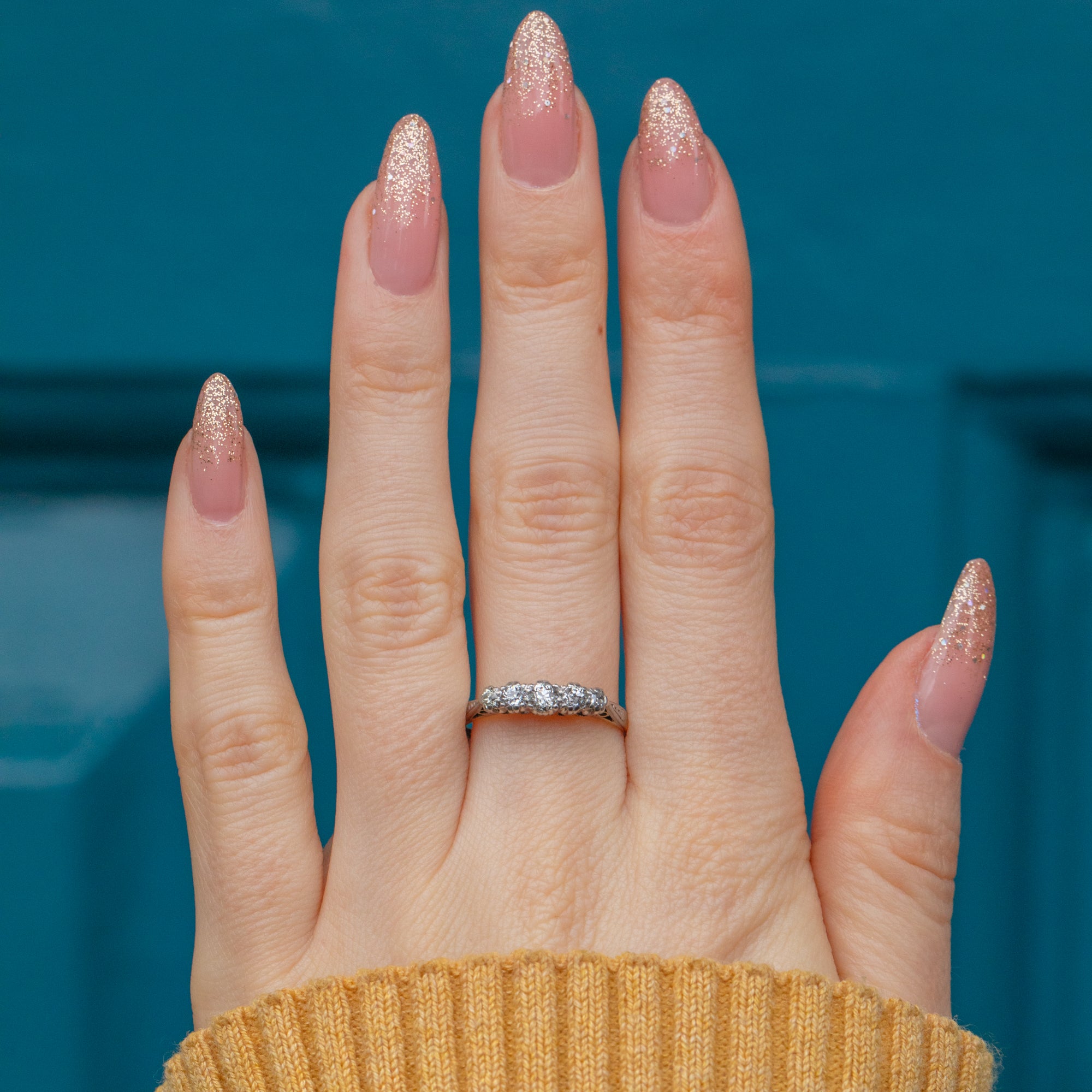 Five twinkling Diamonds sit on an 18ct Gold band, oozing glamour and sophistication as she sits on your finger. With a combined carat weight of 0.25ct, each Old-European cut Diamond scintillates in the light and sits comfortably within lustrous Platinum settings, flaunting a 4.5mm profile with her gorgeous gallery.