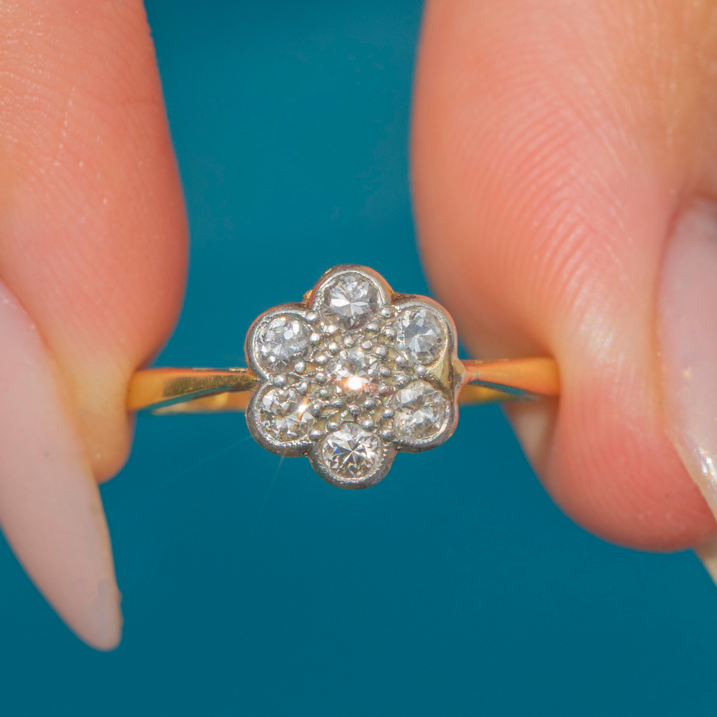 A charming Art Deco Diamond flower cluster ring in 18ct Gold and Platinum, c.1920. The ring features seven natural Diamonds set in a delicate flower-shaped cluster, with each Diamond nestled in a Platinum bezel. Together, they create a soft sparkle and a timelessly romantic motif that has been loved for generations.