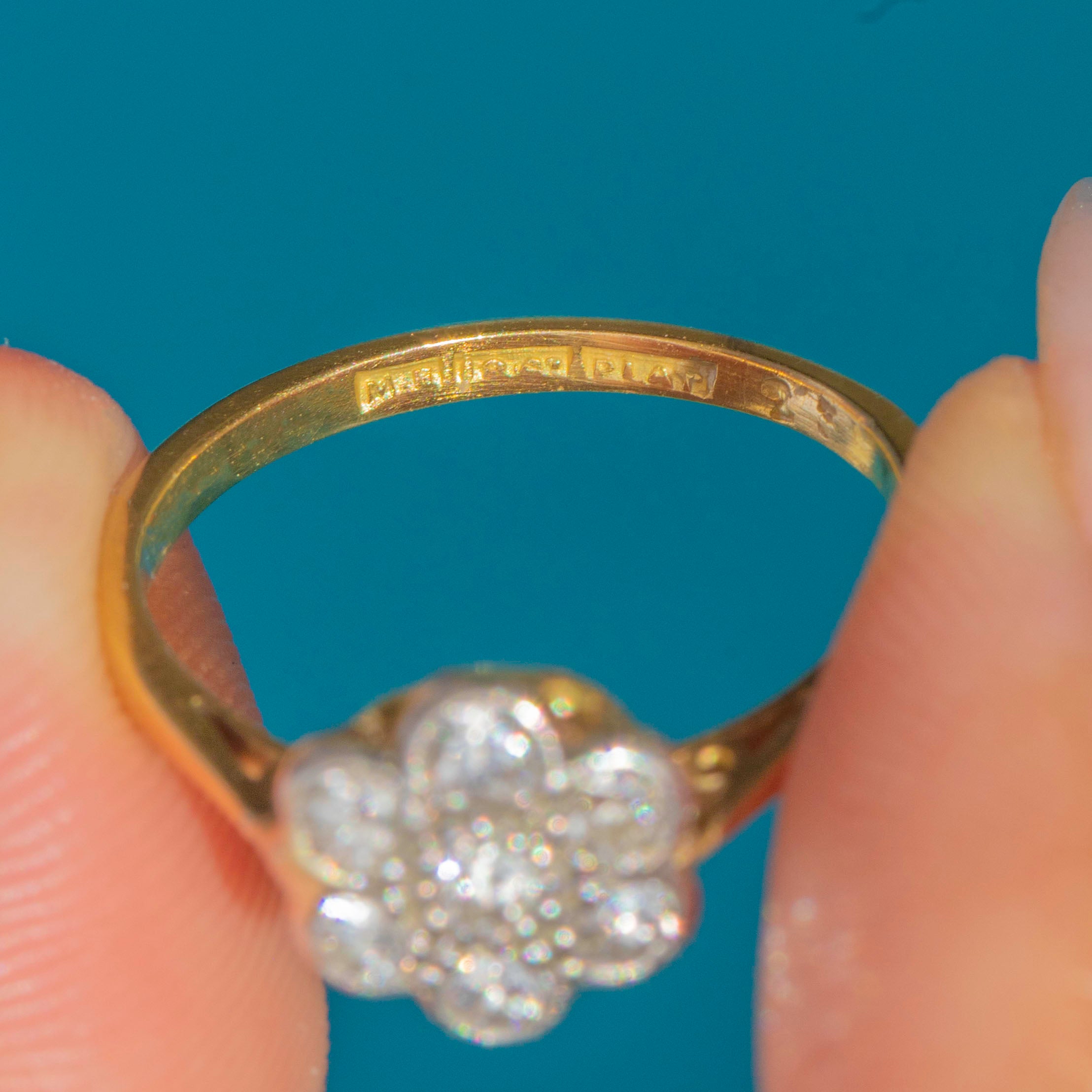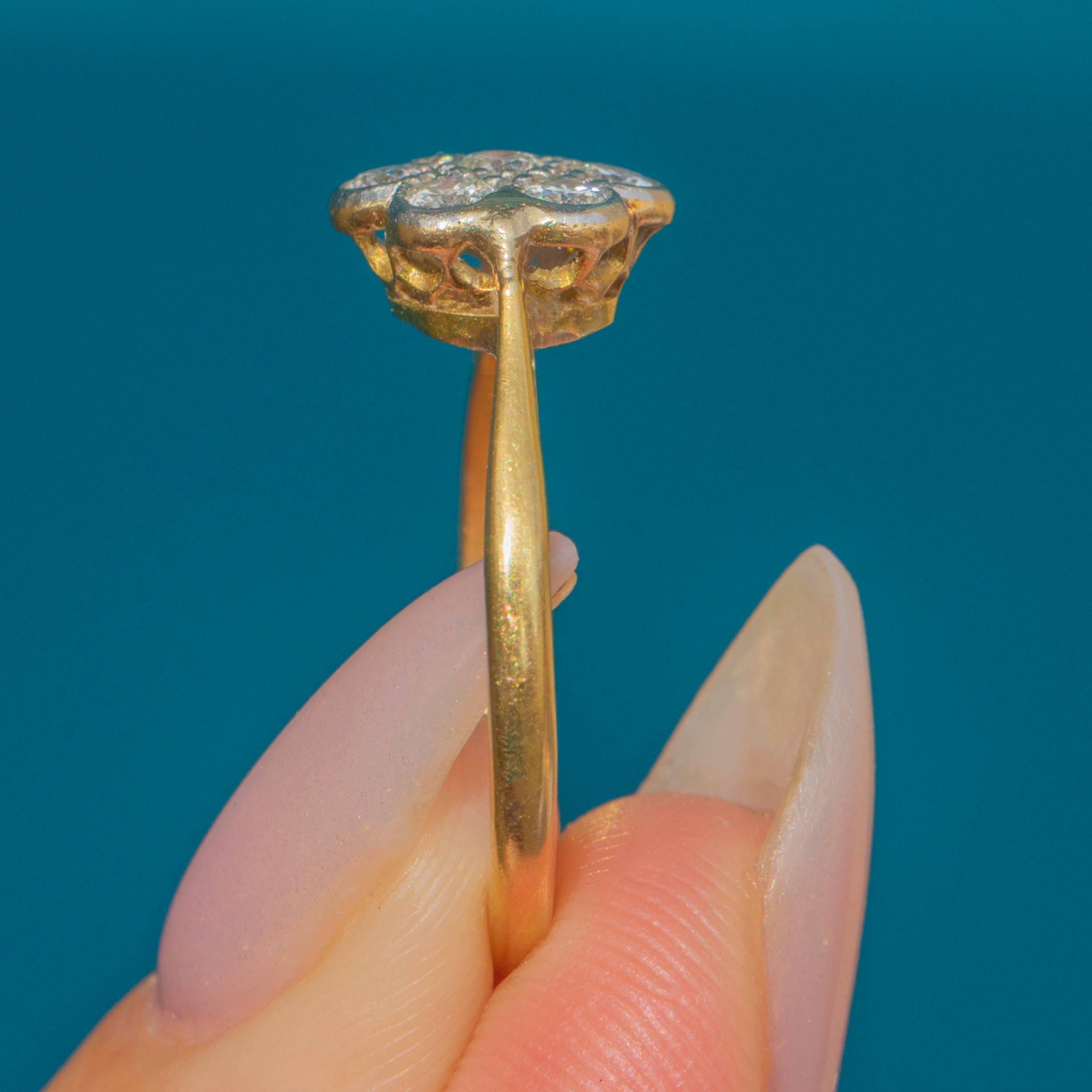 The cluster measures 8.5mm across, with a slim 18ct Gold band stamped “18CT” and “PLAT”. A classic engagement ring style of the early 20th century, this piece perfectly embodies the elegance and enduring appeal of the Art Deco era.