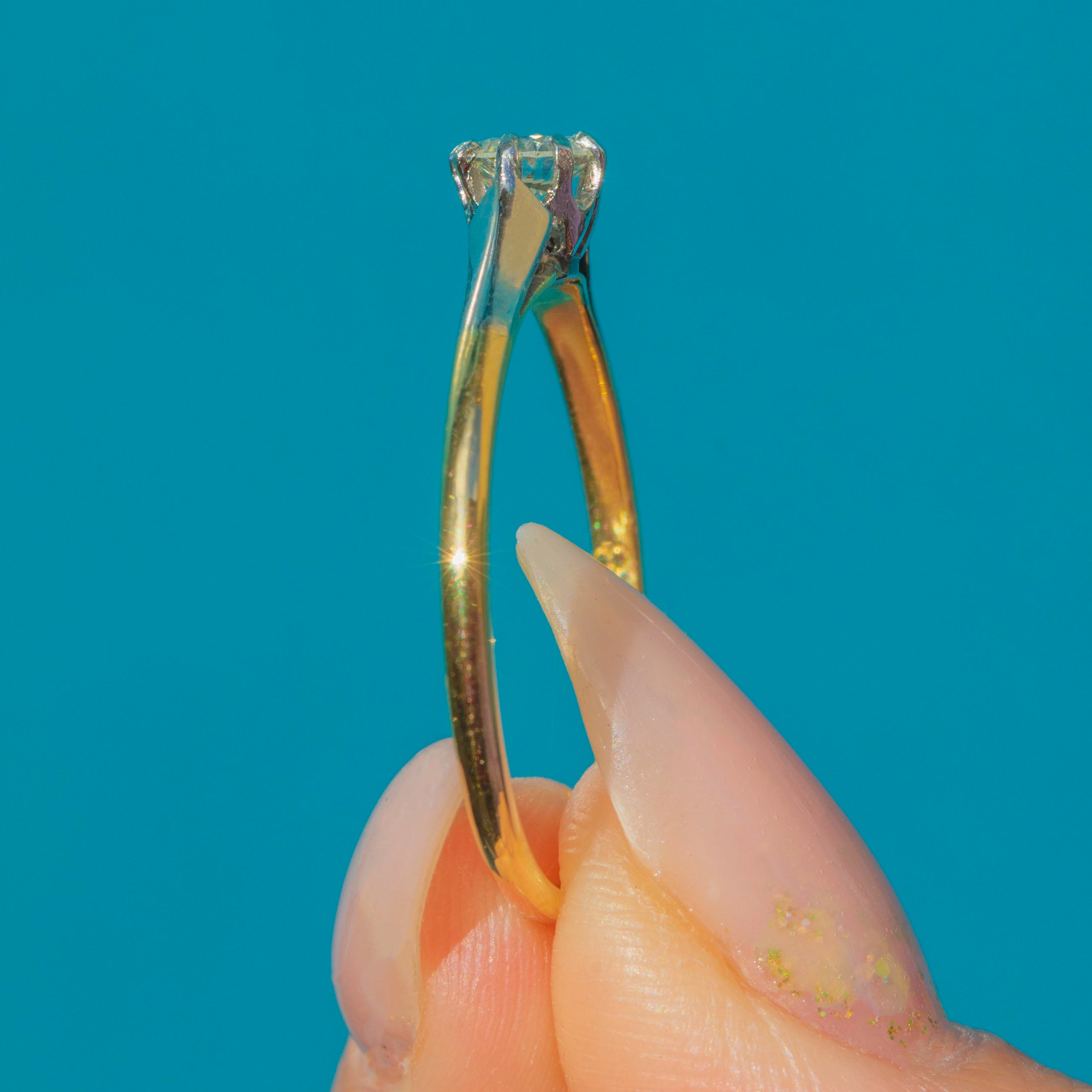 A classic Art Deco solitaire ring crafted in 18ct Yellow Gold with Platinum claw settings, set with a sparkling old cut Diamond of approx 0.15ct. The stone is exceptionally bright, graded around G/H colour with VS–VVS clarity, a rare quality for antique Diamonds.