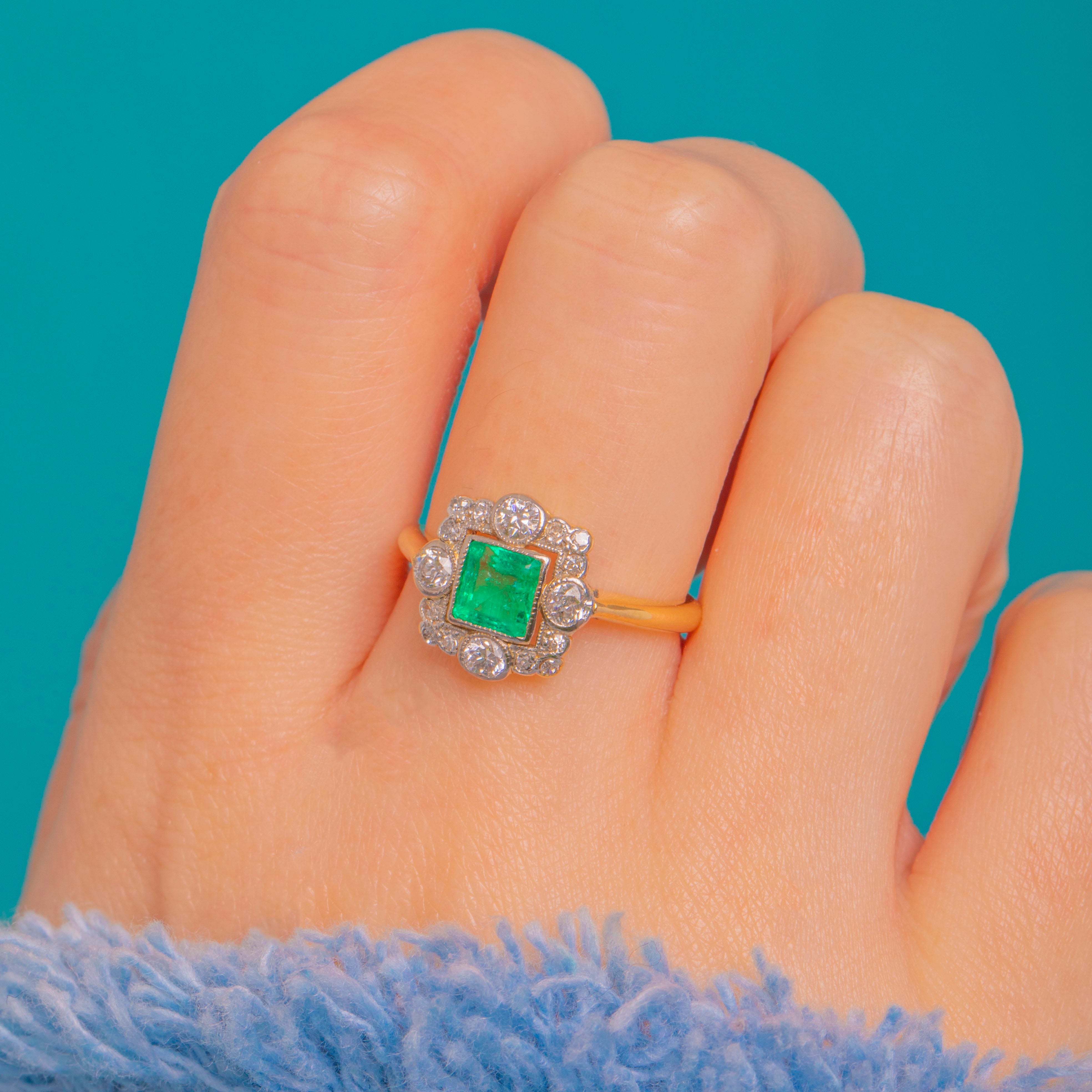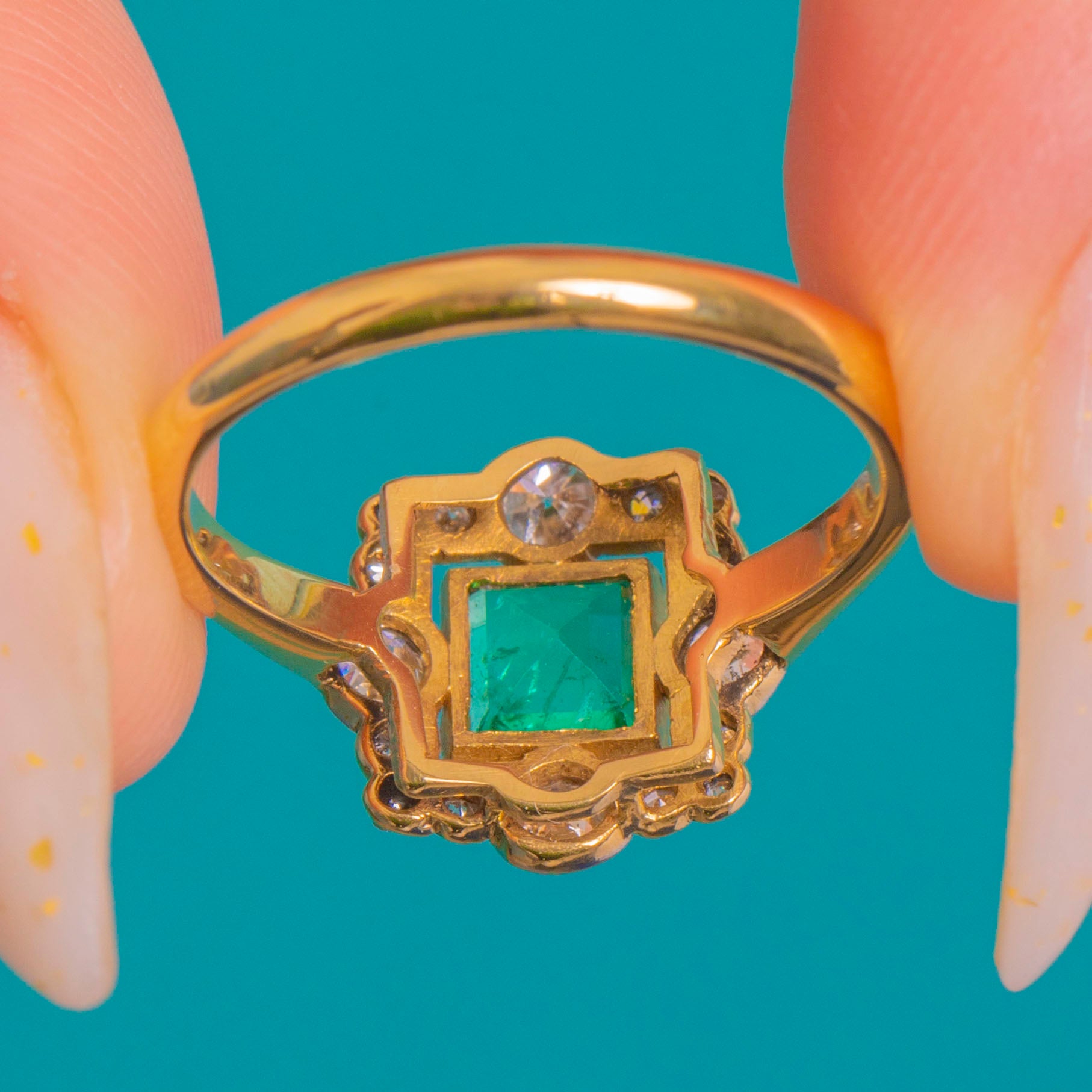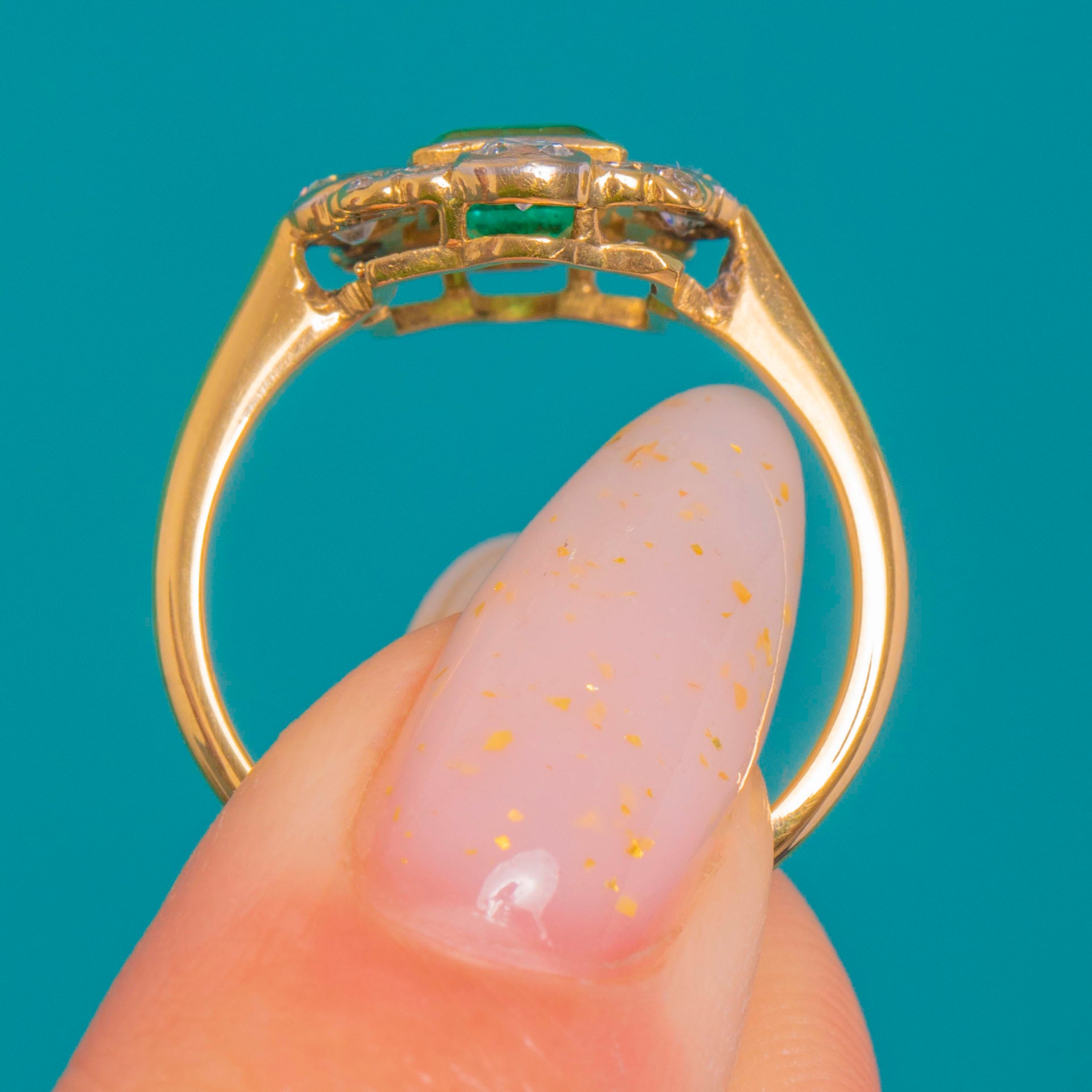 A captivating Art Deco cluster ring in luxuriously rich 18ct Yellow Gold, crowned with a grass‑green Emerald framed by shimmering Diamonds. The geometric square Emerald sits at the heart of a scalloped cushion halo, with four slightly larger Diamonds at the compass points for a crisp, symmetrical finish. Crisp milgrain edges and an elevated, open basket gallery lend an architectural lightness that feels refined and timeless.