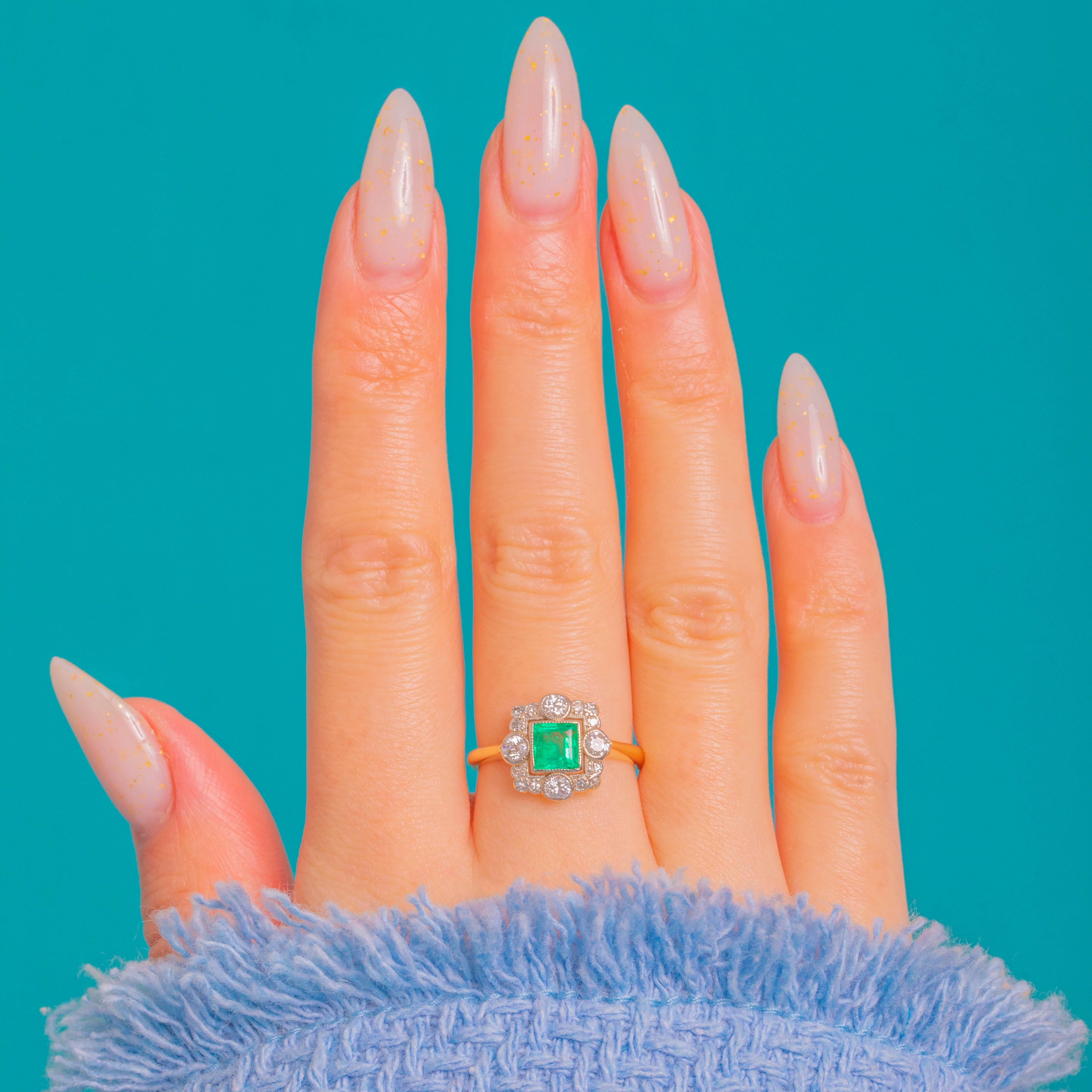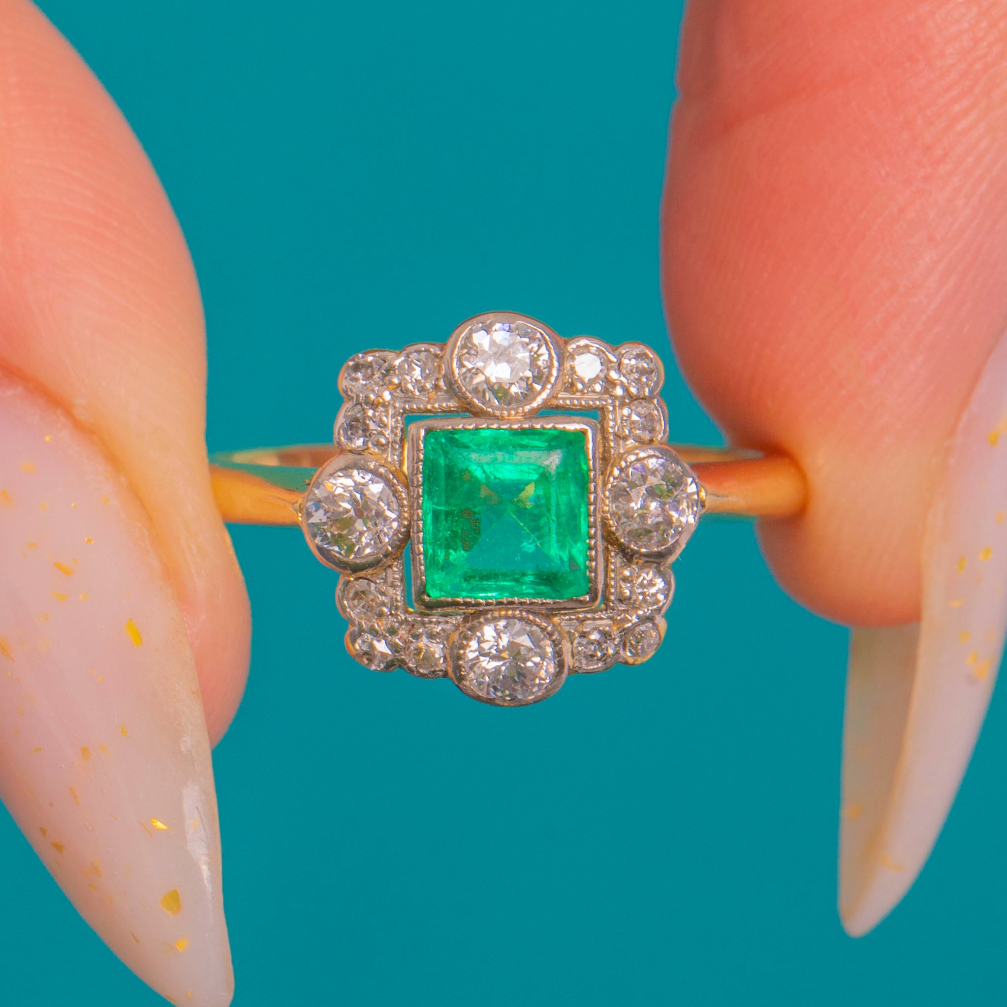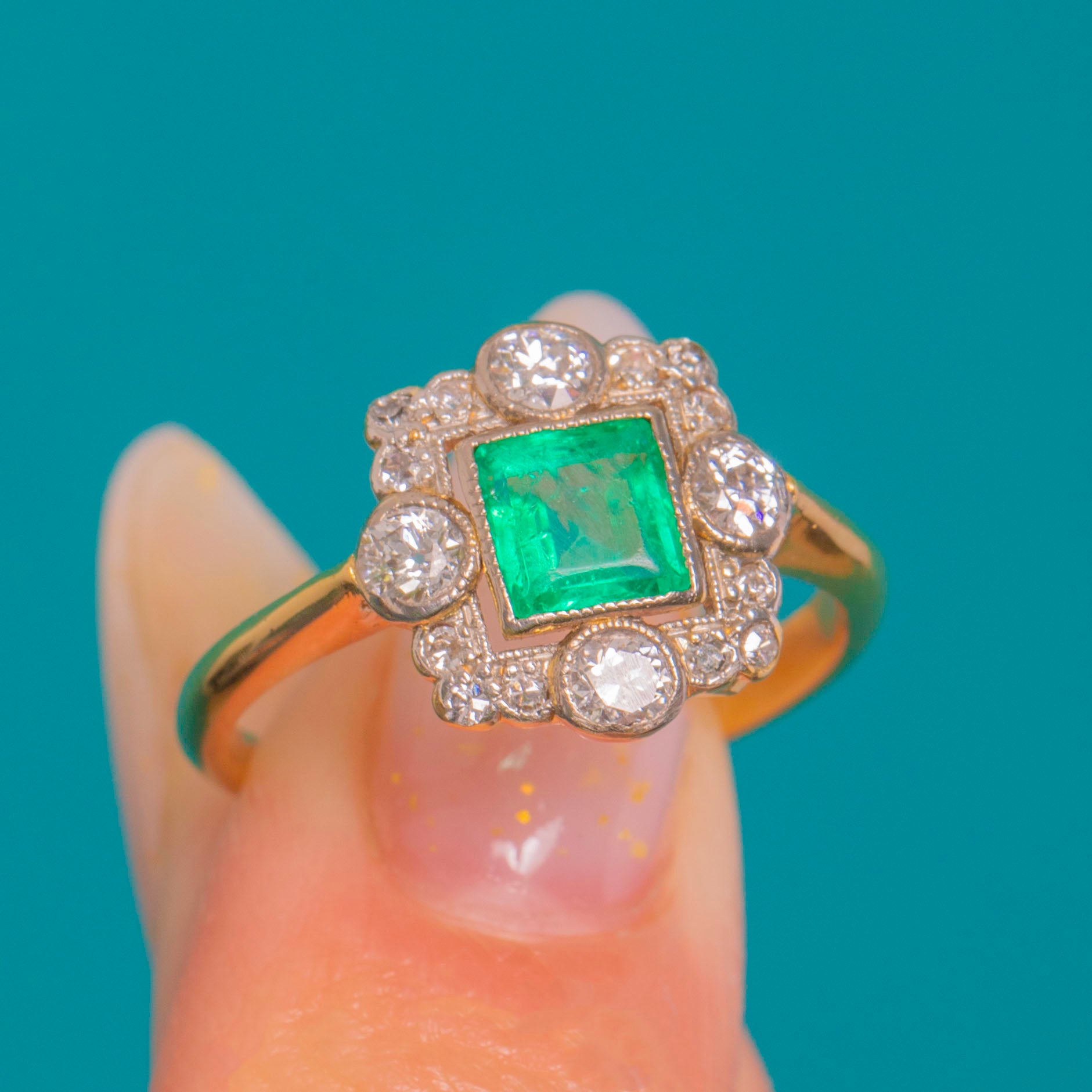 A captivating Art Deco cluster ring in luxuriously rich 18ct Yellow Gold, crowned with a grass‑green Emerald framed by shimmering Diamonds. The geometric square Emerald sits at the heart of a scalloped cushion halo, with four slightly larger Diamonds at the compass points for a crisp, symmetrical finish. Crisp milgrain edges and an elevated, open basket gallery lend an architectural lightness that feels refined and timeless.