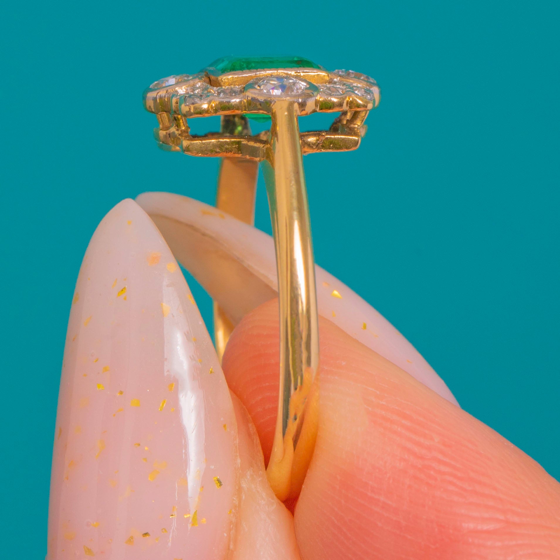 EXCELLENT: The Emerald is in excellent condition with no chips, cracks or abrasions, displaying a vibrant grass‑green hue and lovely clarity. The Diamonds are bright and securely set, with crisp milgrain detailing throughout the halo. The 18ct Gold shank and settings show only light surface wear commensurate with age, with no visible resizing seams or repairs.