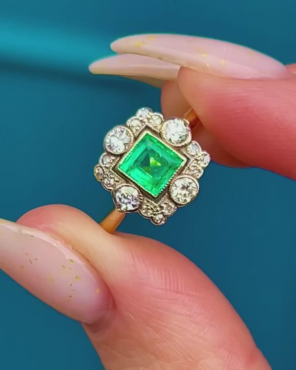 Art Deco 18ct Gold Emerald Diamond Cluster Engagement Ring