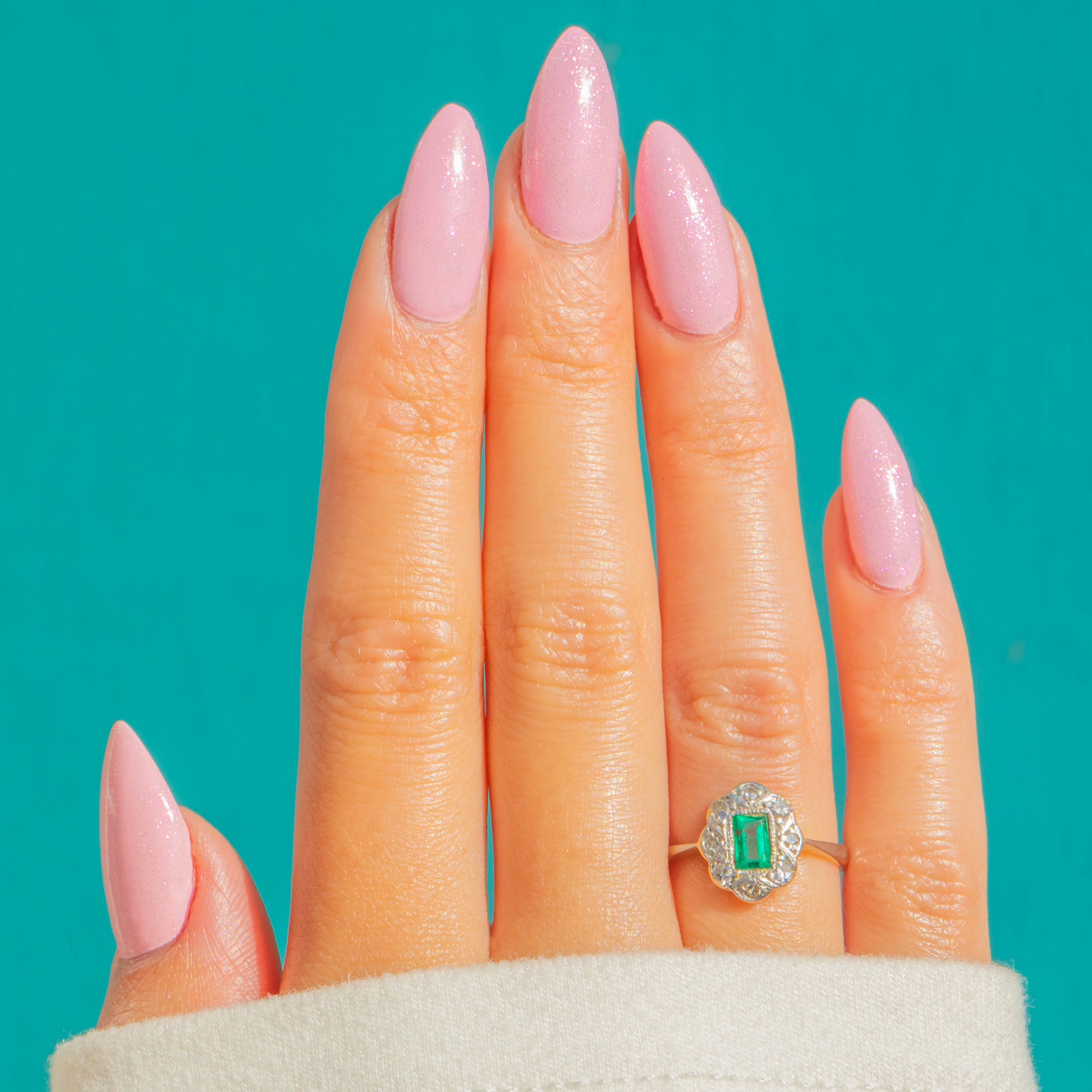VERY GOOD: The Emerald and Diamonds are bright with no obvious chips or missing stones, showing light surface wear commensurate with age. The Platinum-topped settings and milgrain retain crisp detail with gentle patina, and all stones appear secure. The 18ct Gold shank is slightly out of round with a faint inner seam suggestive of past sizing, remaining strong and ready to wear.