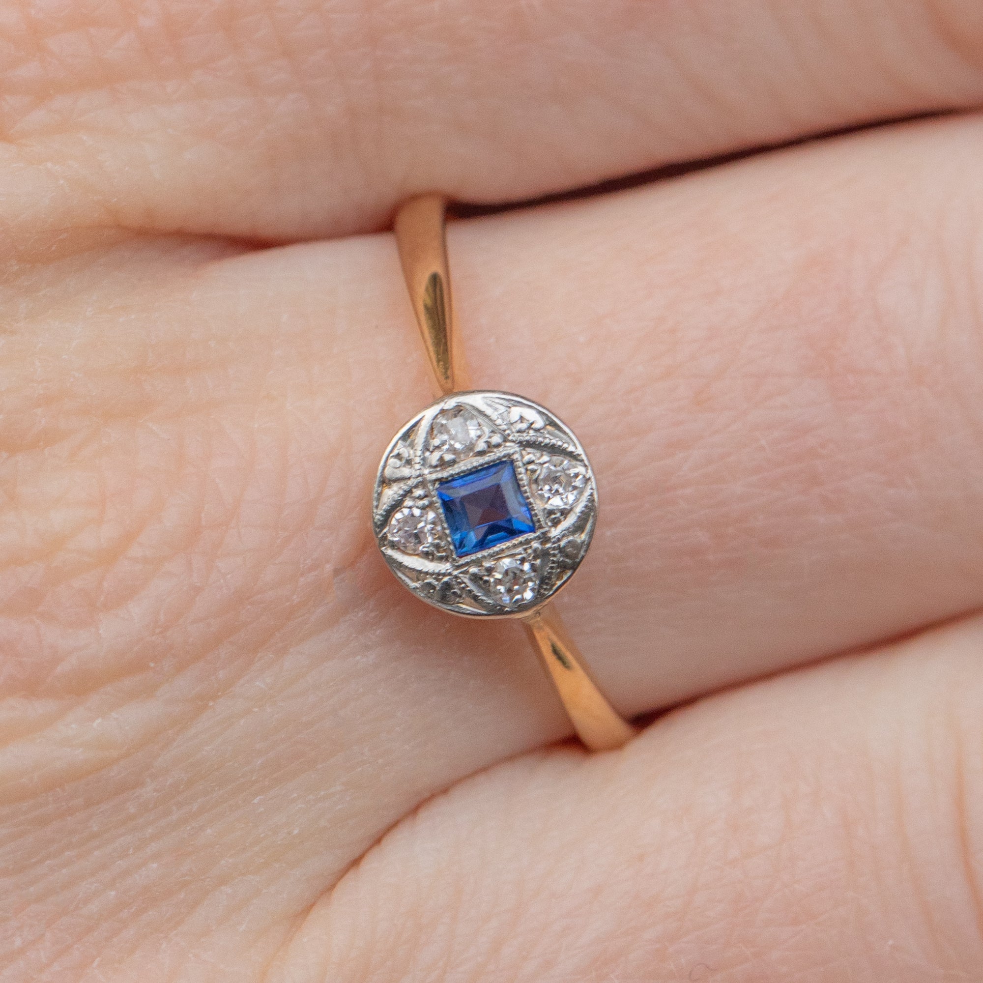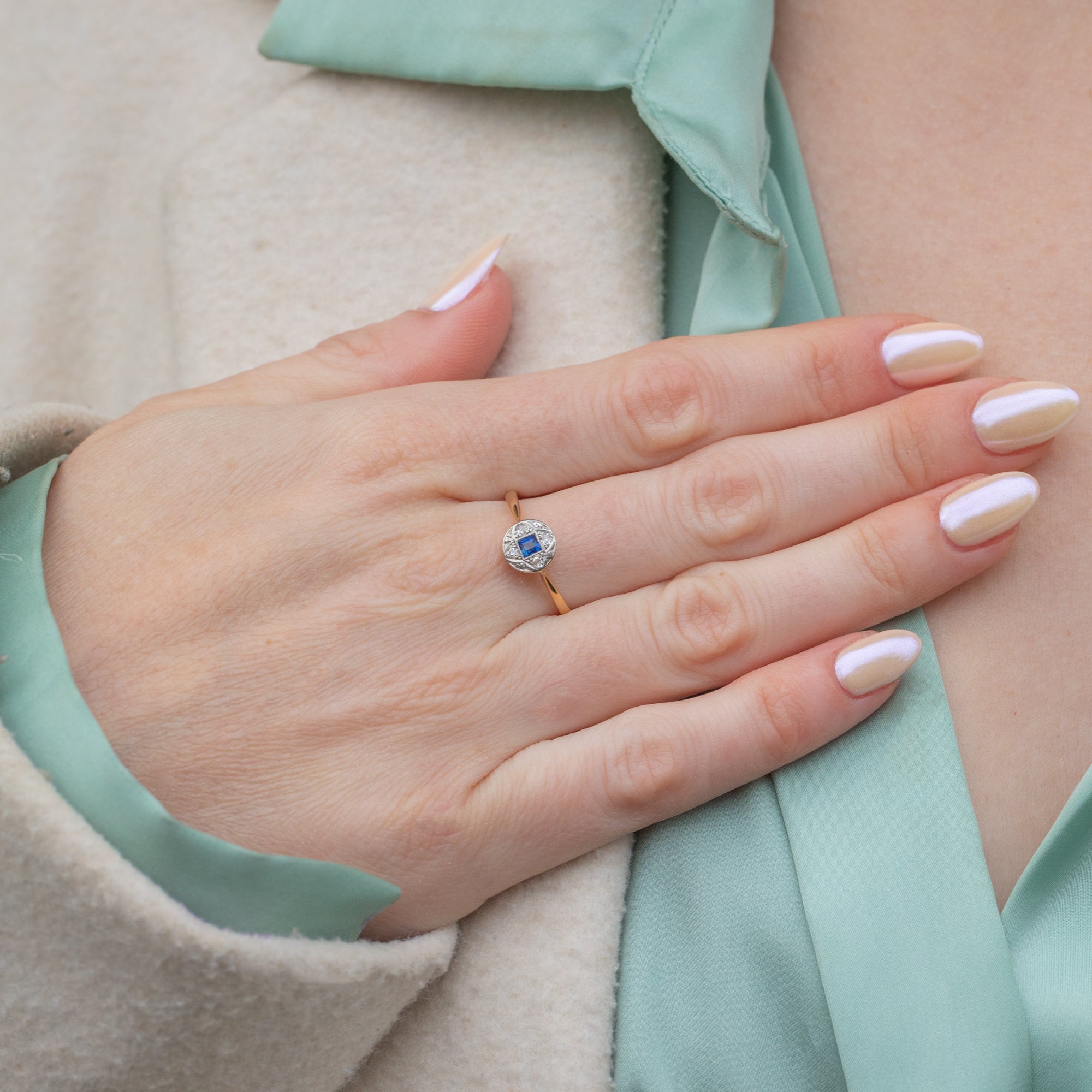 This Art Deco 18ct Gold & Platinum Sapphire Diamond cluster ring will make a timeless addition to your collection!