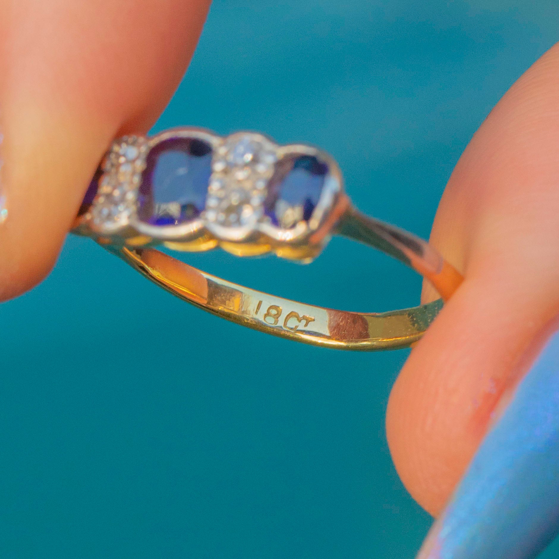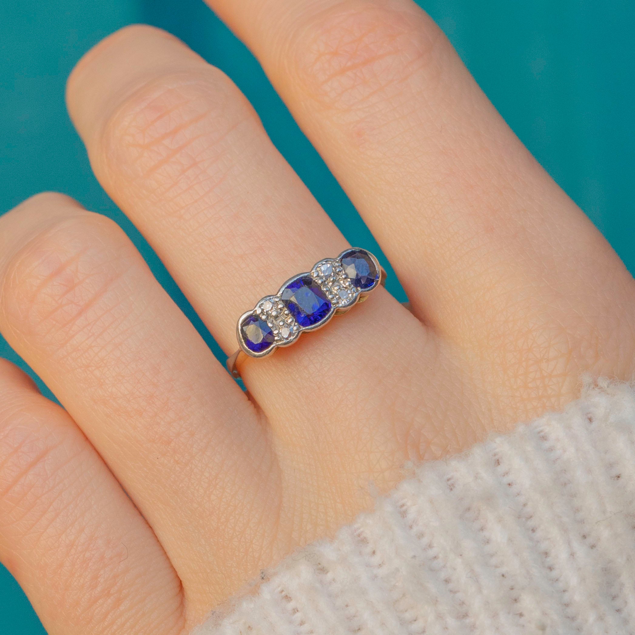 This antique ring features three radiant Sapphires, each a rich navy blue which gleam fantastically as they catch the light. They are interspersed by four scintillating Diamonds, with each gemstone effortlessly complimenting the next.