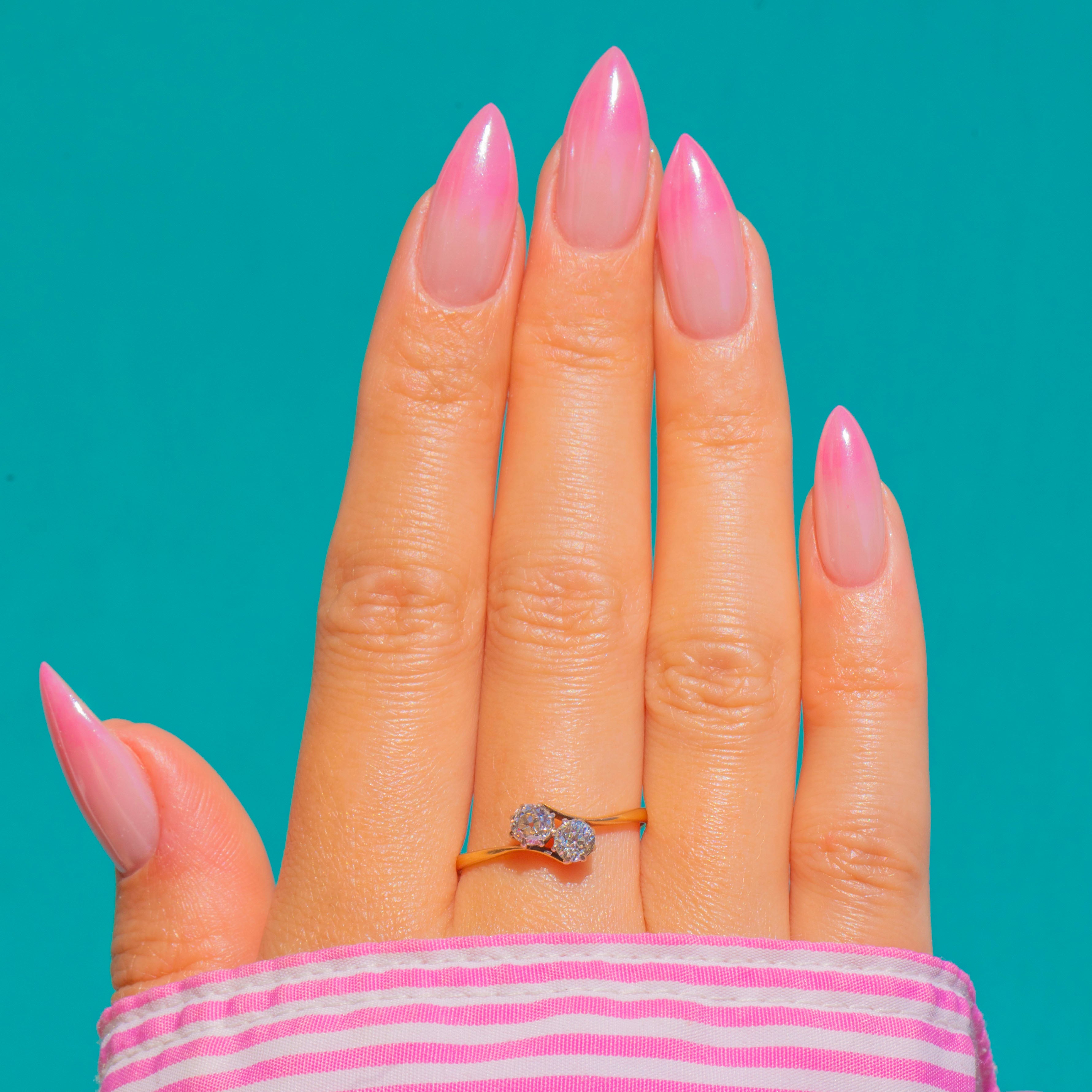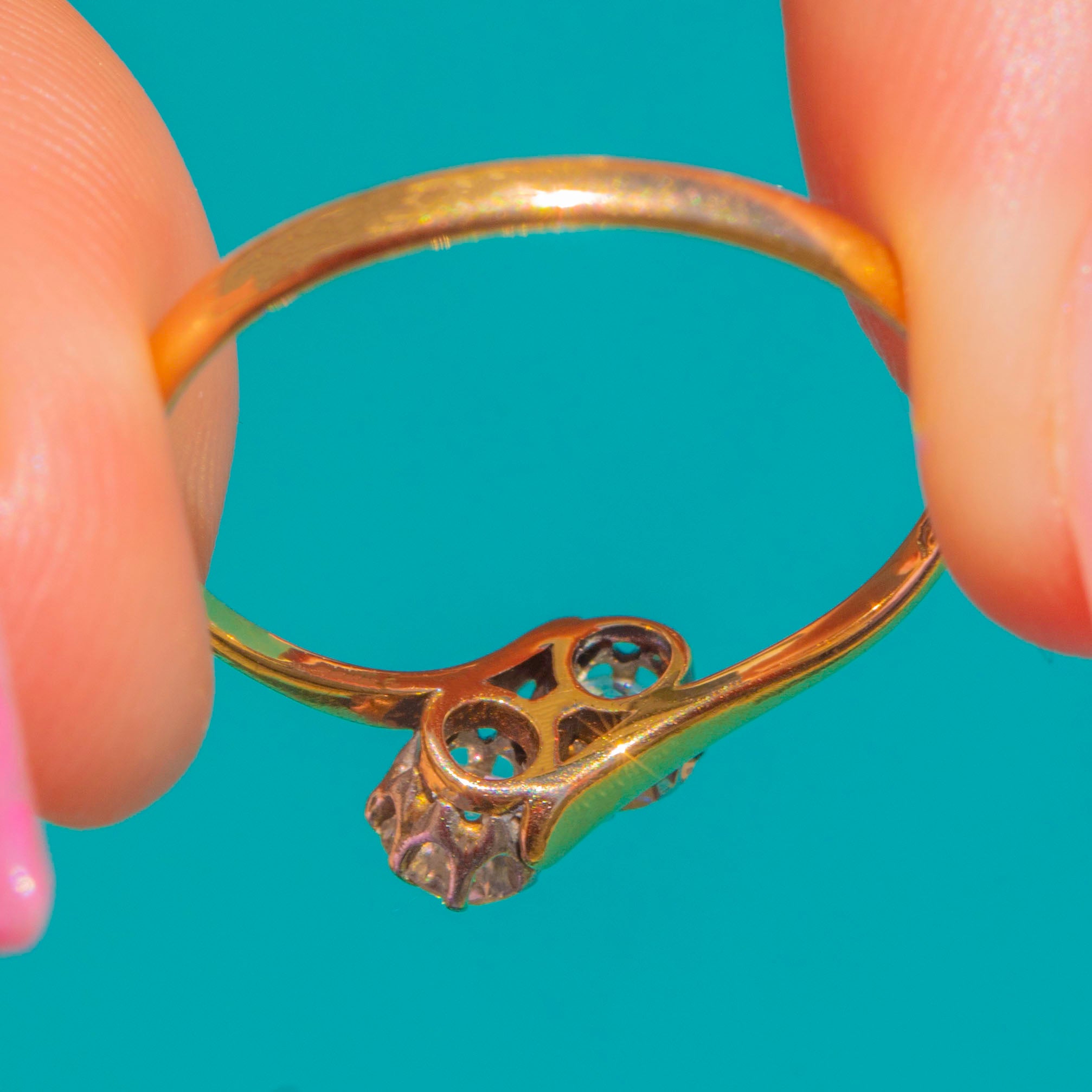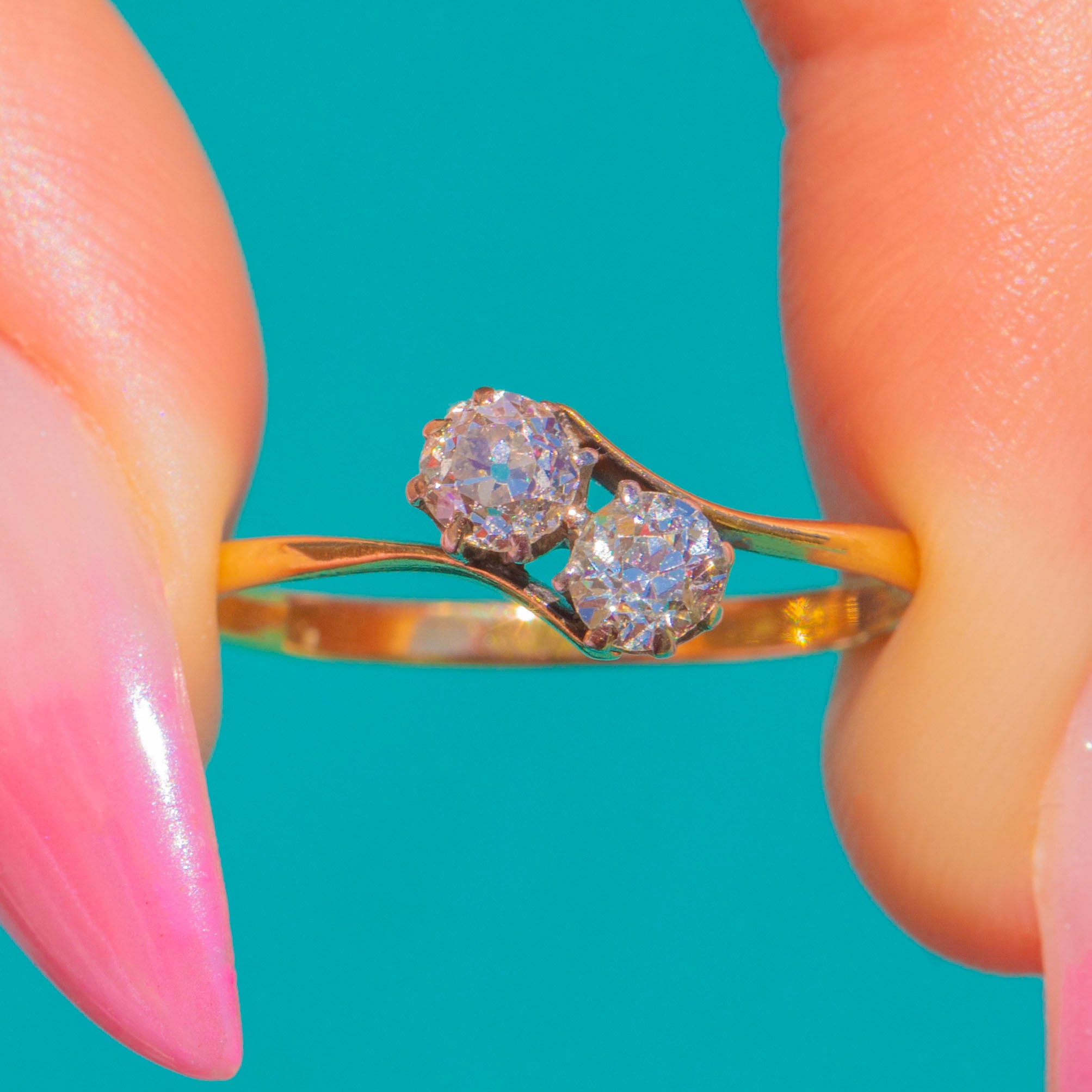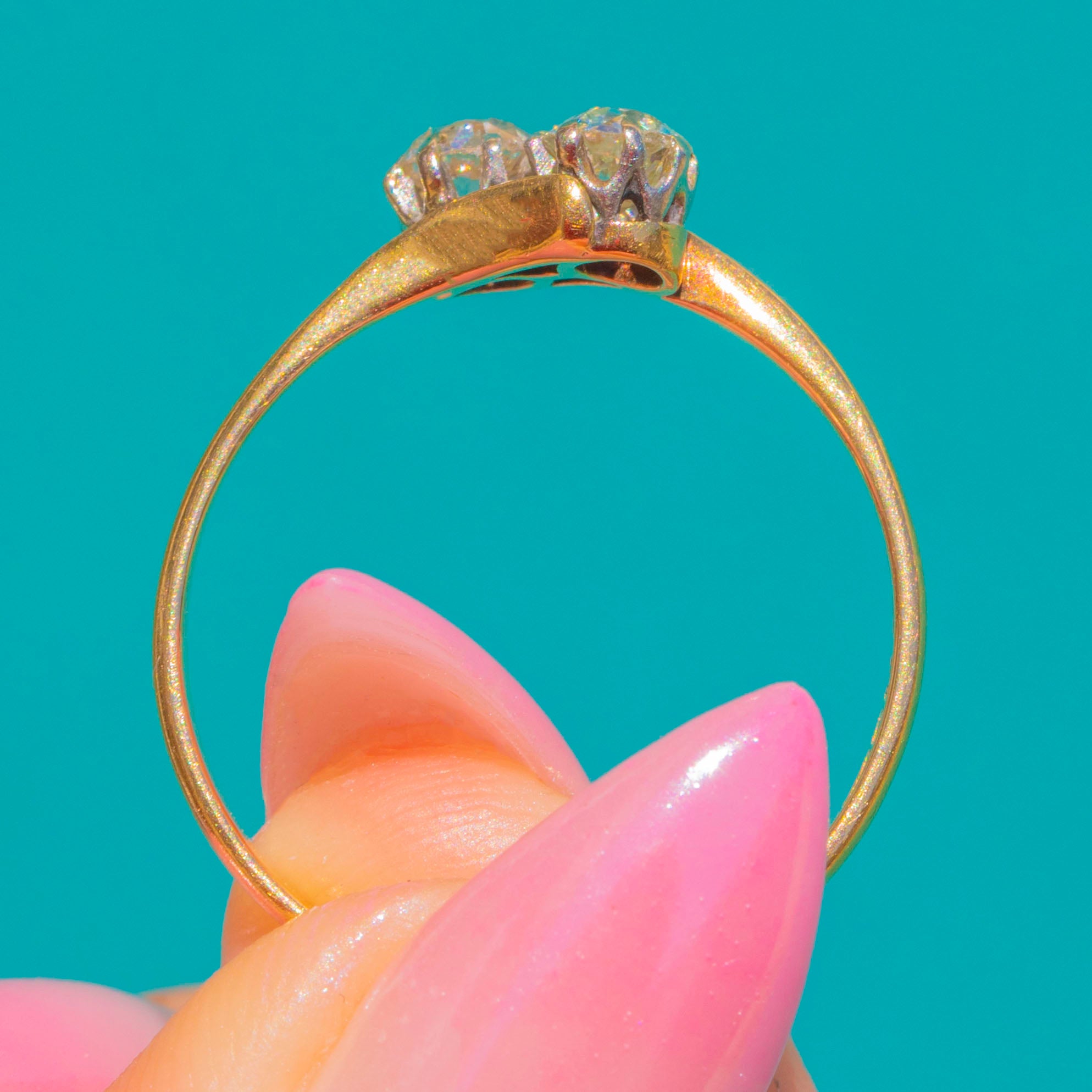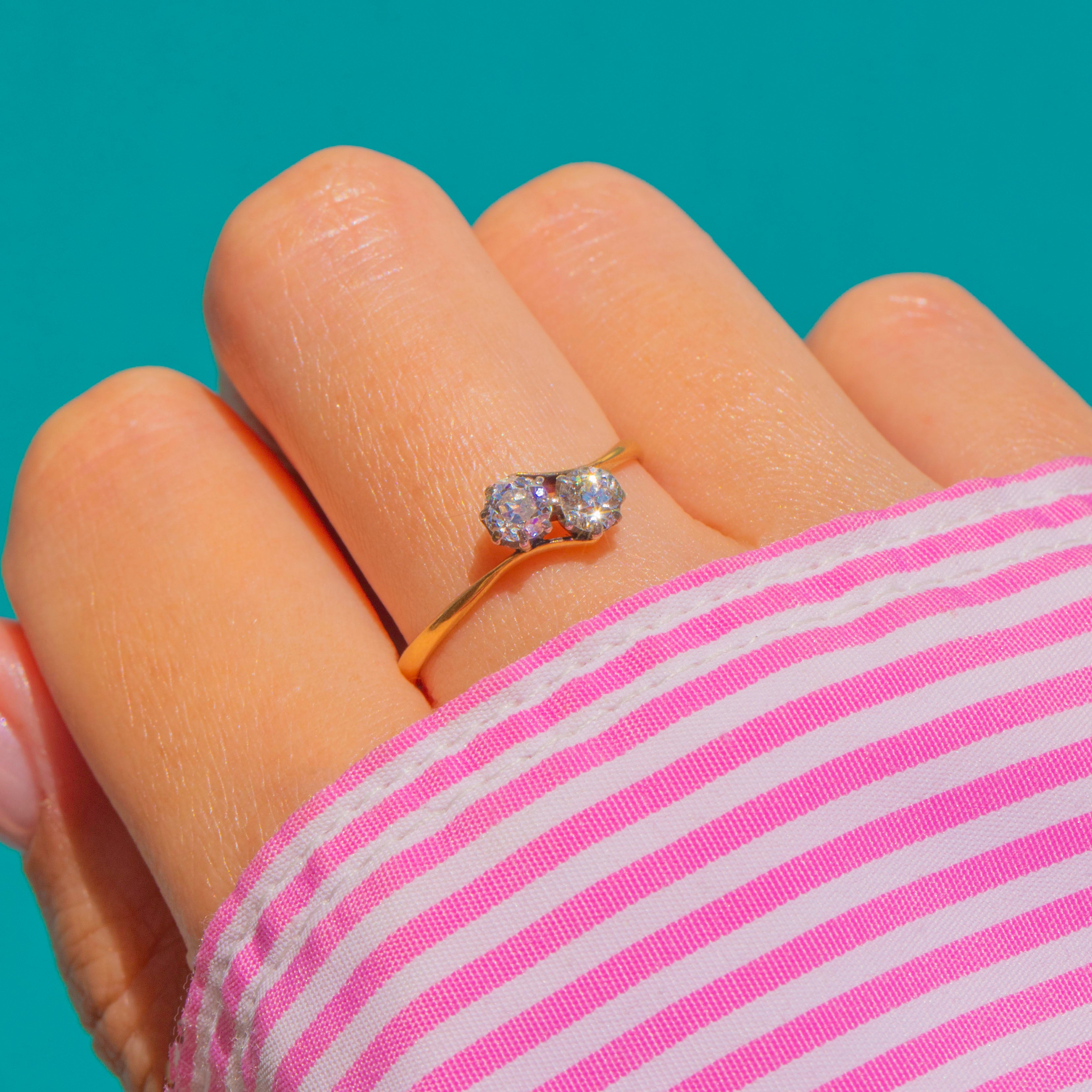 A lyrical Art Deco toi-et-moi Diamond ring, the timeless symbol of “you and me” united as one. Two charming Old Mine Cut Diamonds nestle side by side in Platinum claw heads, poised above an elegant 18ct Gold shank with delicately split shoulders and a lightly pierced foliate gallery. The mixed-metal palette lends a refined glow: cool Platinum to amplify the Diamonds’ sparkle, warmed by the buttery sheen of Gold.