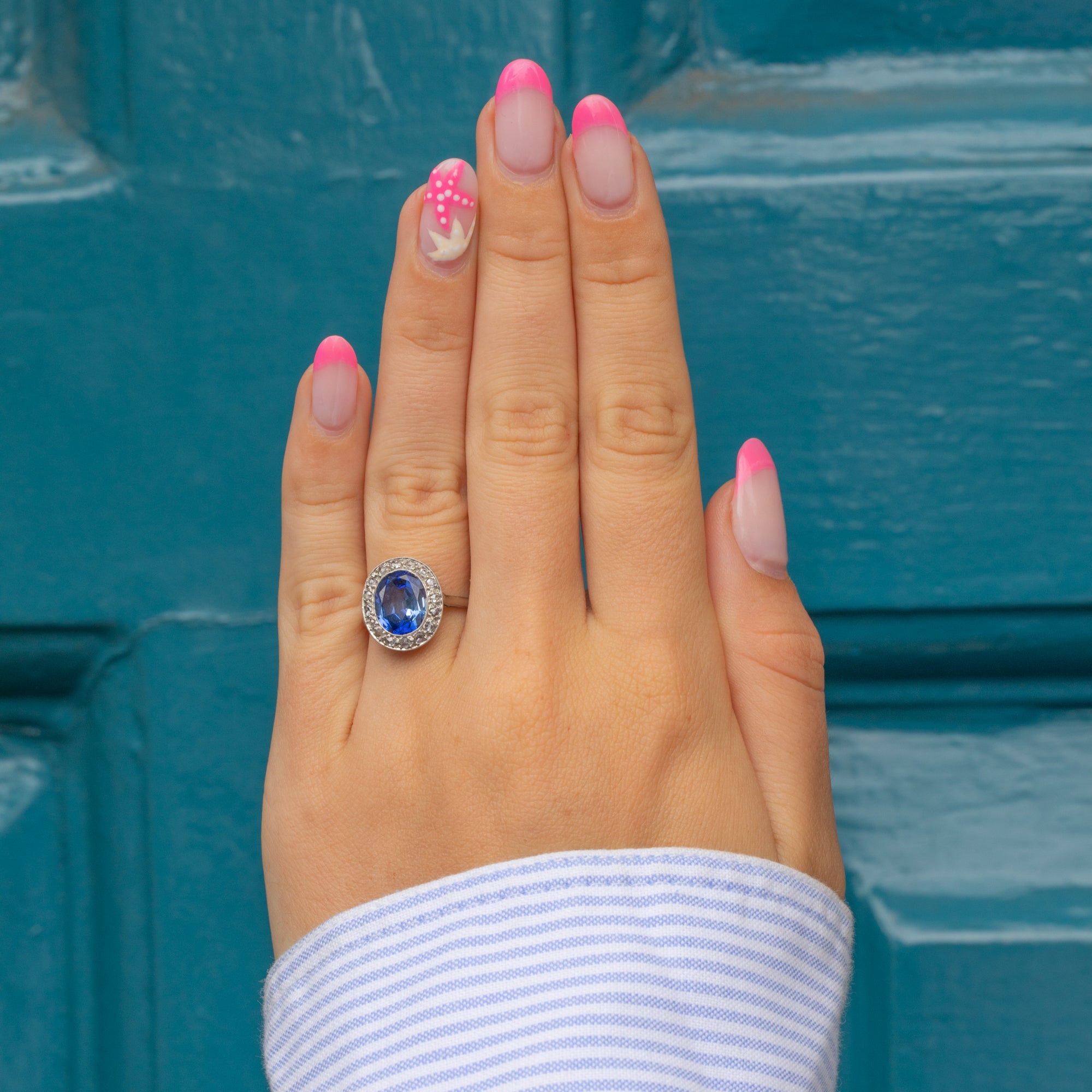 Art Deco 18ct Gold Sapphire Diamond Cluster Ring, 3.20ct Sapphire