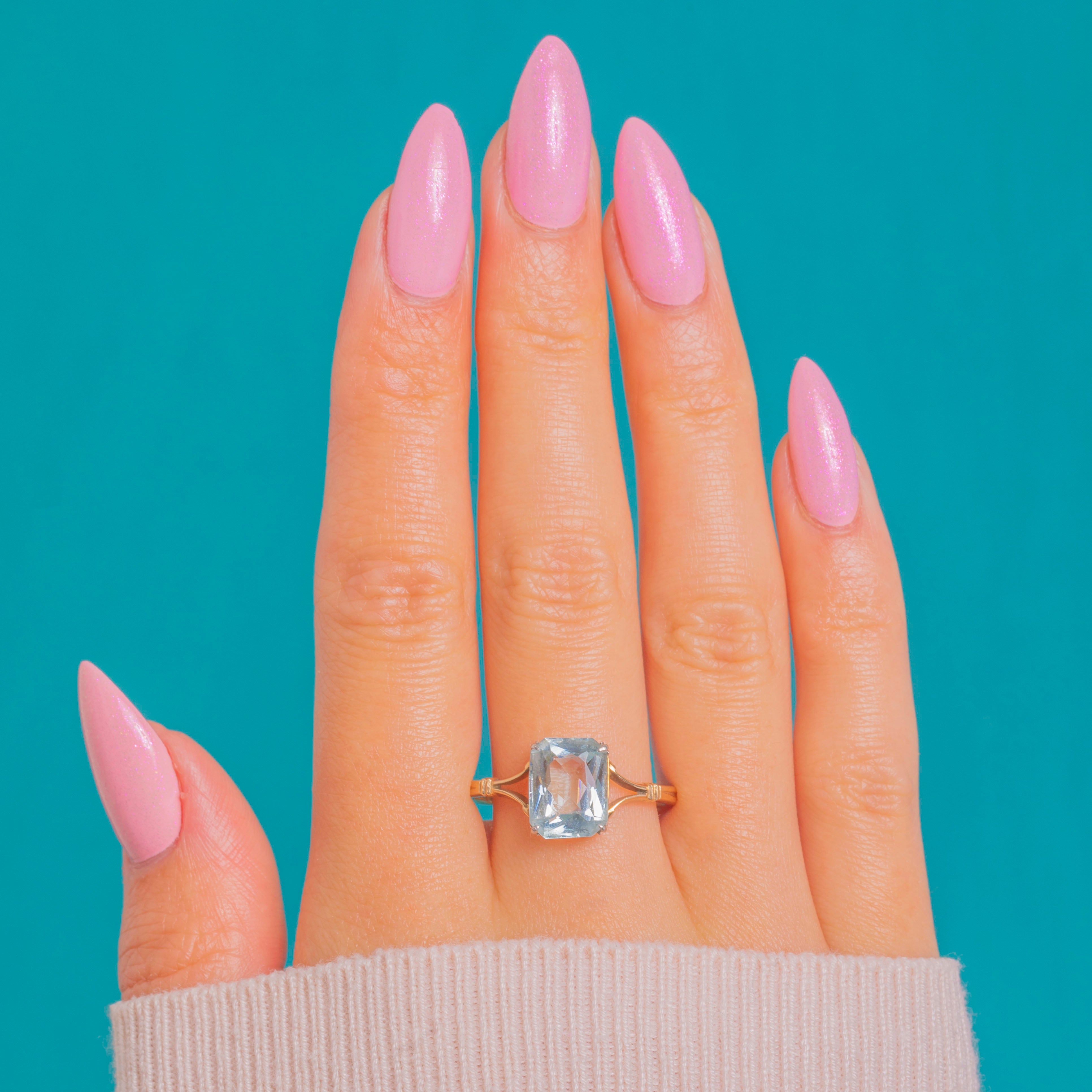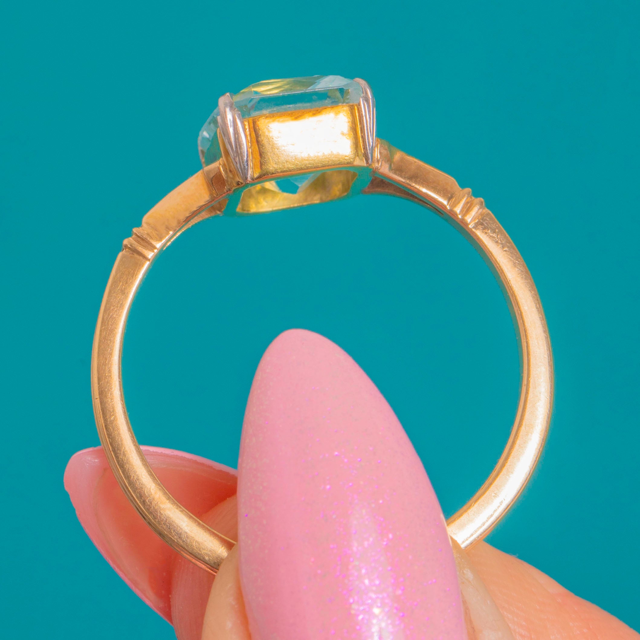 A luminous 4.70ct Aquamarine takes centre stage in this Art Deco solitaire. The emerald-cut gem shows a serene, icy blue, held in a white Platinum claw head with an open gallery that lets the light pour through. A slender 9ct Gold shank with split, tapered shoulders and subtle ribbed detailing draws the eye to the crisp rectangular table.