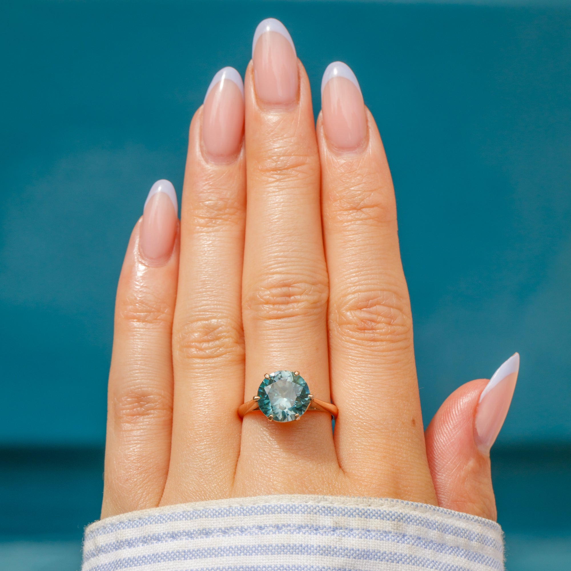 In her centre sits a radiant azure 2.85ct Zircon, faceted wonderfully and revealing icy cool hues as she catches the light. The Zircon is set within warm 9ct Gold claws, with a tall profile and ornate gallery in quintessentially Art Deco style.