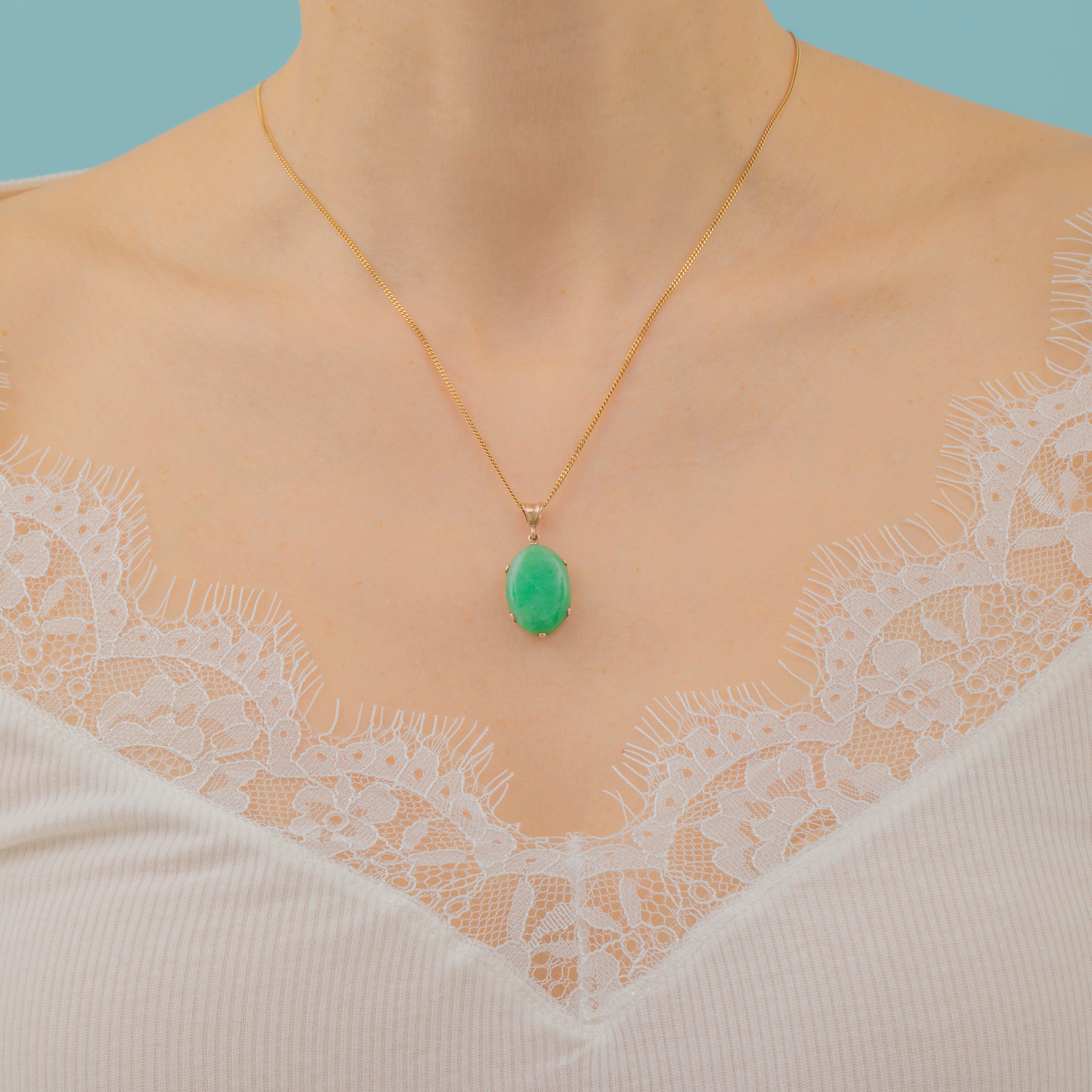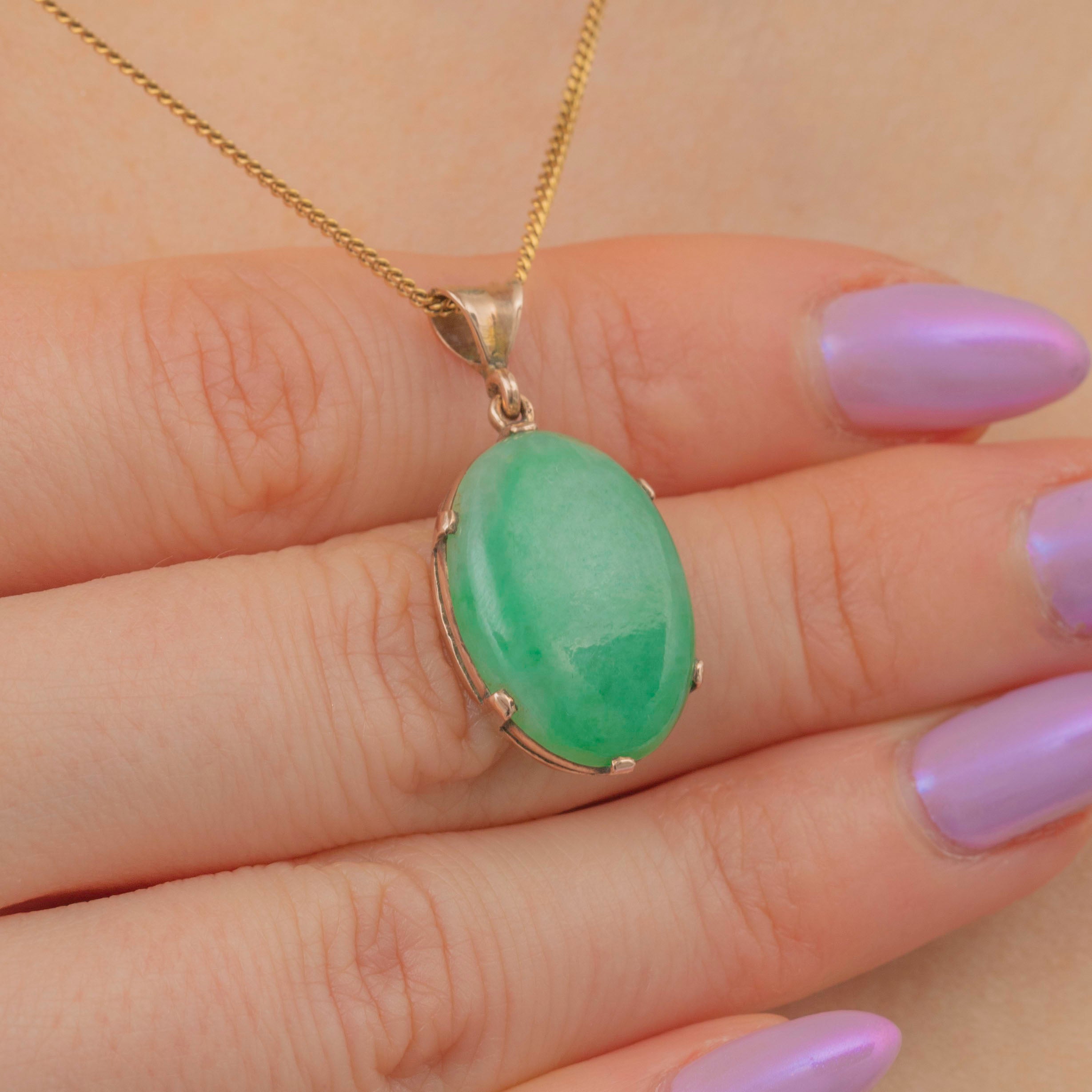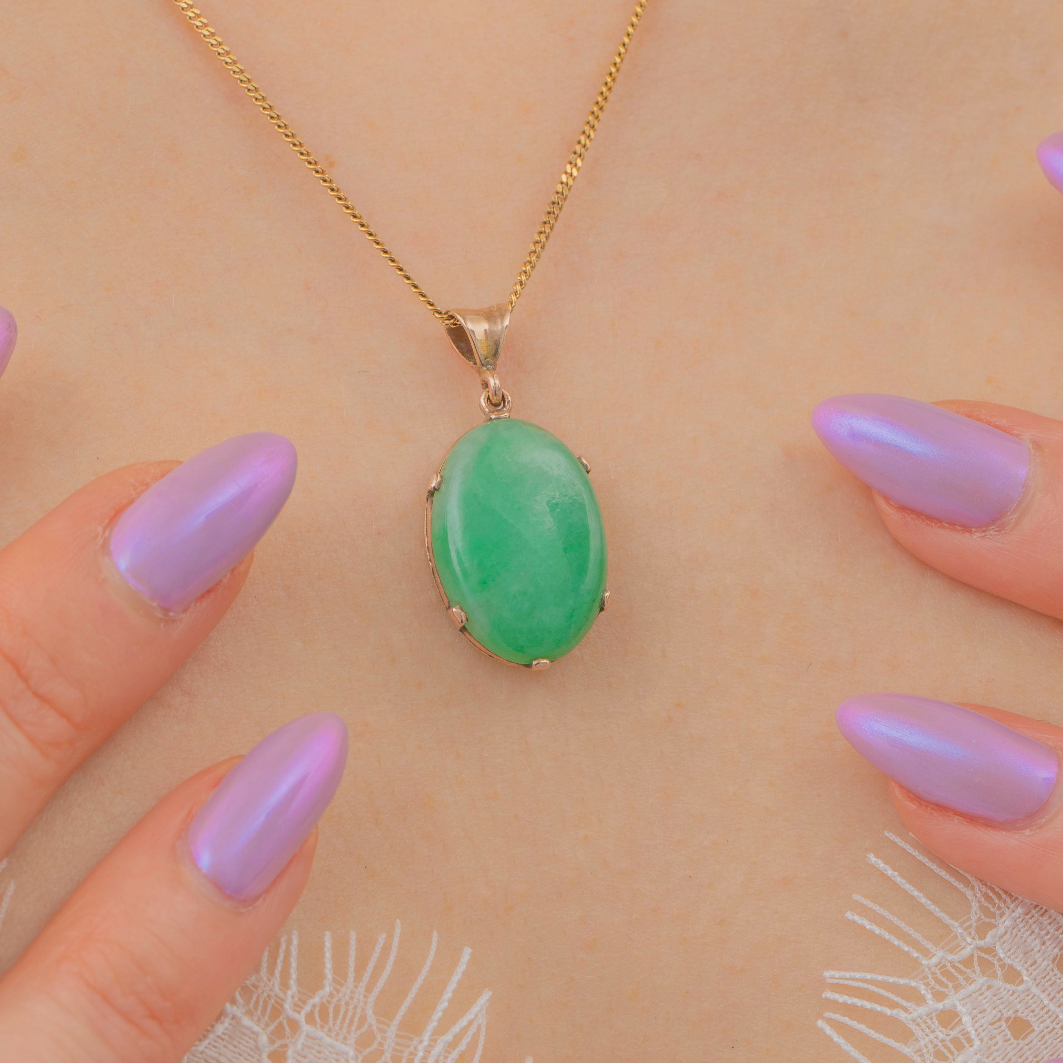 Add a vibrant pop of colour to your décolletage with this Art Deco 9ct Gold Jade cabochon pendant!