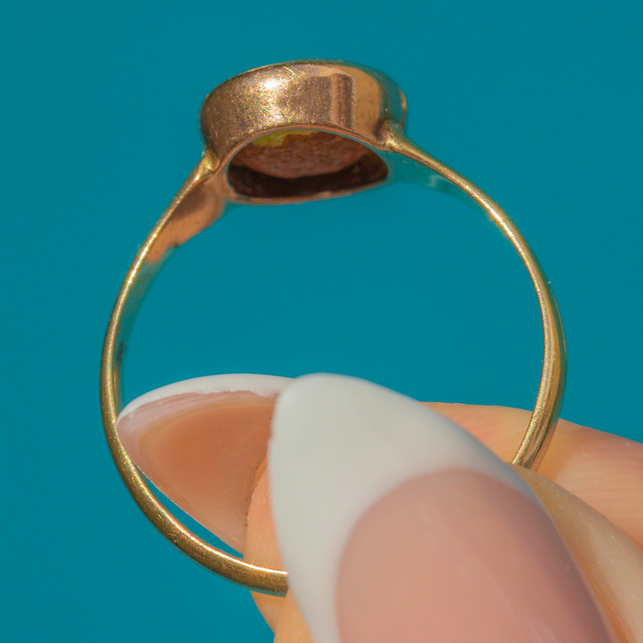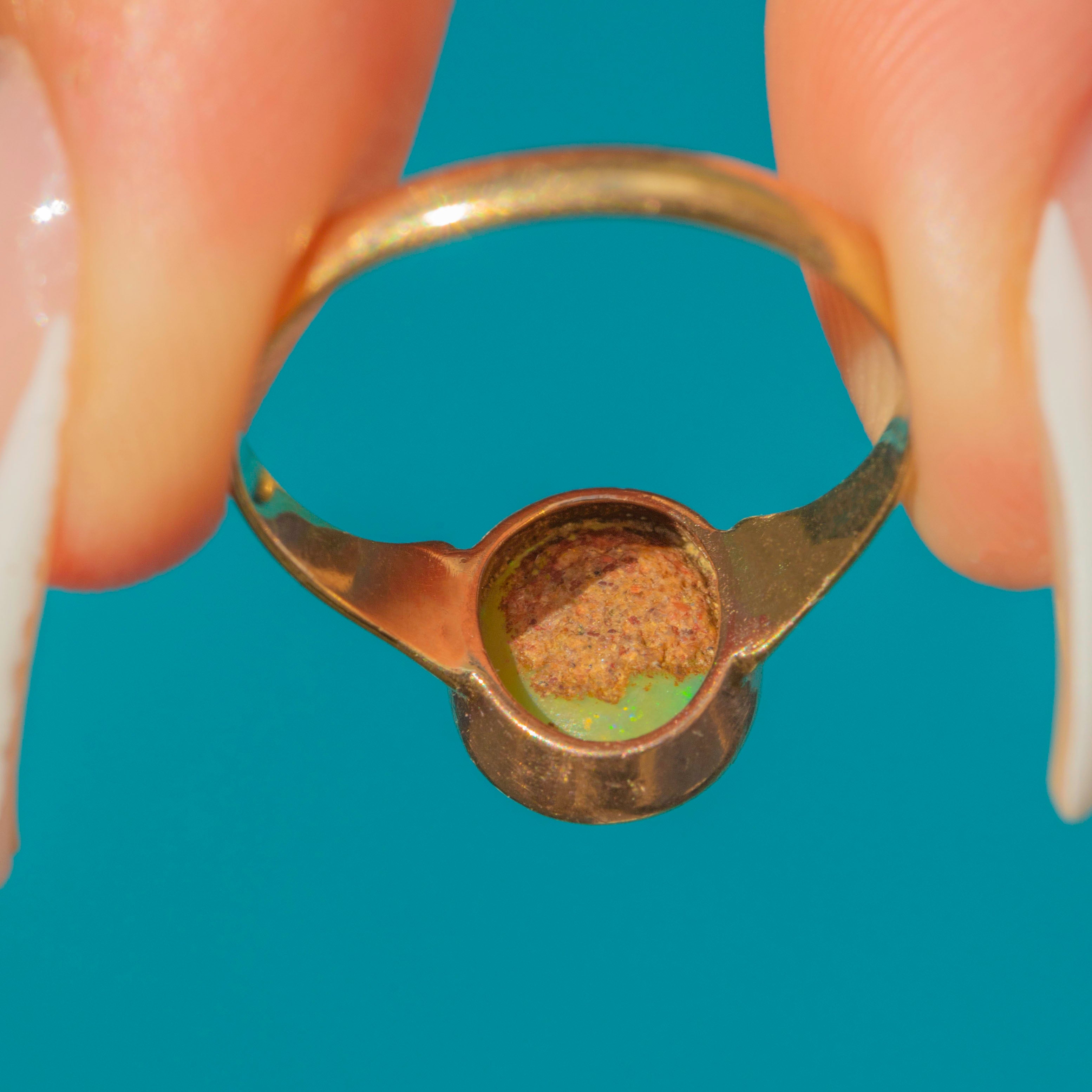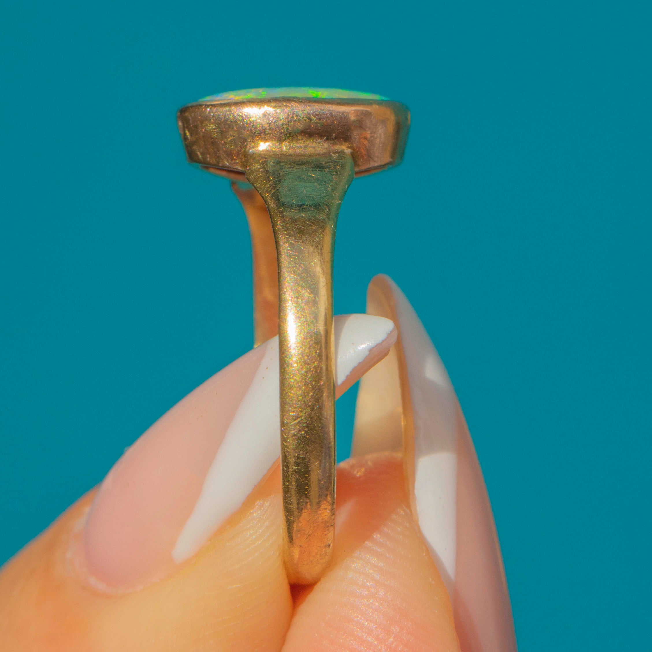 A striking Art Deco Opal ring crafted in 9ct Gold, fully hallmarked for Birmingham 1930. The bezel-set oval cabochon displays a kaleidoscope of neon green, turquoise, lilac and flashes of orange, all shimmering with the magical play of colour for which Opals are so admired.