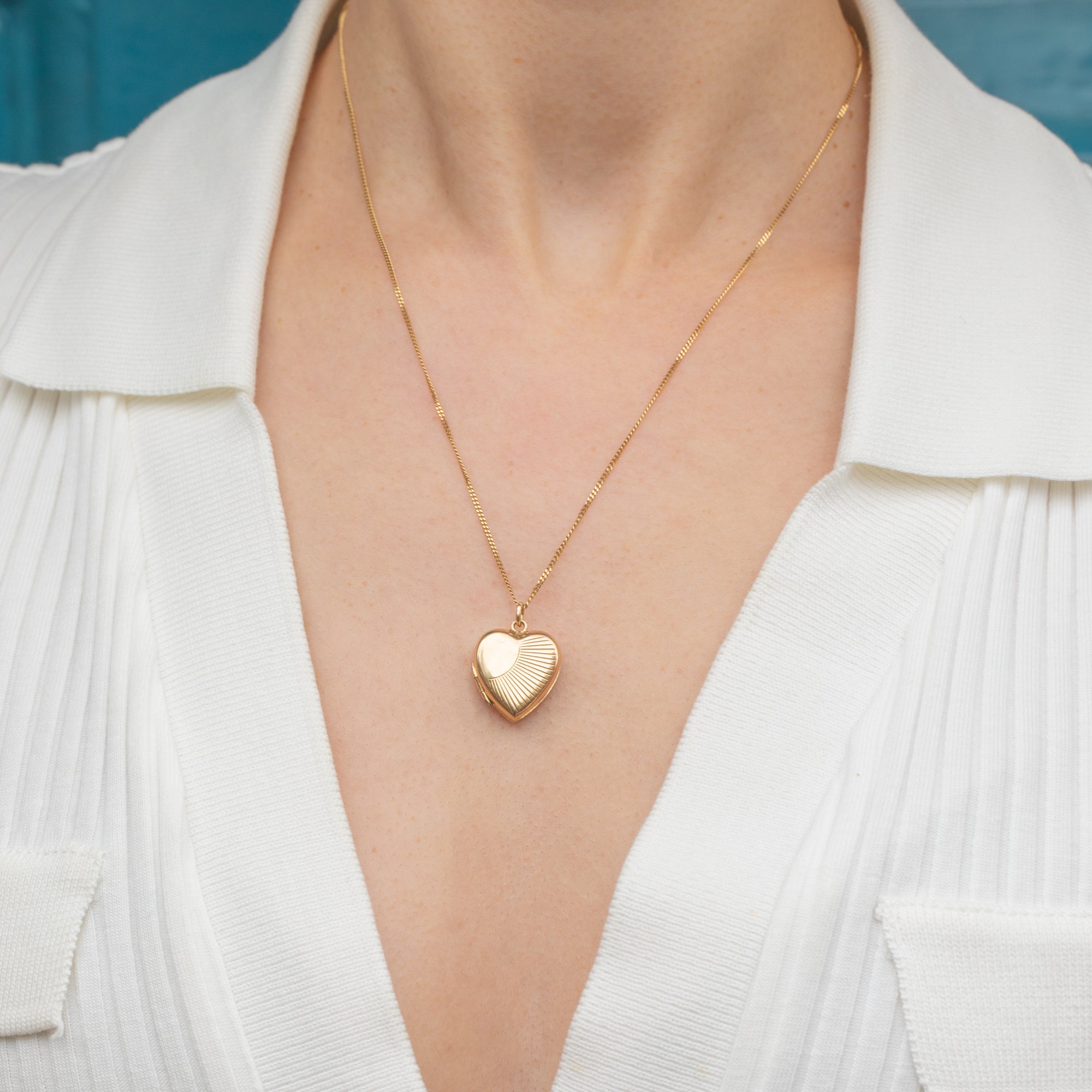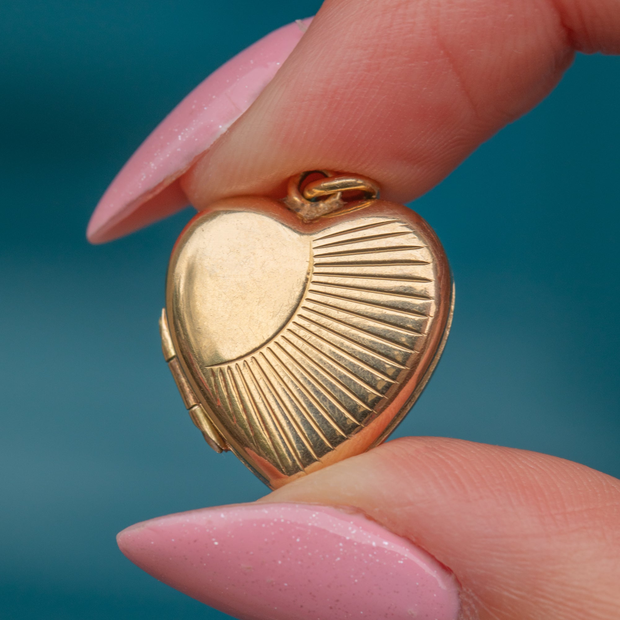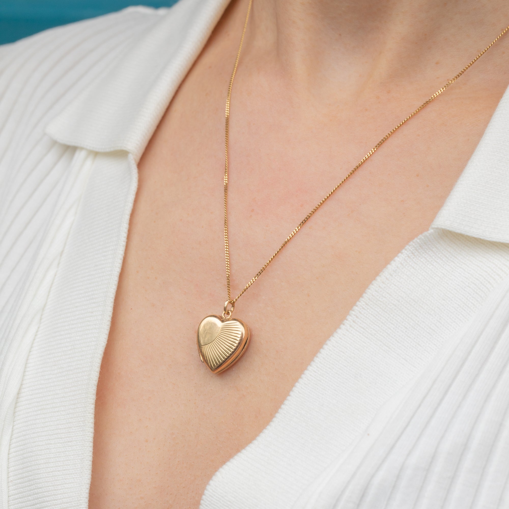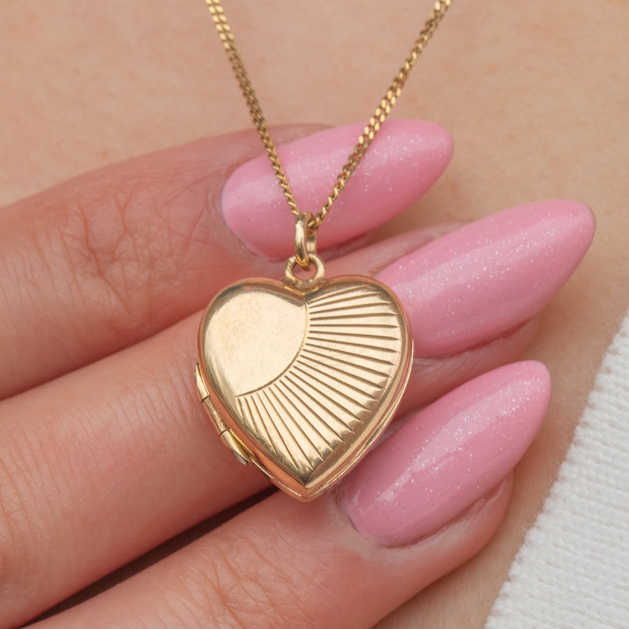 Crafted from buttery warm 9ct Gold, she features a gorgeous 'sunburst' engraving on her front, radiating charm. This petite Art Deco locket opens to reveal two doors, allowing you to keep a cherished keepsake or photograph close to your heart at all times.