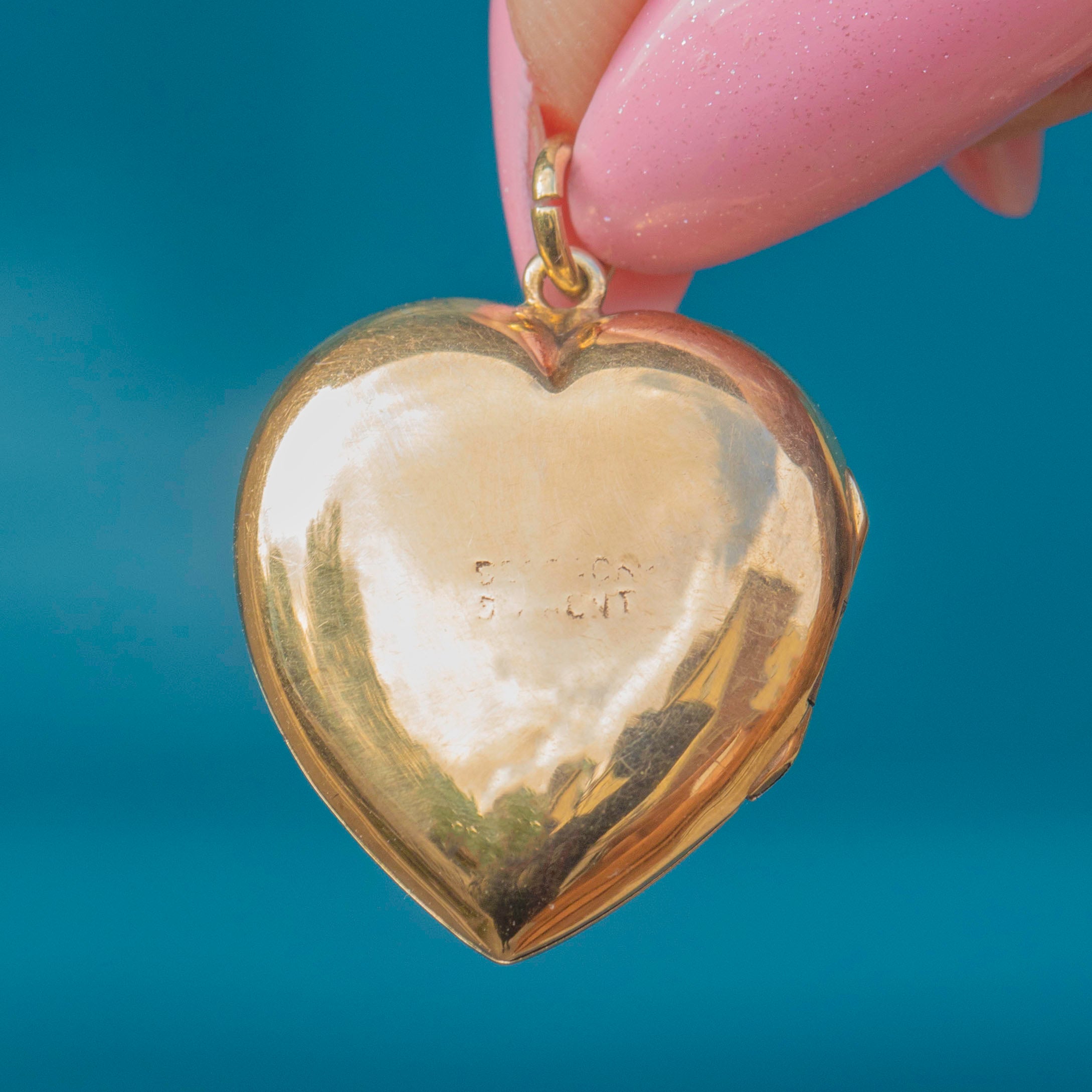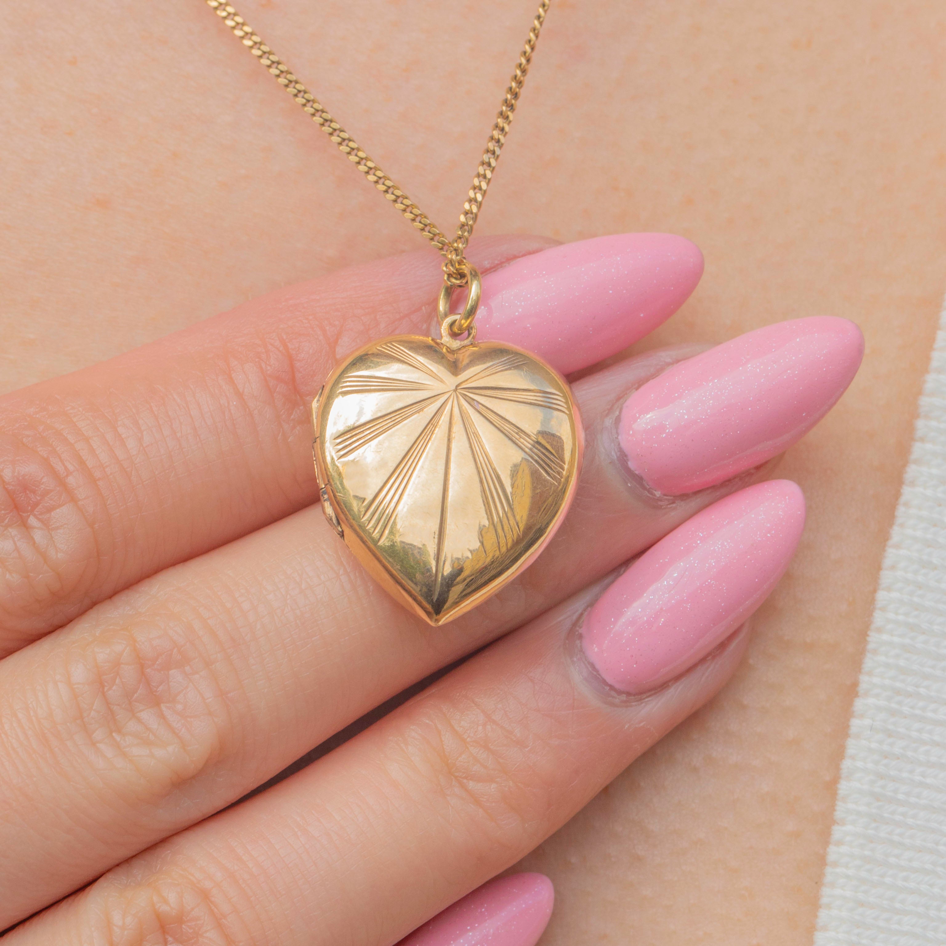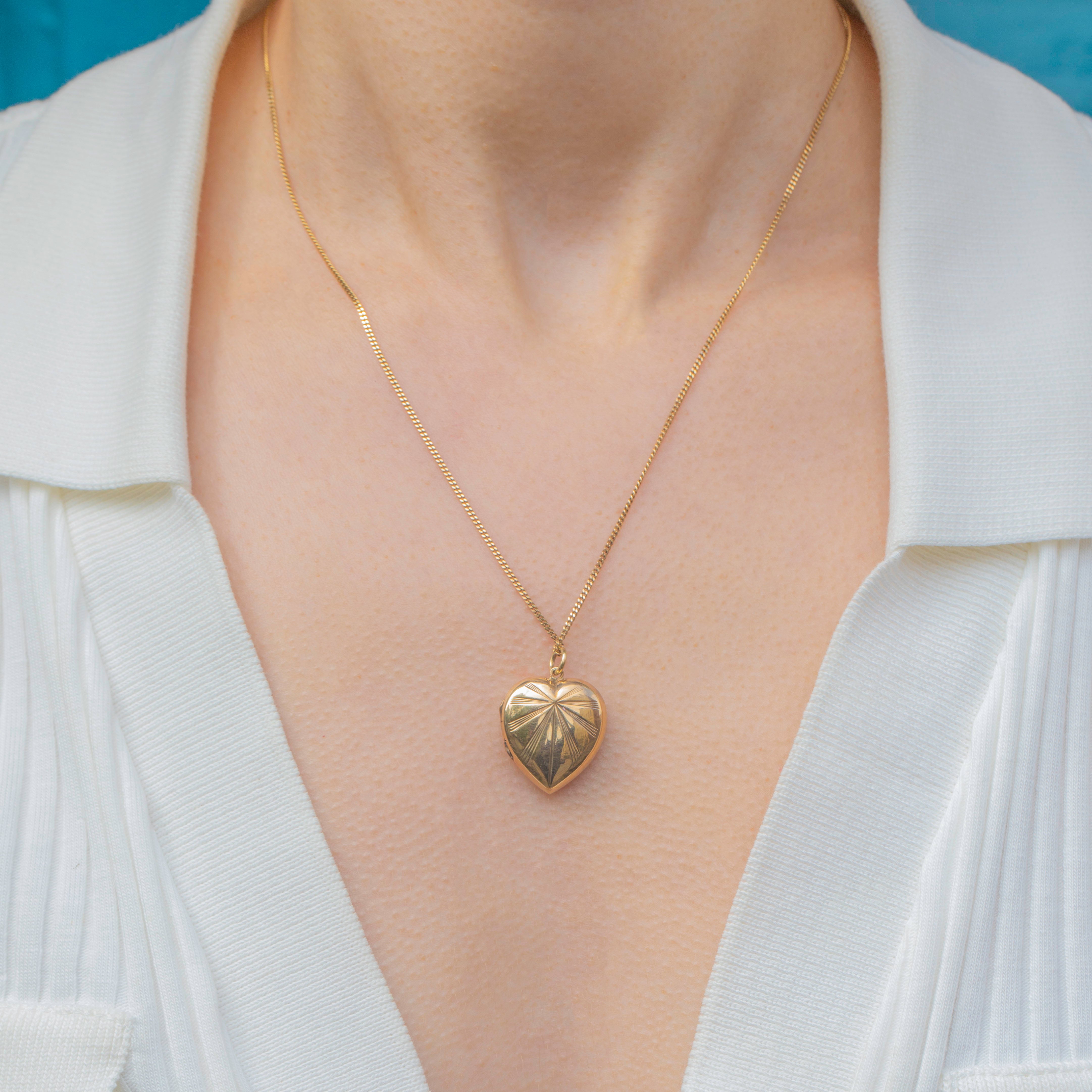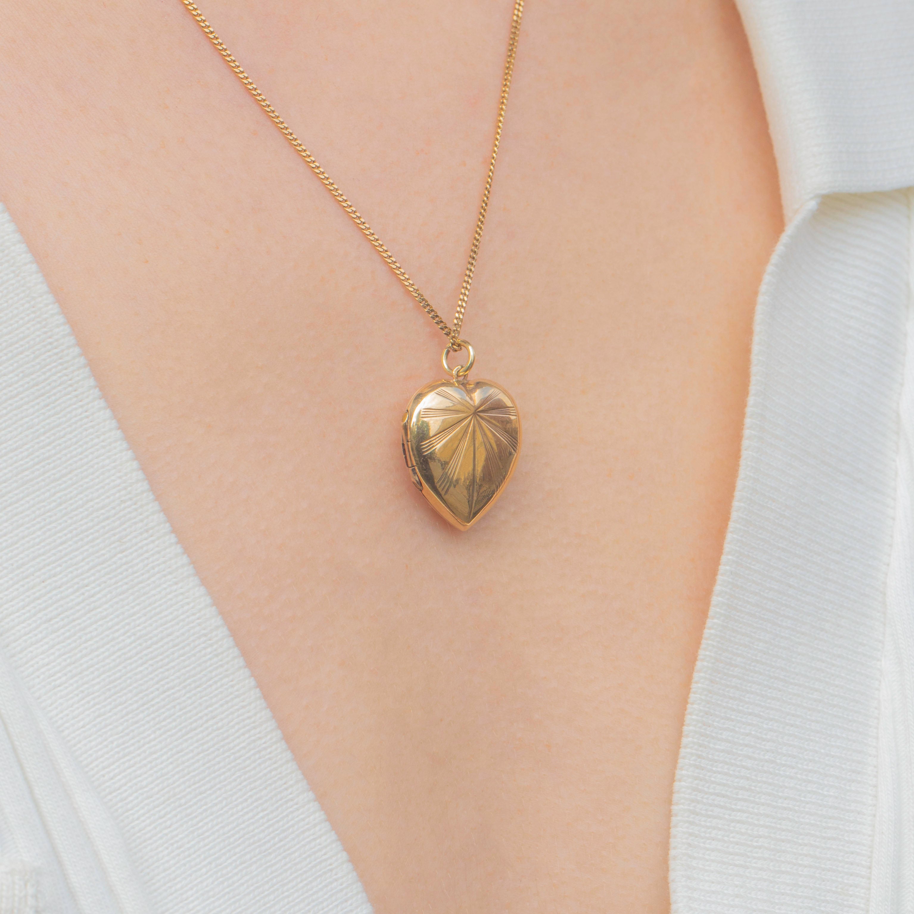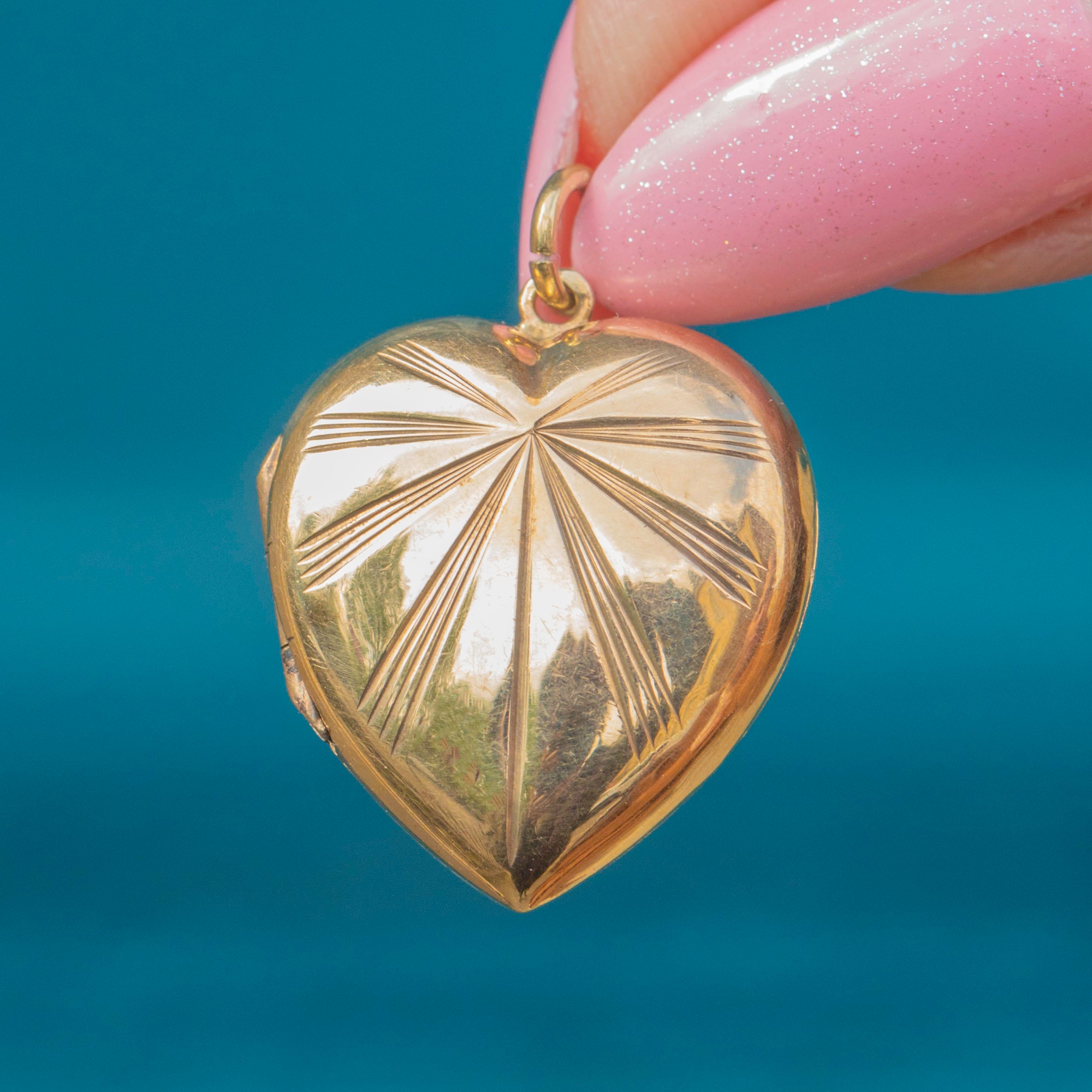 VERY GOOD: This Art Deco 9ct Gold sunburst heart locket is in very good condition. The Gold has a glorious buttery hue and defined sunburst engraved details. There is some minor surface wear throughout, commensurate with age, but there are no major dings and the locket closes securely. A gorgeous piece for everyday wear, this Art Deco locket is set to become your new favourite piece!