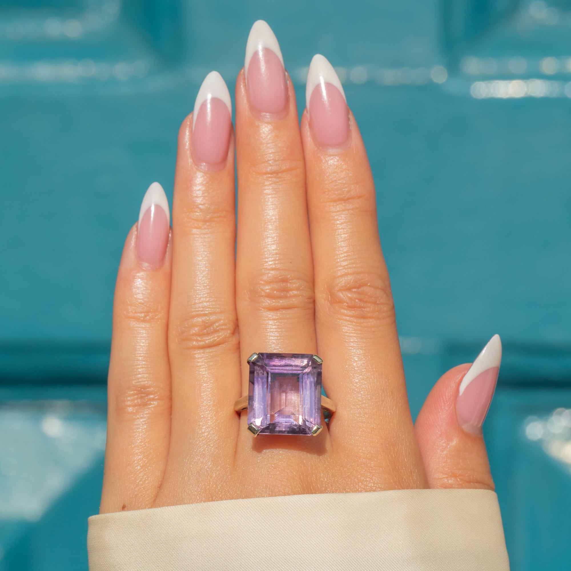 This striking Art Deco cocktail ring features a bold emerald-cut Amethyst measuring an impressive 15.7 x 14mm and weighing approximately 3.75cts. Its vibrant purple hue and precise geometric facets are perfectly complemented by the clean lines of the White 9ct Gold setting.