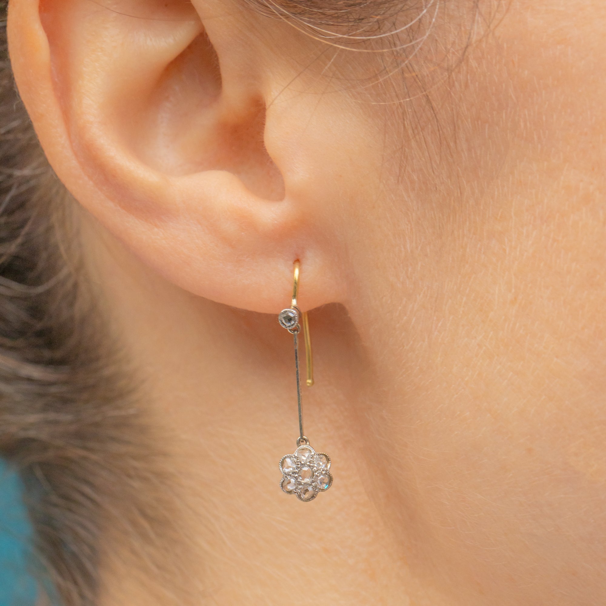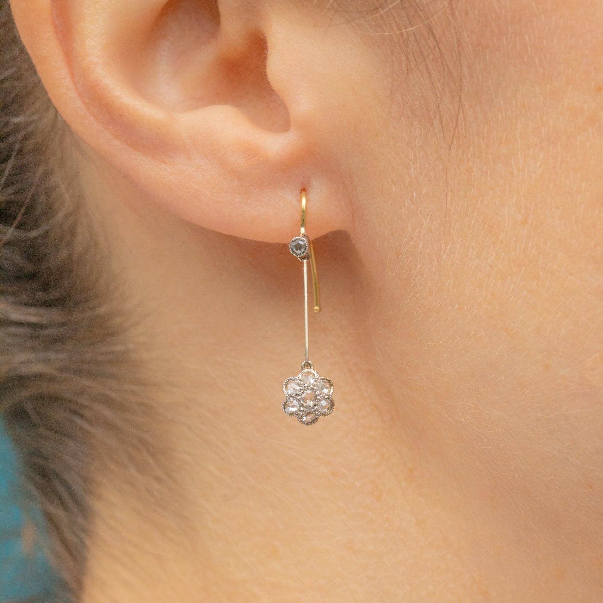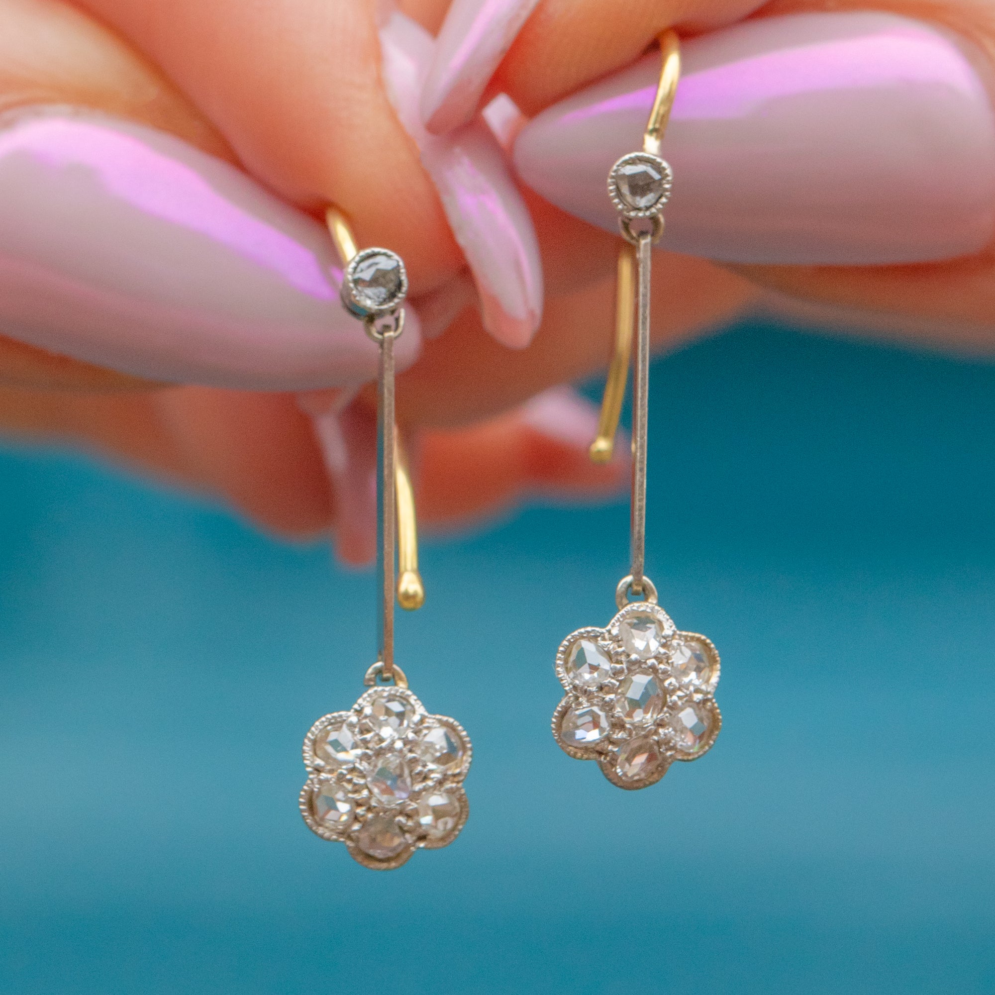 Elegant and refined, these Art Deco drop earrings are crafted in 9ct Gold with Platinum settings, each set with sparkling rose-cut Diamonds. The daisy-shaped tops shimmer beautifully, leading to delicate articulated drops that catch the light with every movement.