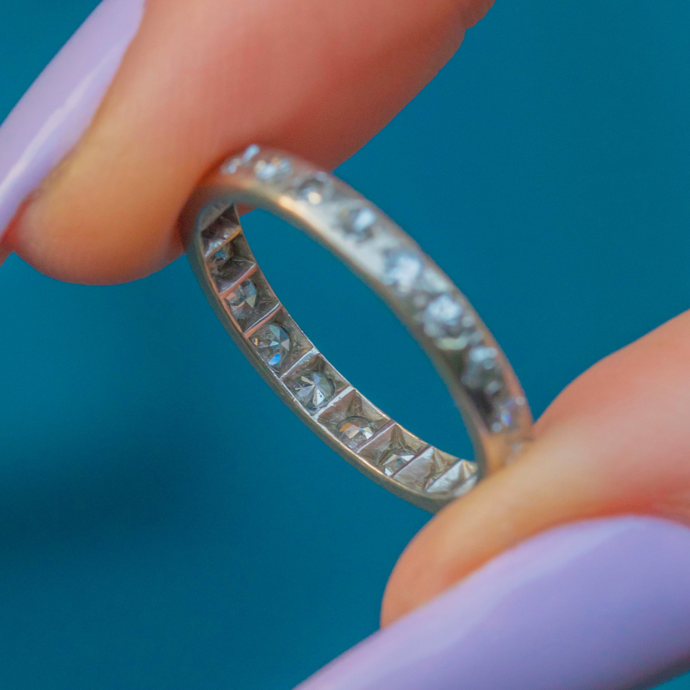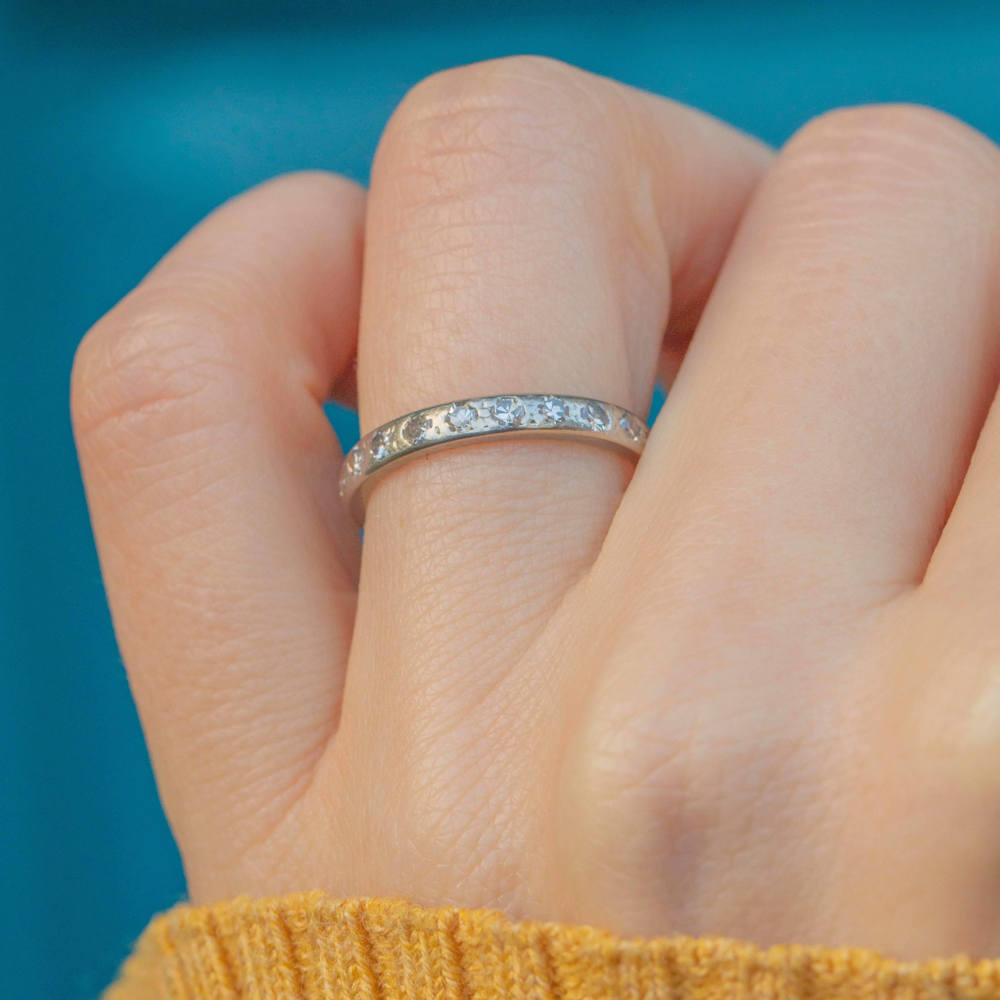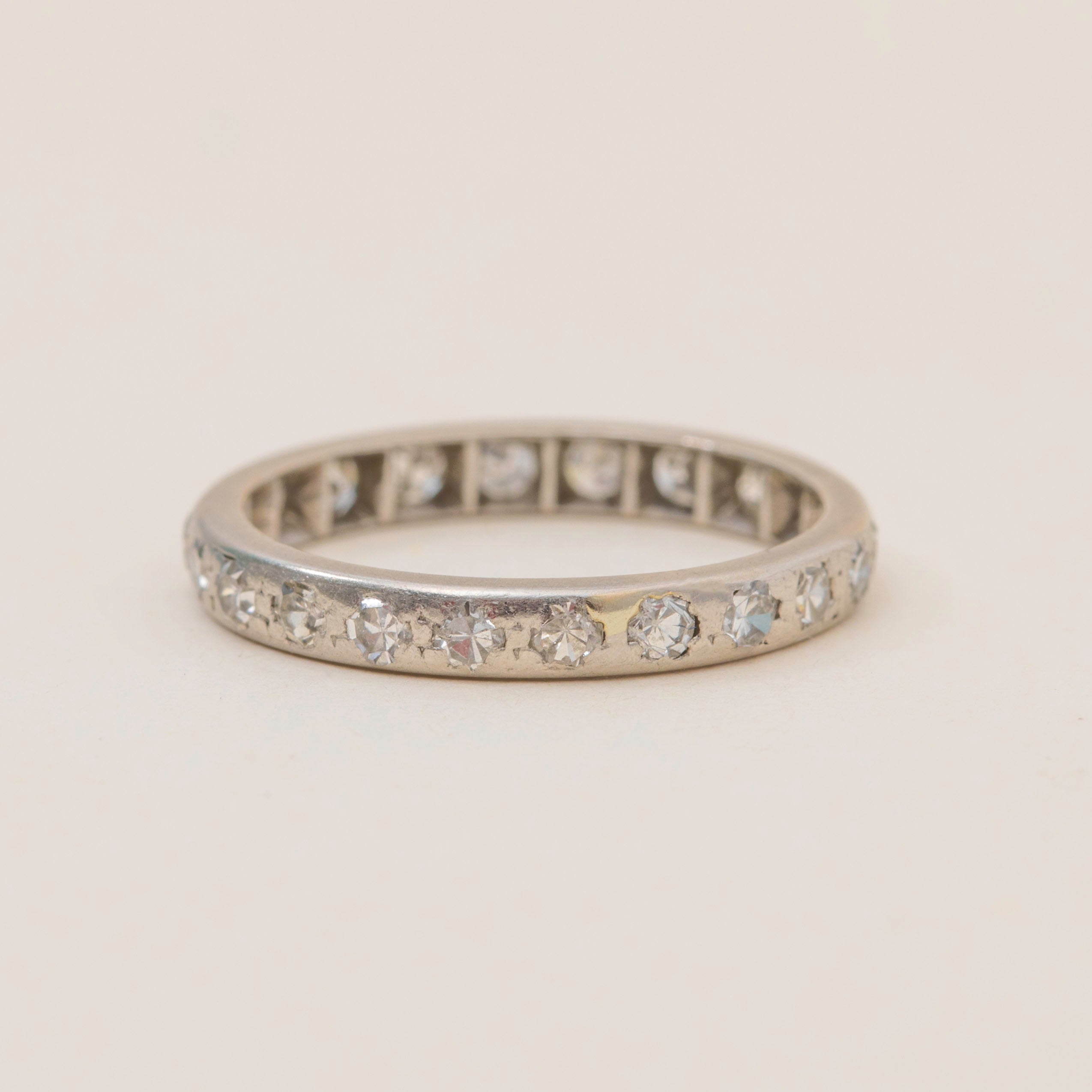 VERY GOOD. This Art Deco Platinum Diamond eternity ring is in very good condition. The Diamonds are secure within their settings providing a sparkling accent from every direction. A few of the stones have small nibbles and surface wear, commensurate with the ring's age, but this doesn't detract from her beauty and is only visible through a jeweller's loupe. The ring did once have engravings, and while these have worn down, she has retained every inch of her charm and splendour, and she will for decades to come!