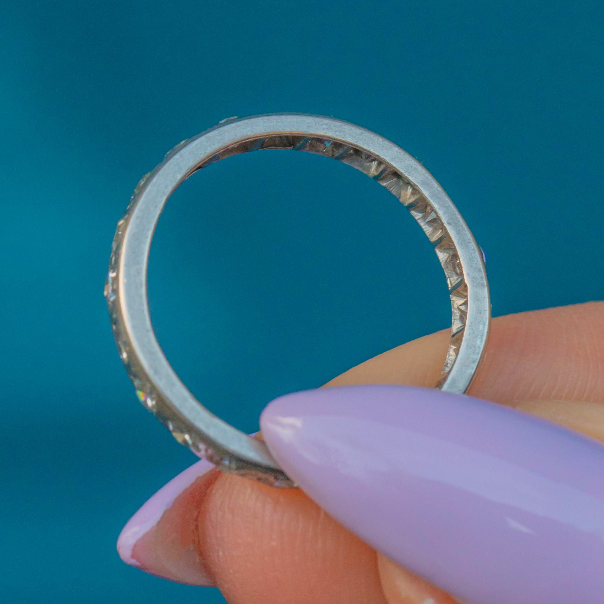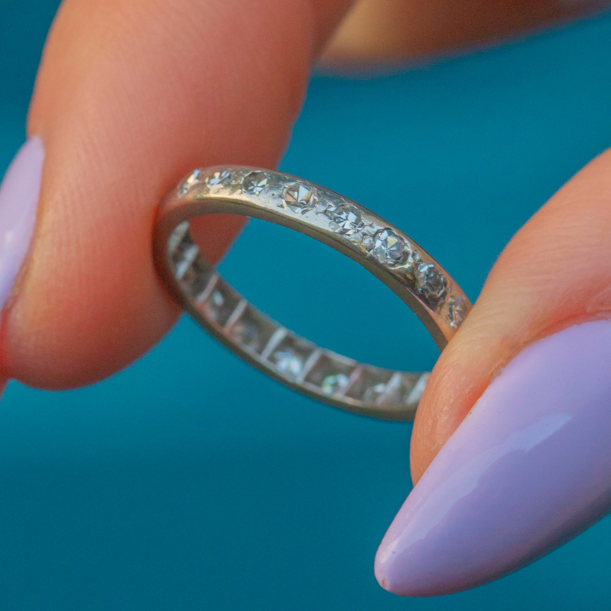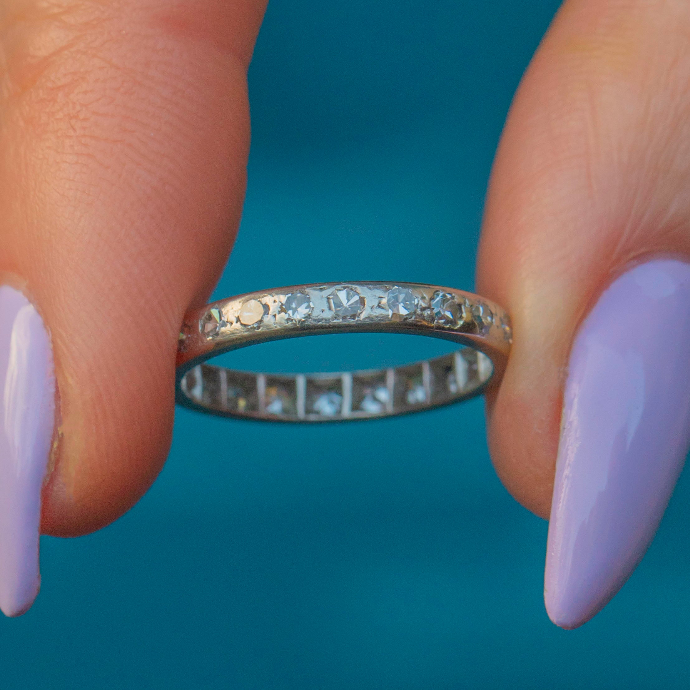 VERY GOOD. This Art Deco Platinum Diamond eternity ring is in very good condition. The Diamonds are secure within their settings providing a sparkling accent from every direction. A few of the stones have small nibbles and surface wear, commensurate with the ring's age, but this doesn't detract from her beauty and is only visible through a jeweller's loupe. The ring did once have engravings, and while these have worn down, she has retained every inch of her charm and splendour, and she will for decades to come!