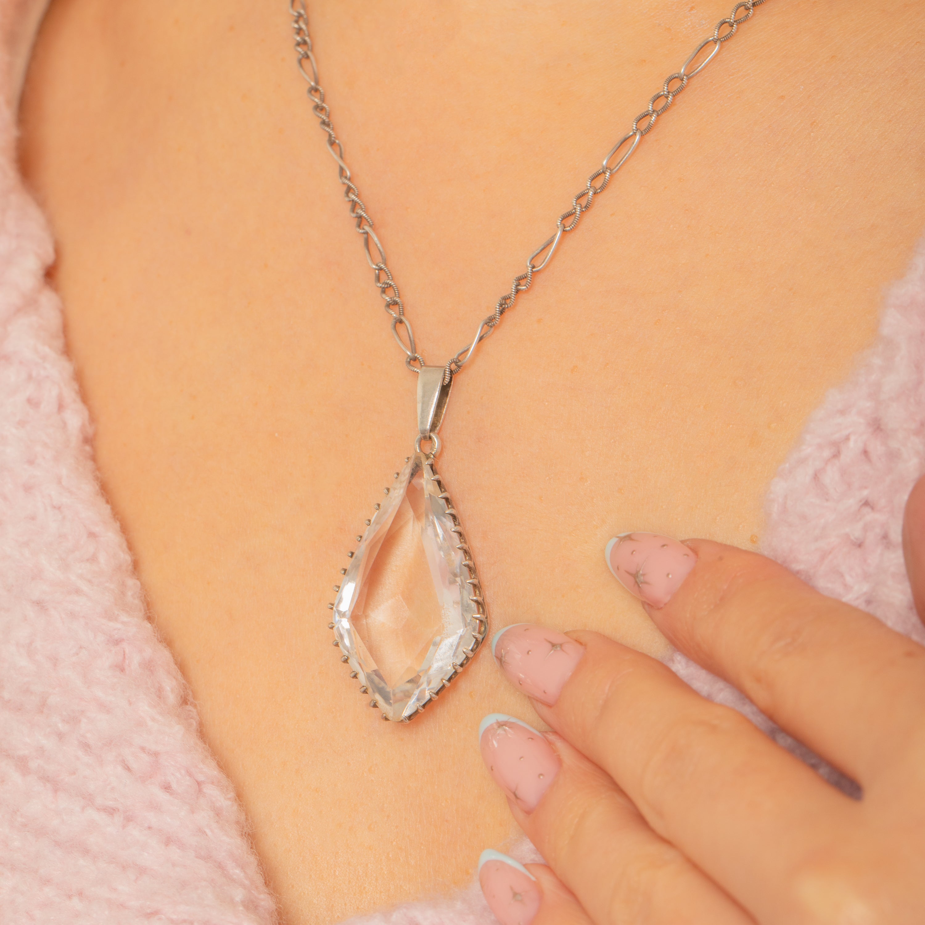 VERY GOOD: The Rock Crystal is bright with minor edge and facet abrasions commensurate with age, presenting lively sparkle. The Sterling Silver setting is secure with even teeth and a gentle antique patina; the chain and clasp are in good order with light surface wear from use. No visible repairs.