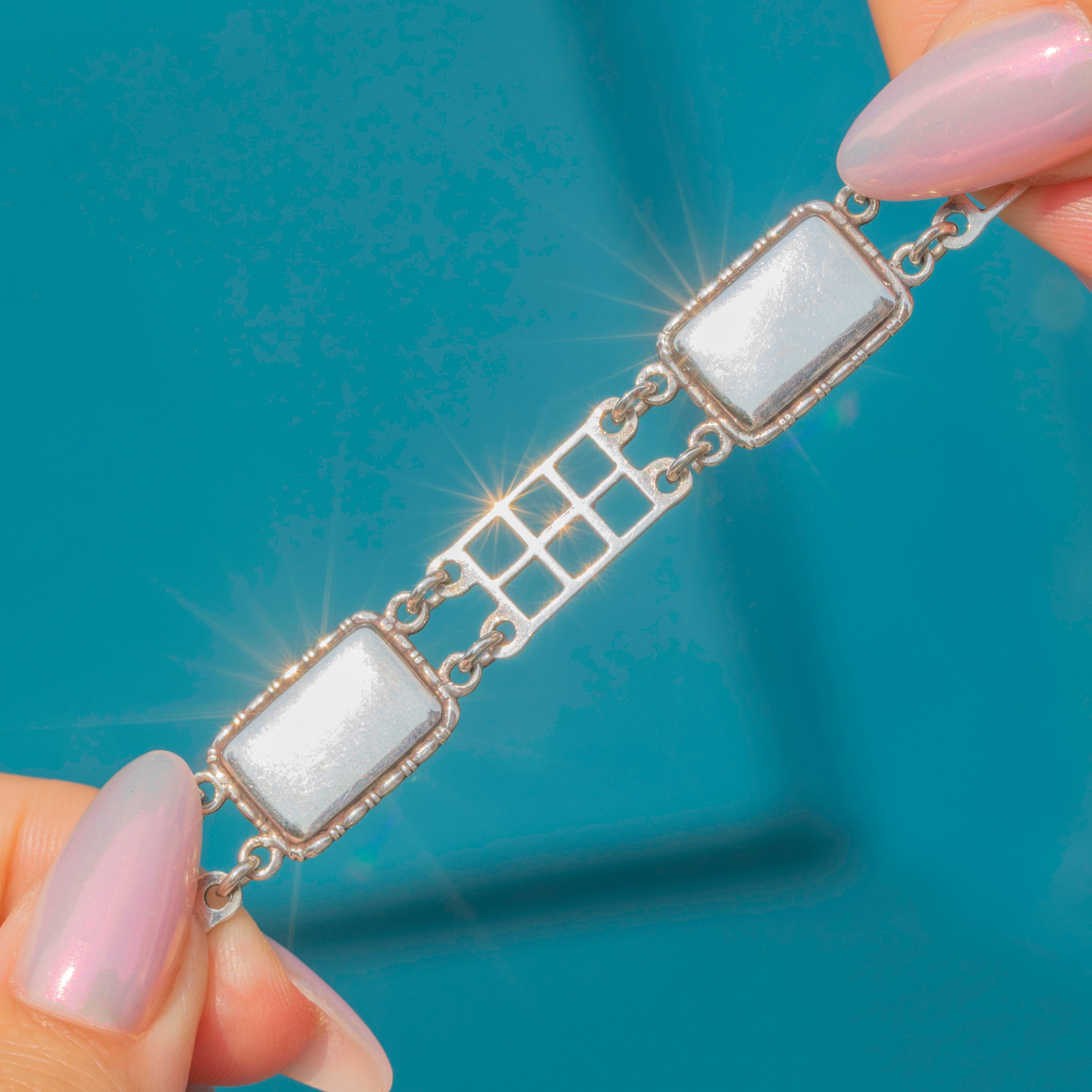 She is crafted from lustrous Sterling Silver and complete with Art Deco style square links which provide a lovely fluid movement as she adorns your wrist. This antique bracelet is a wonderful example of the character and glamour that Art Deco jewellery boasts, and is sure to liven up any outfit!