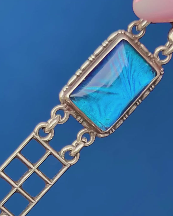 Featuring four resplendent Morpho butterfly wing links, each with a distinct vibrant azure hue with flashes of royal blue hue and a glamorous sheen, this bracelet will easily capture attention and delight.