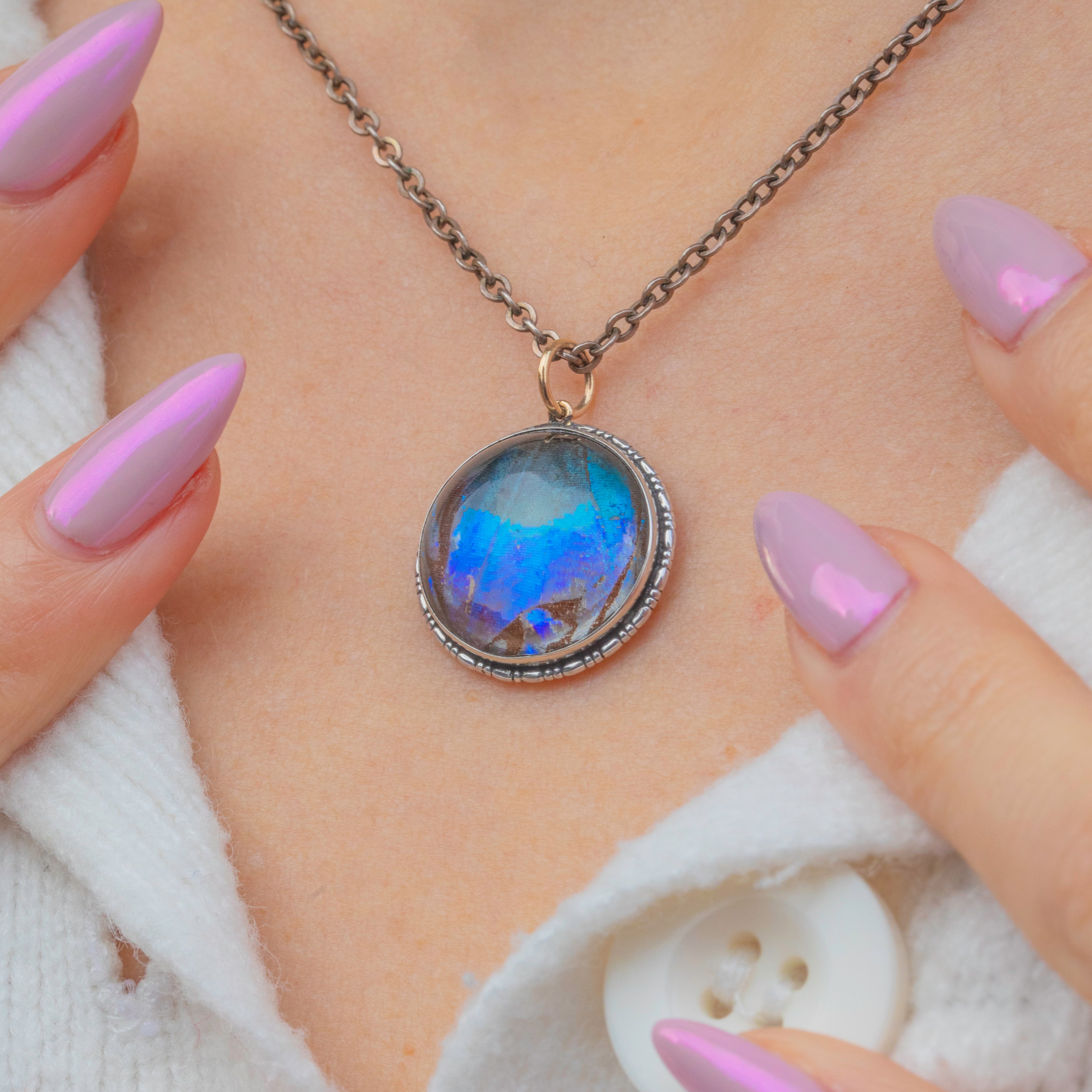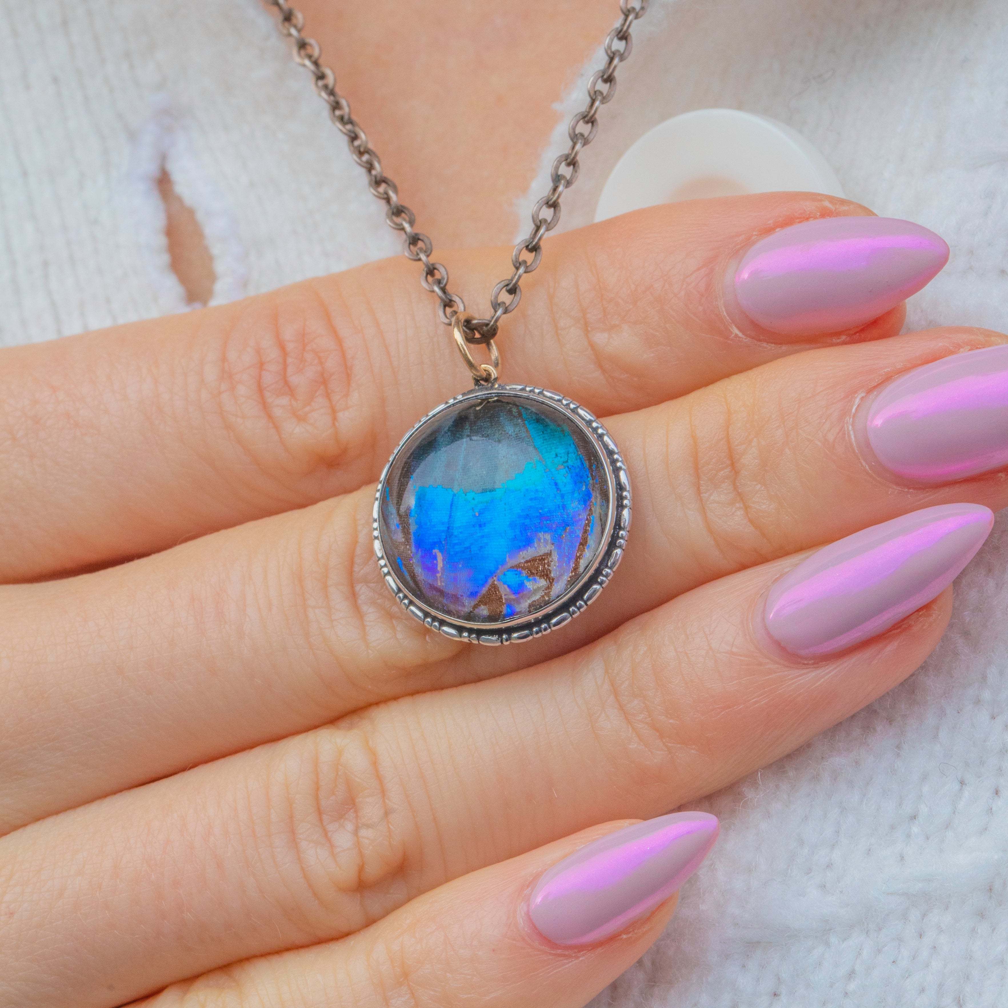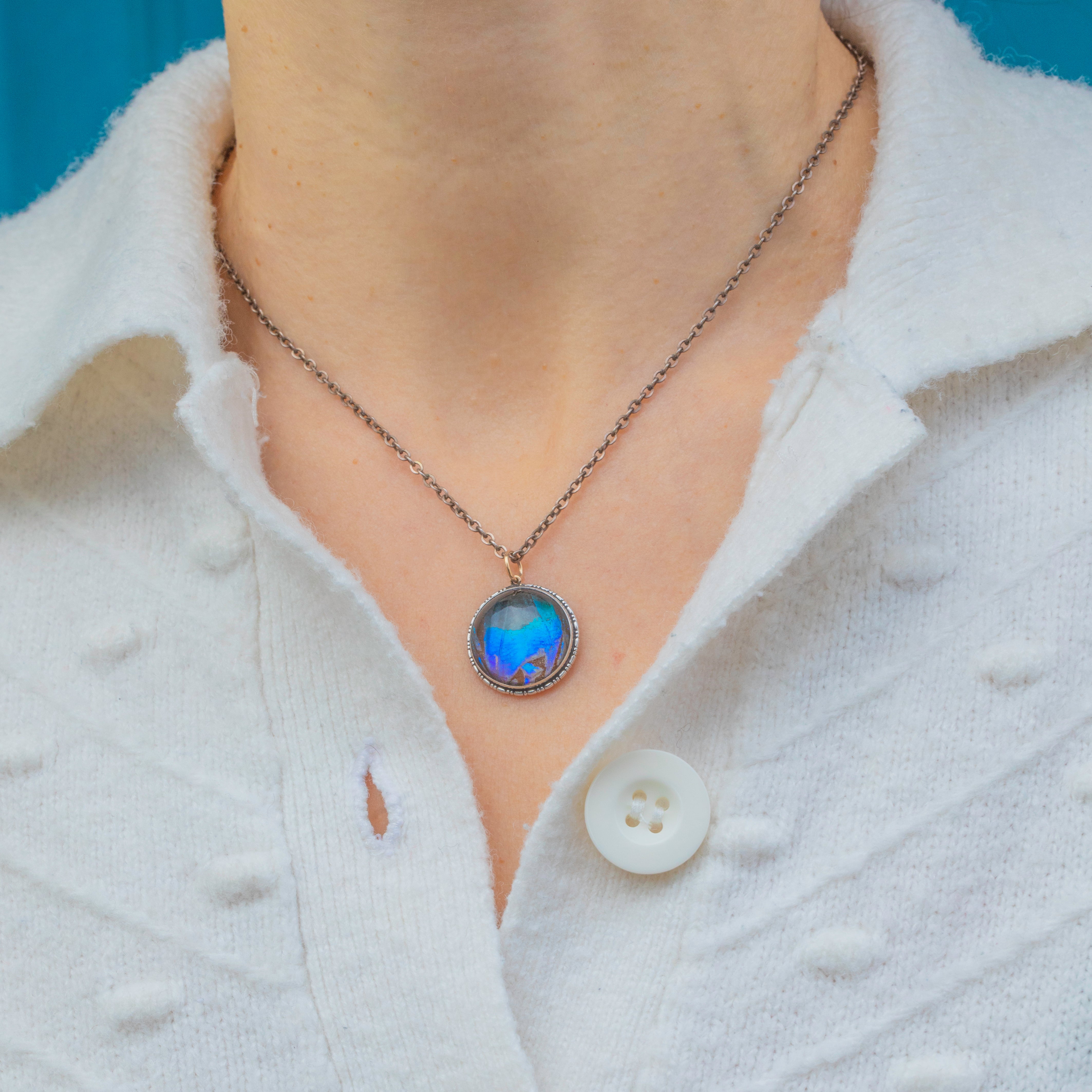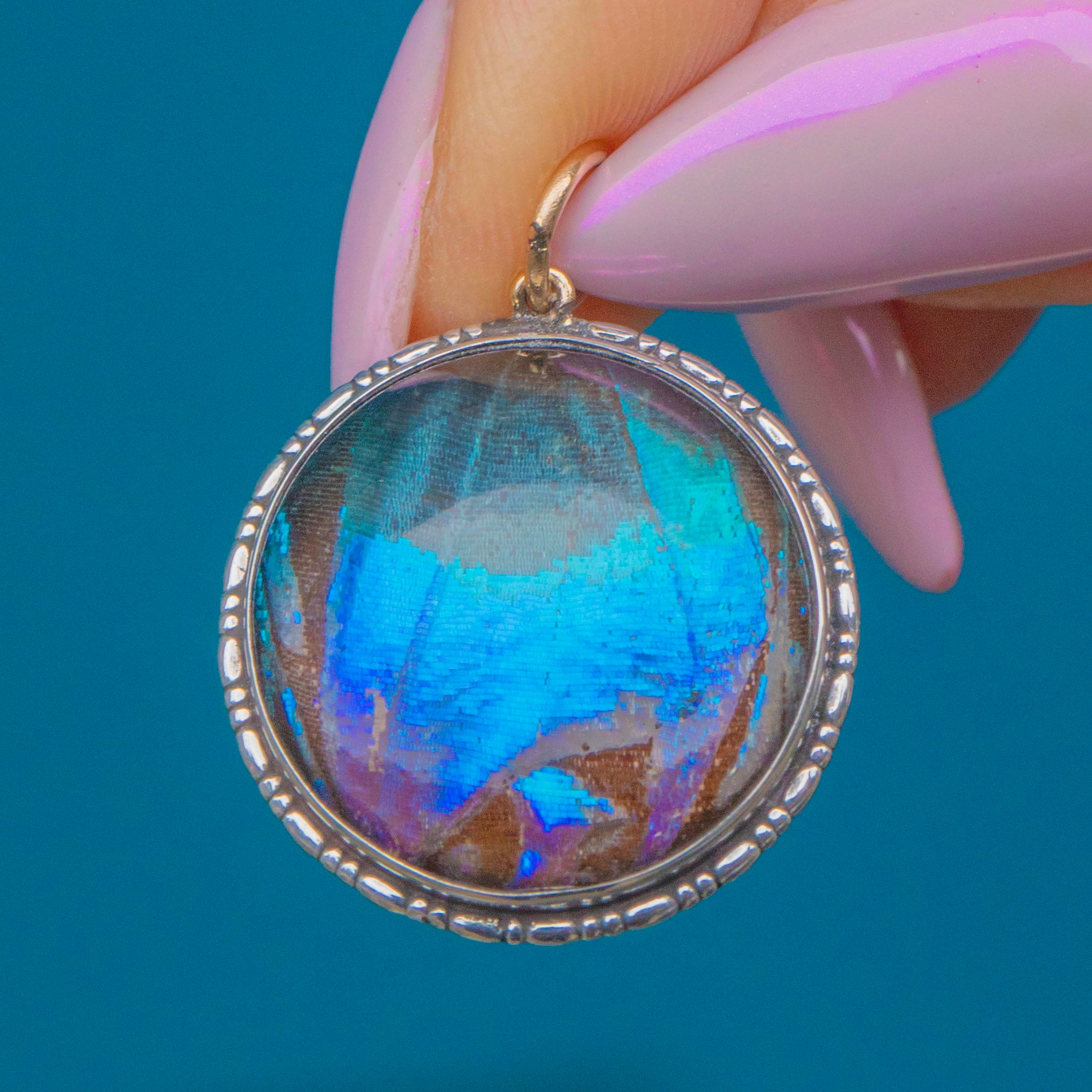 A beautiful Art Deco round pendant featuring an iridescent Morpho butterfly wing, radiating the enchanting blue-green hues typical of these early 20th-century designs. The colours shift with the light, creating a magical glow that made butterfly wing jewellery so popular during the 1920s and 1930s.