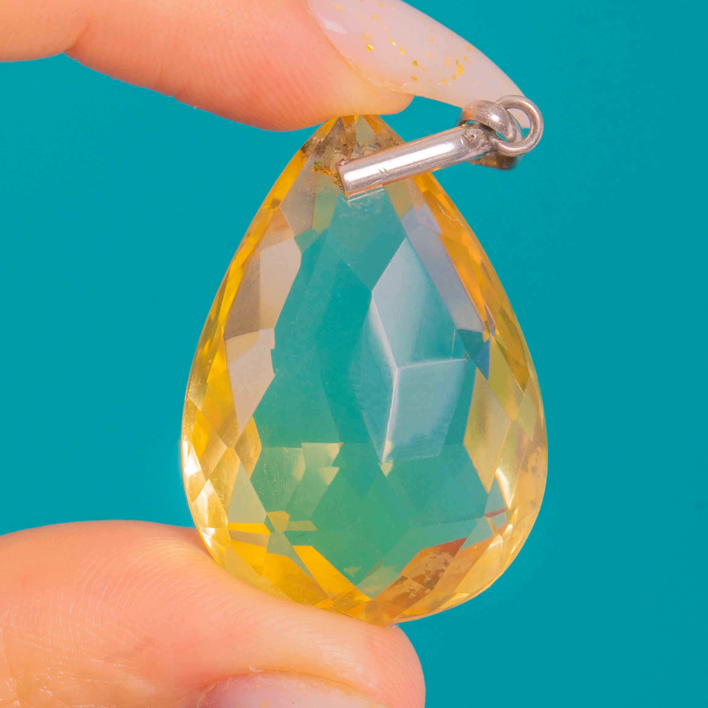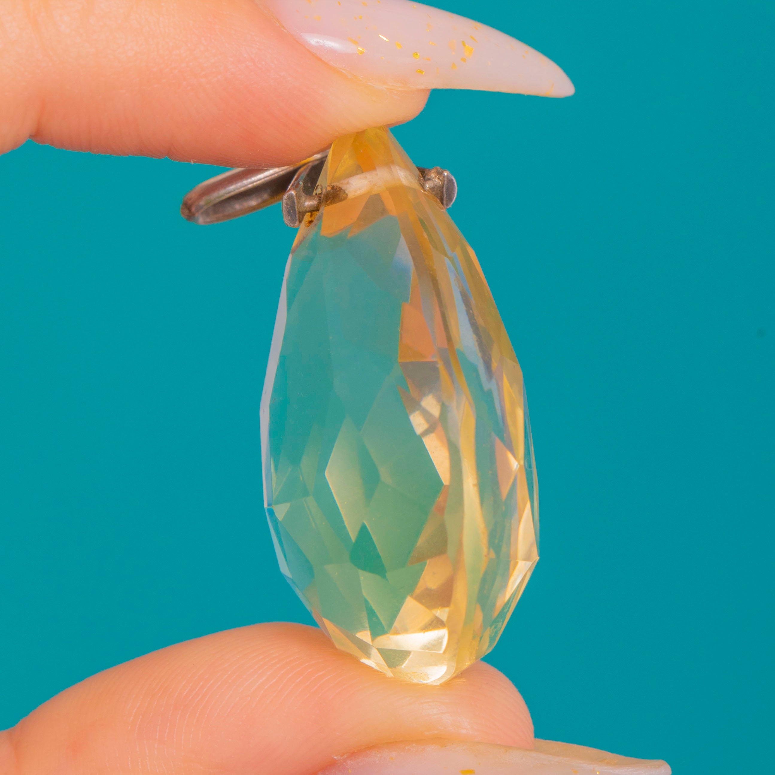 EXCELLENT: The Citrine is bright and lively with light facet-edge abrasions, minor wear around the drilled apex and a minute inclusion or tiny nibble near the point, visible only on close inspection. The Silver bail shows slight surface marks and faint patina commensurate with age, and remains secure and sturdy.