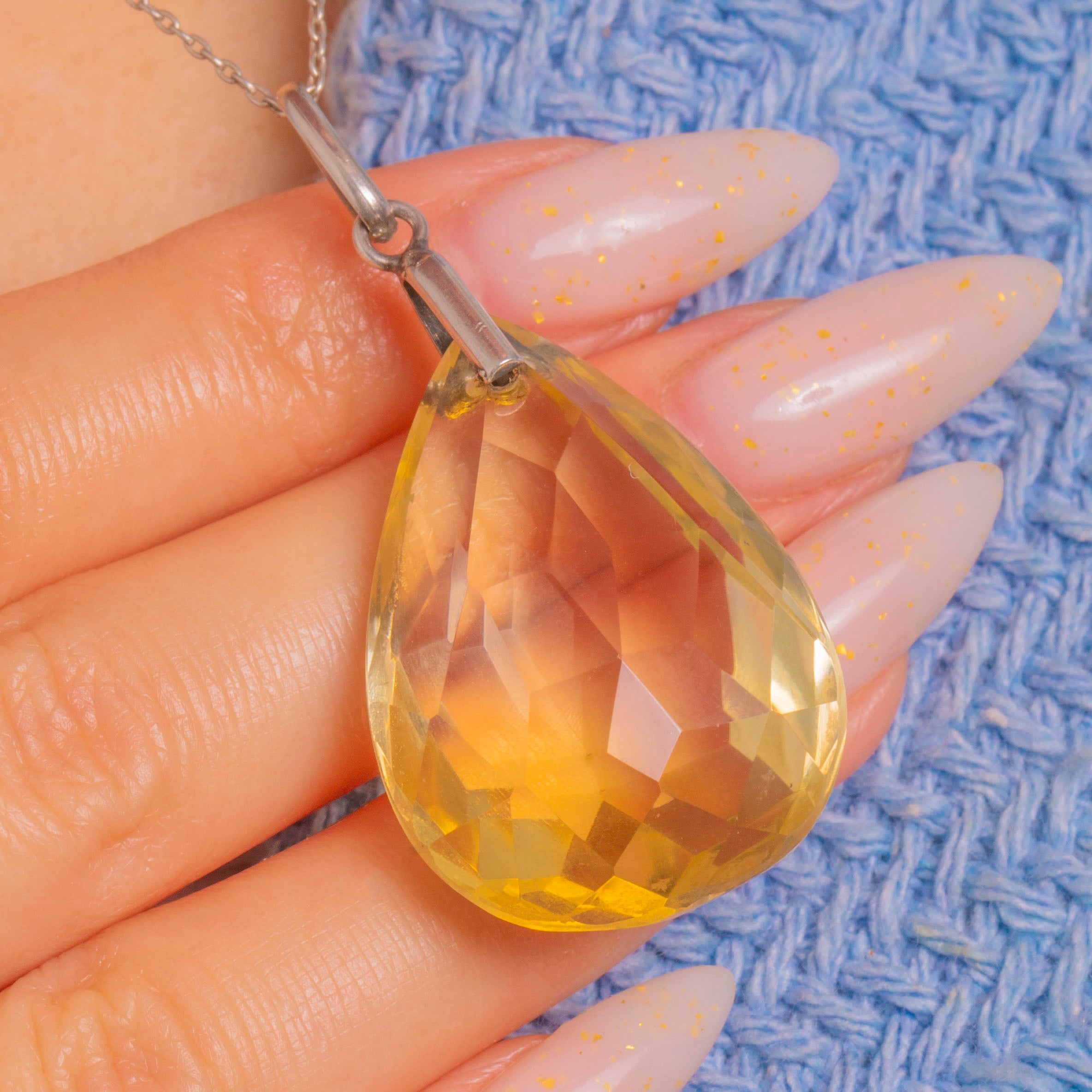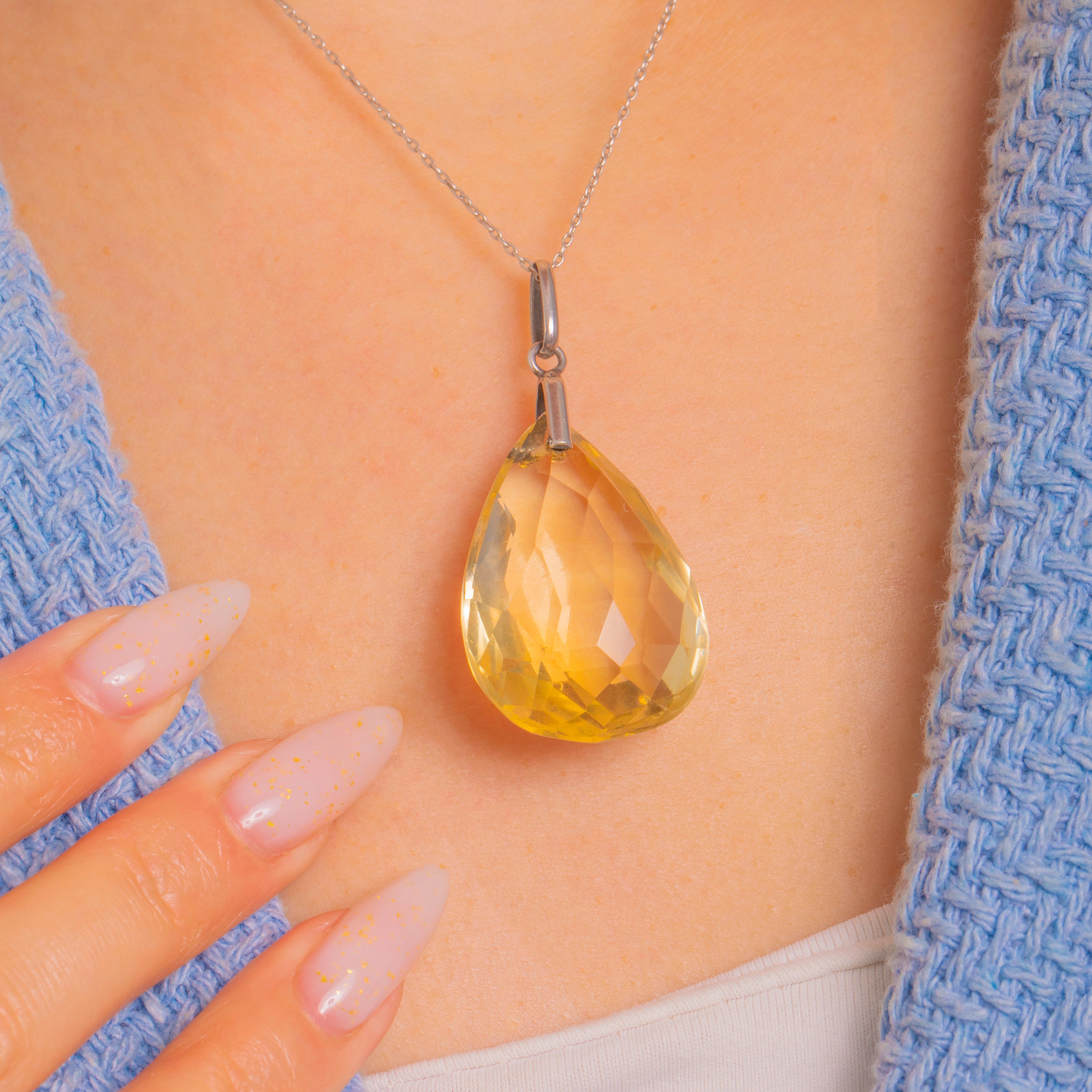 A sleek Art Deco treasure, this Silver pendant showcases a gloriously scaled 40.00ct Citrine pear drop, its crisp, uniform facets cascading with sunlit fire. The pale golden-yellow gem is beautifully open and unbacked, allowing light to dance through every plane for a luminous, refreshing glow.