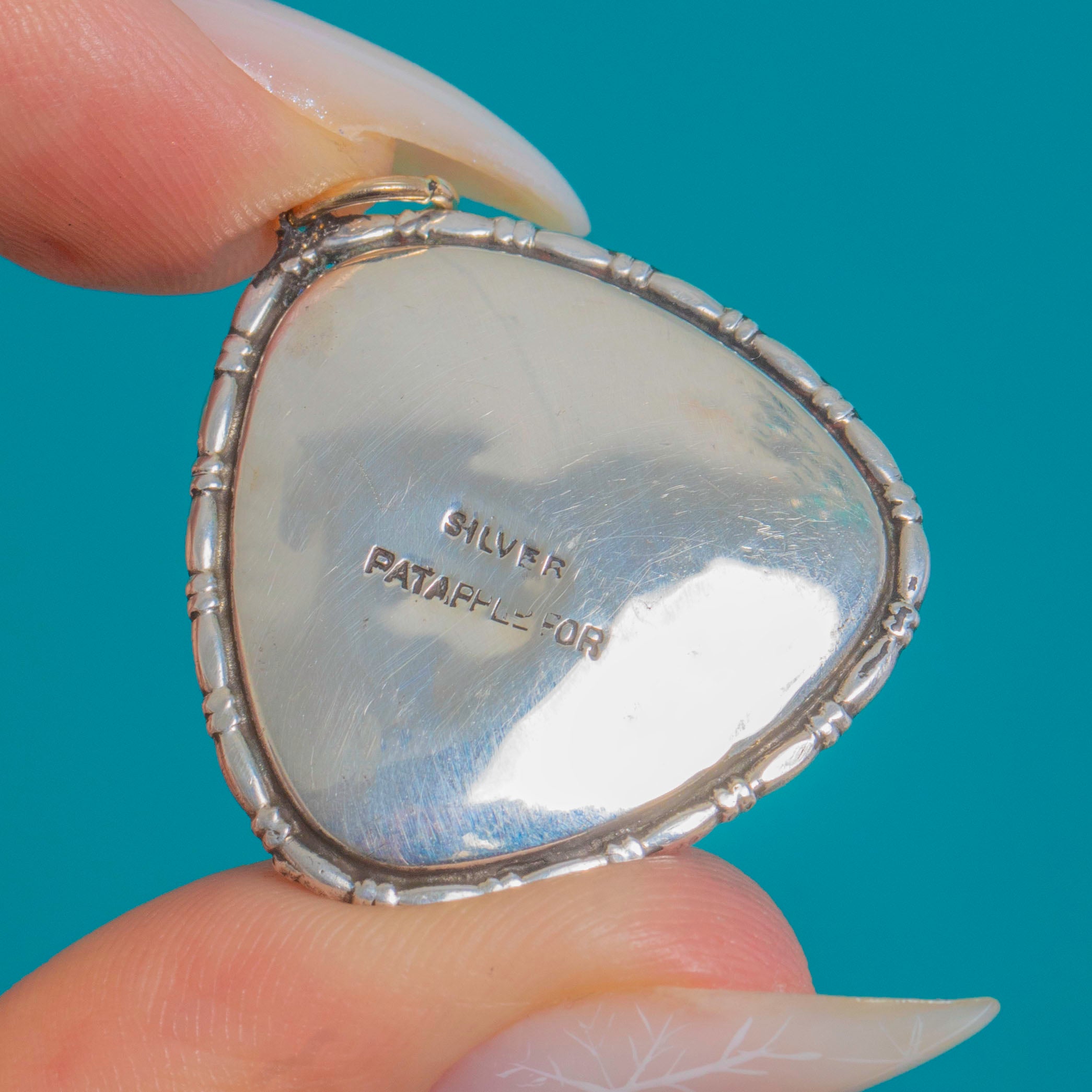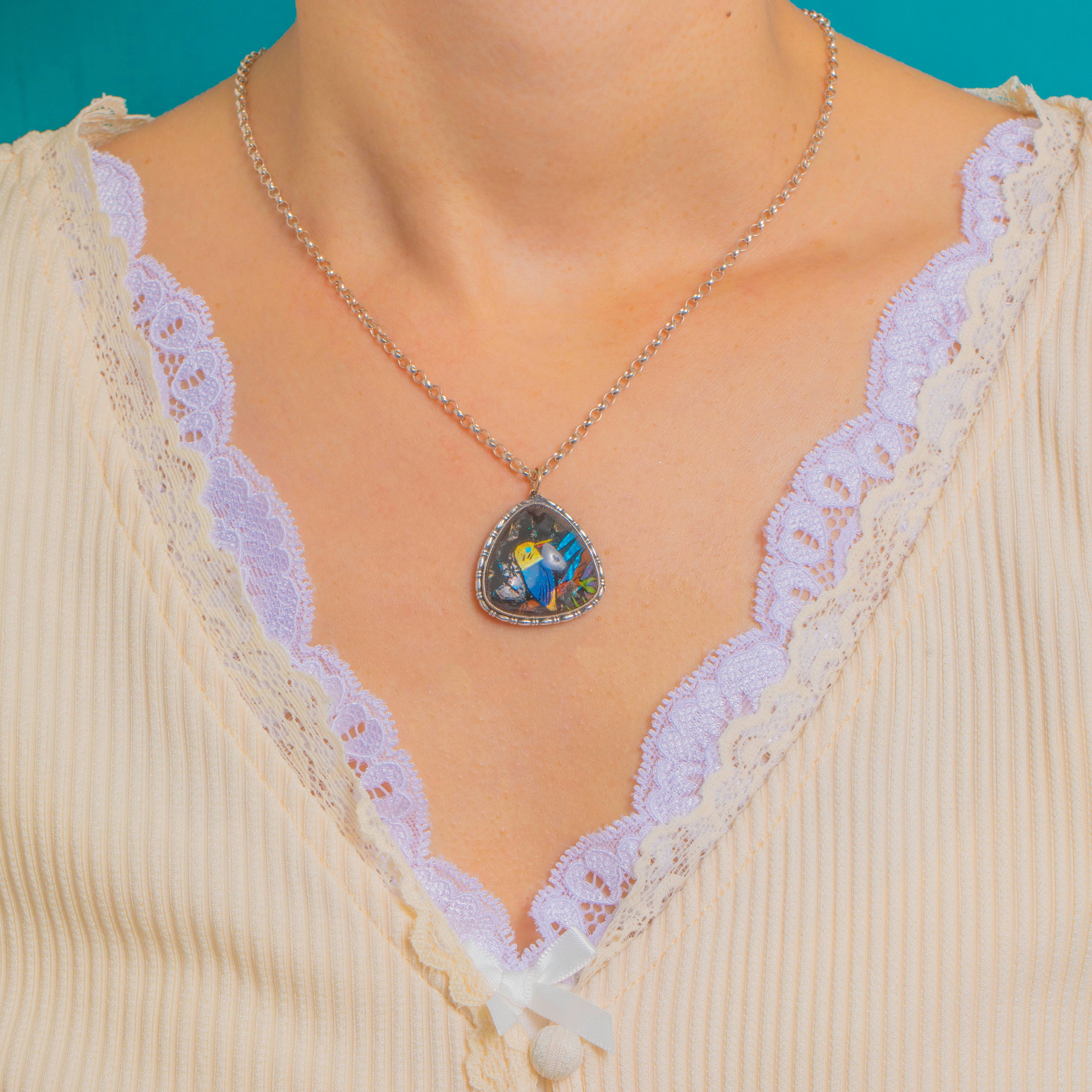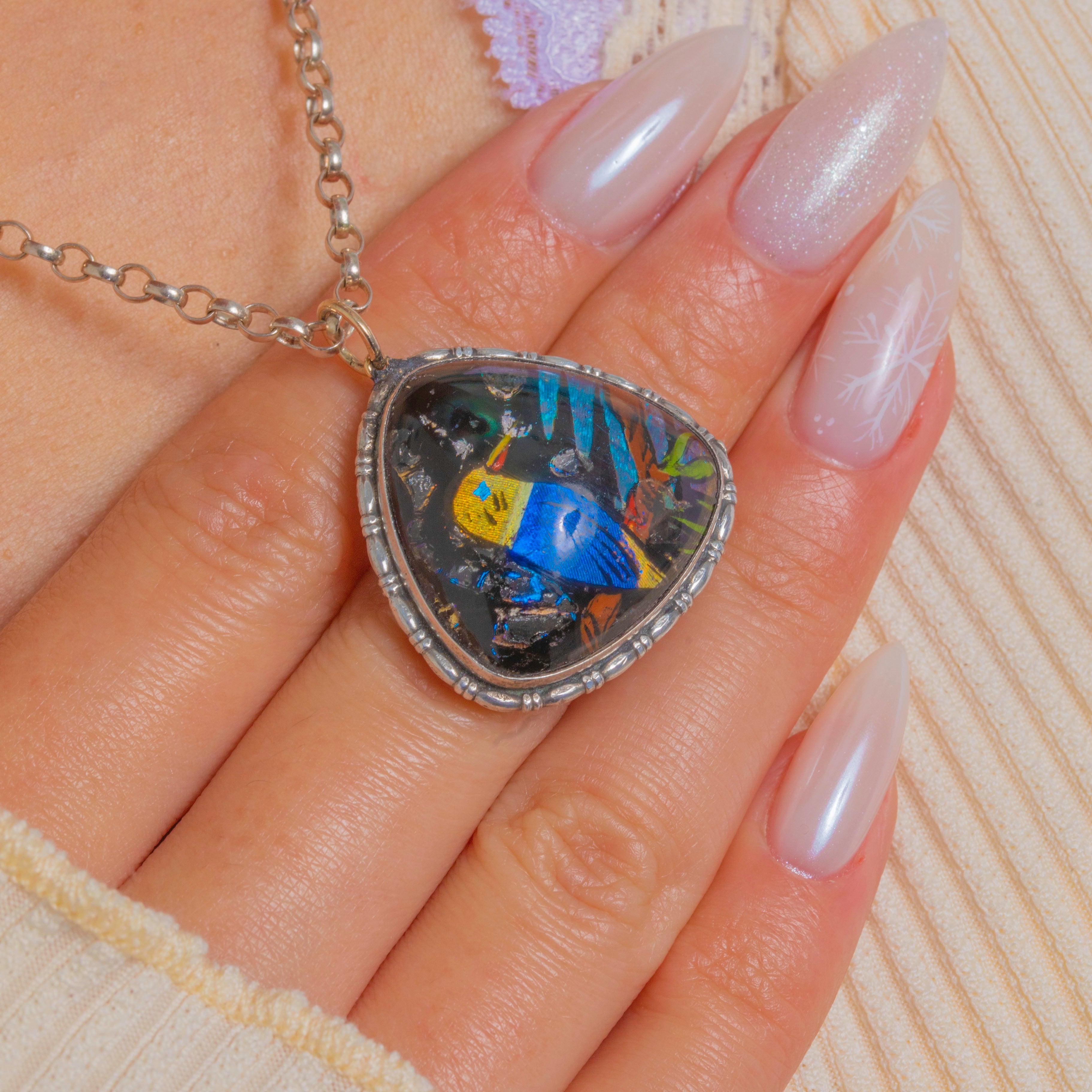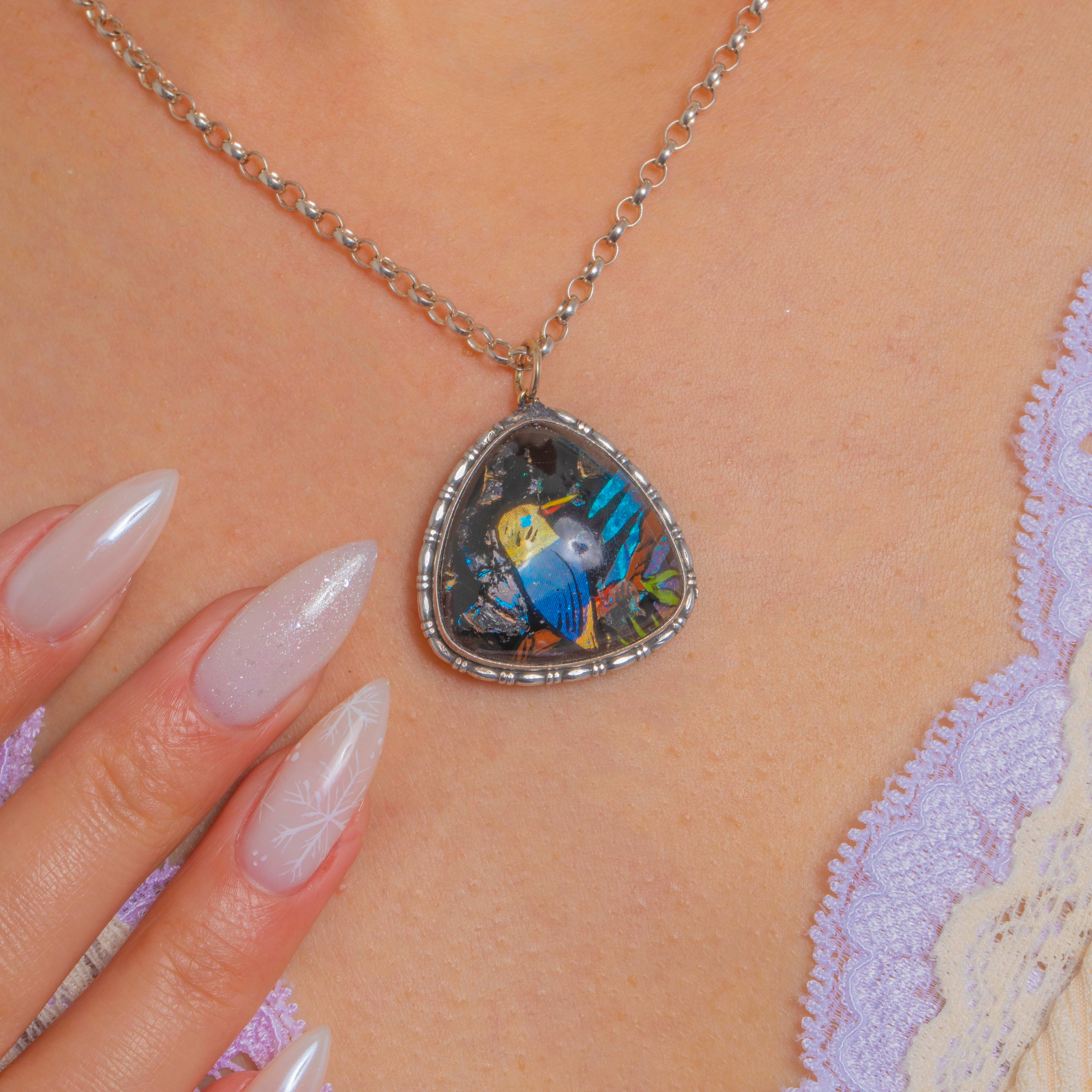 A vibrant Art Deco butterfly wing pendant, its rounded triangular silhouette framing a vivid bird motif that shimmers with tropical blues, teals and golden accents. The scene sits beneath a domed resin cover, all bordered by a pretty beaded Silver bezel for a softly sculpted finish.