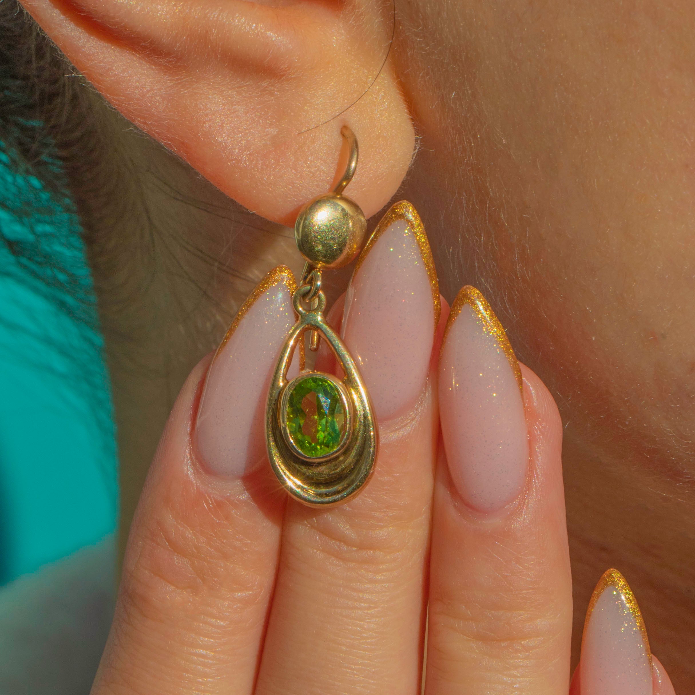 These dreamy Art Nouveau drop earrings are all about movement, line and luminous colour. Crafted in rich 14ct Gold, each earring features an open teardrop frame that curves gracefully around a vivid green Peridot, creating that soft, organic silhouette the era is so loved for.