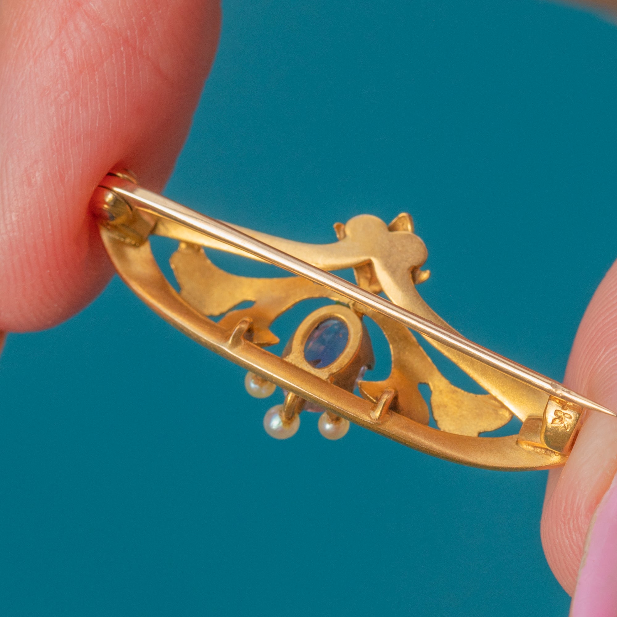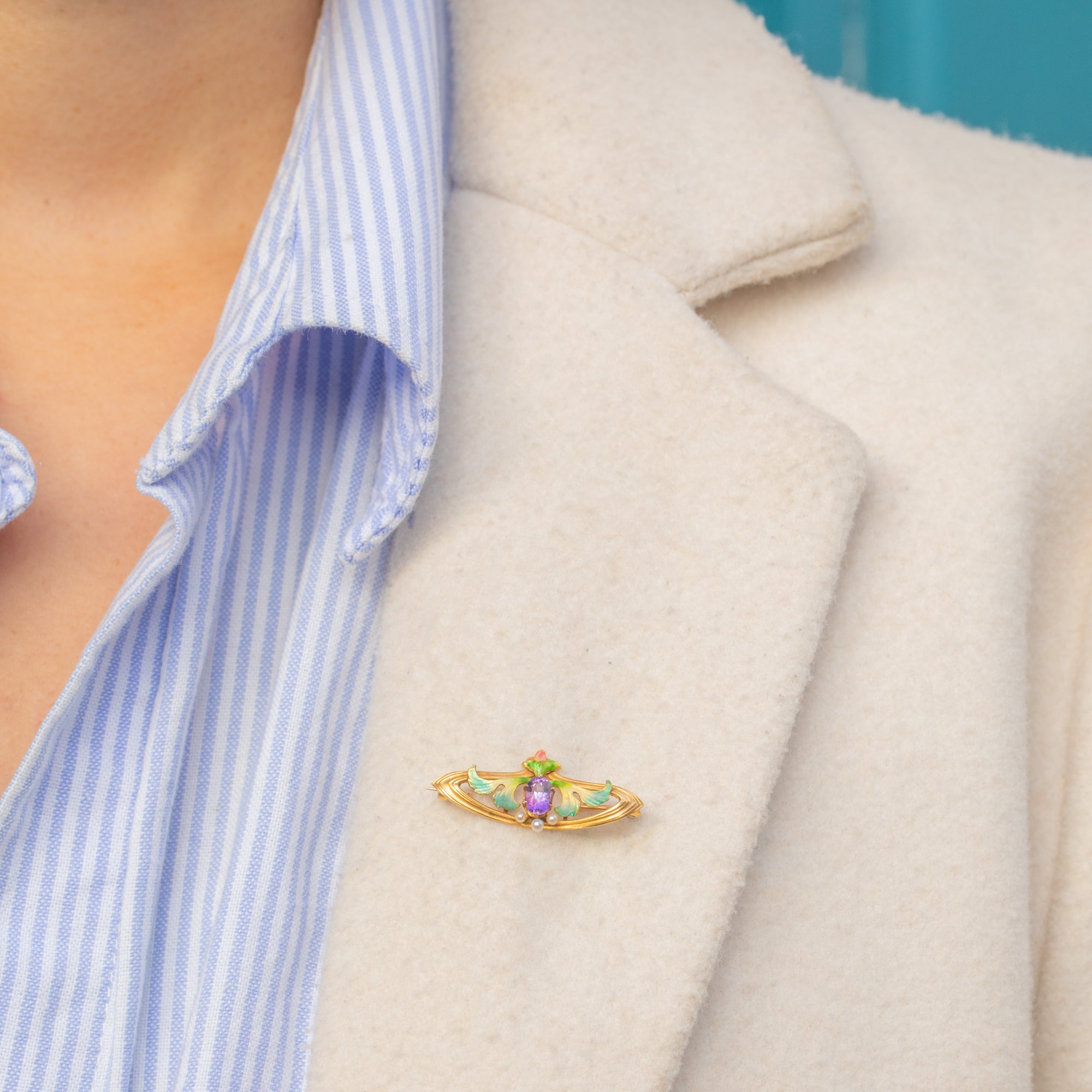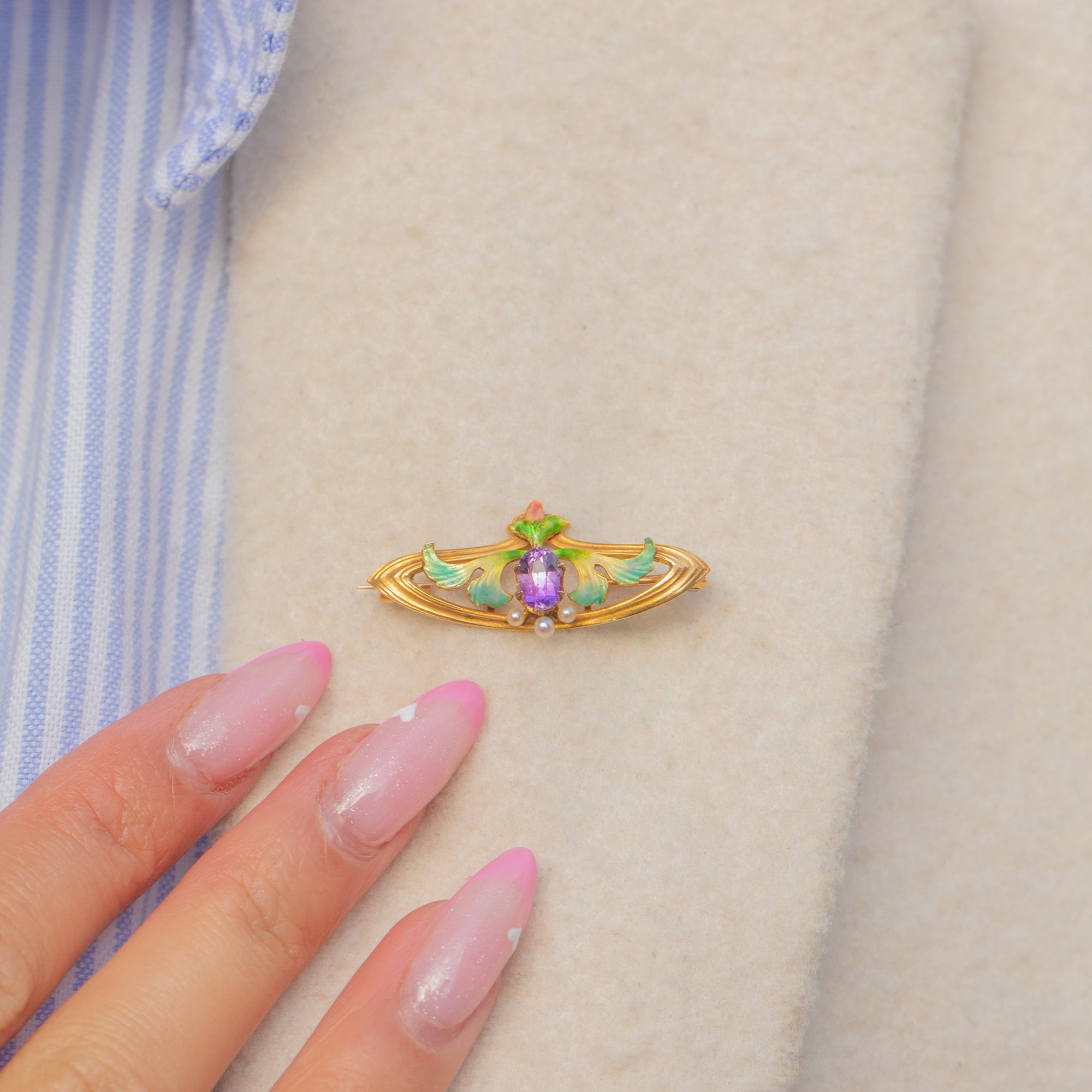 Art Nouveau 18ct Gold Amethyst Pearl Enamel Brooch